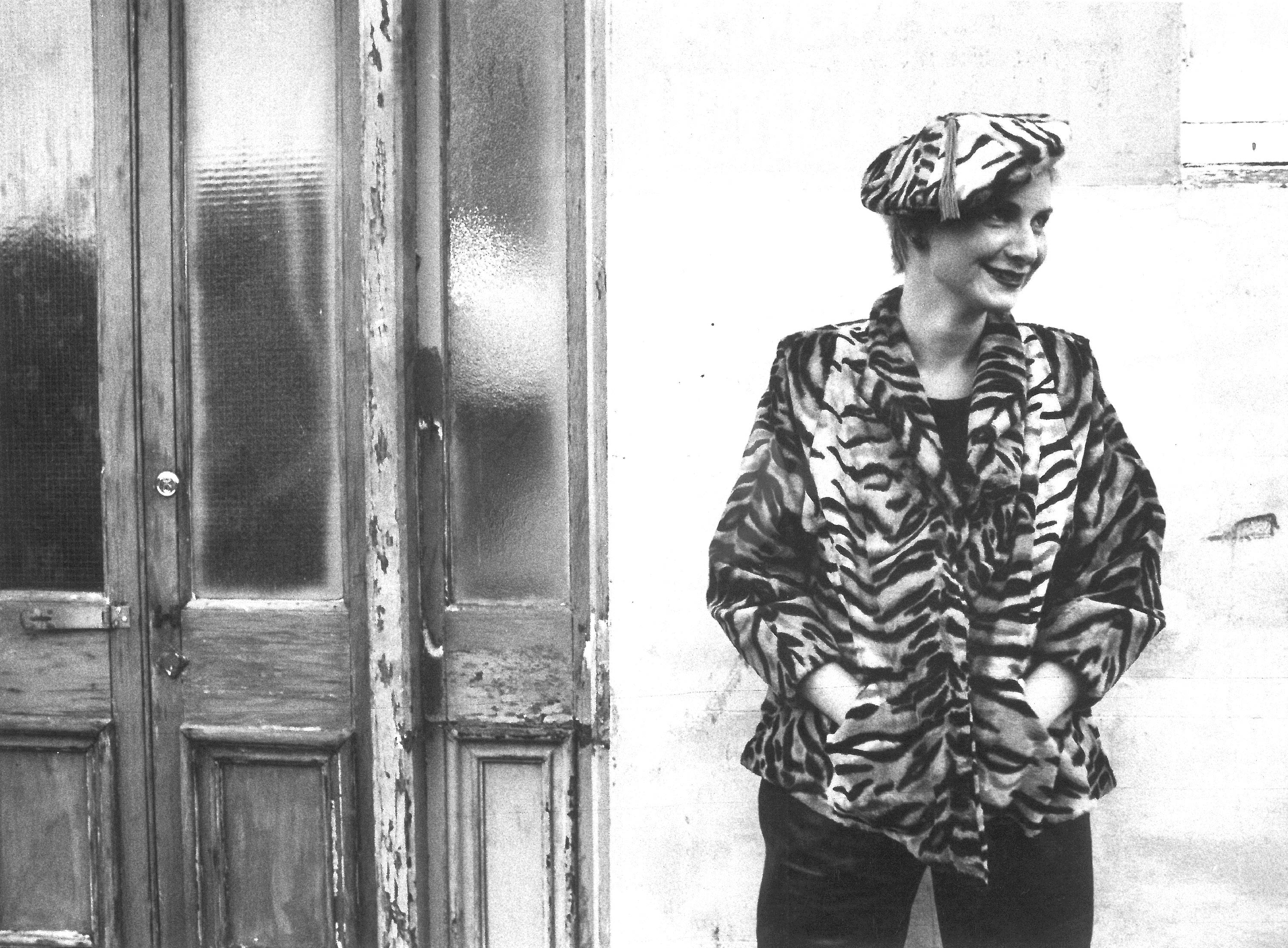 Daphne Mitten frequented a leather warehouse opposite the Cook Street Market where she found skins for bespoke leather jeans with eyelet punched decoration/ventilation.