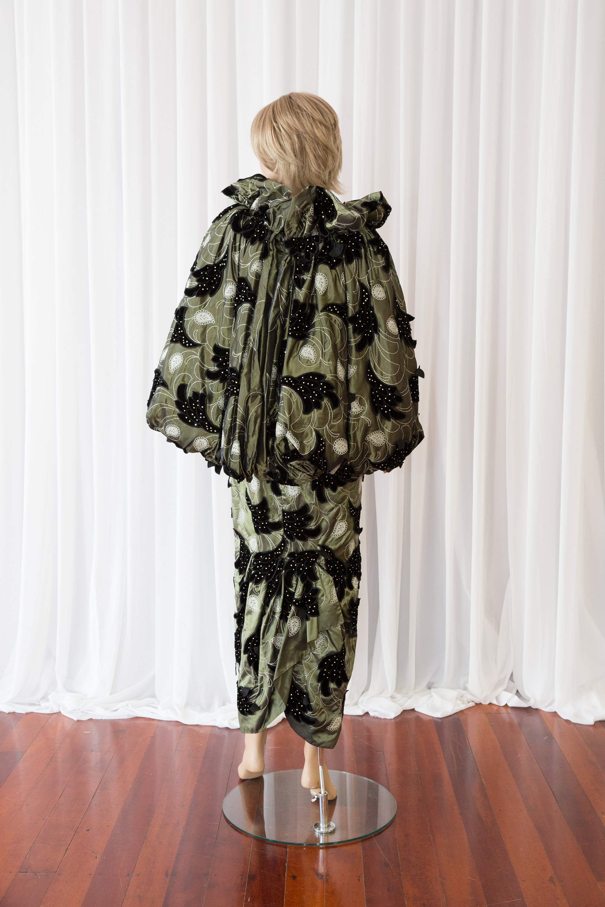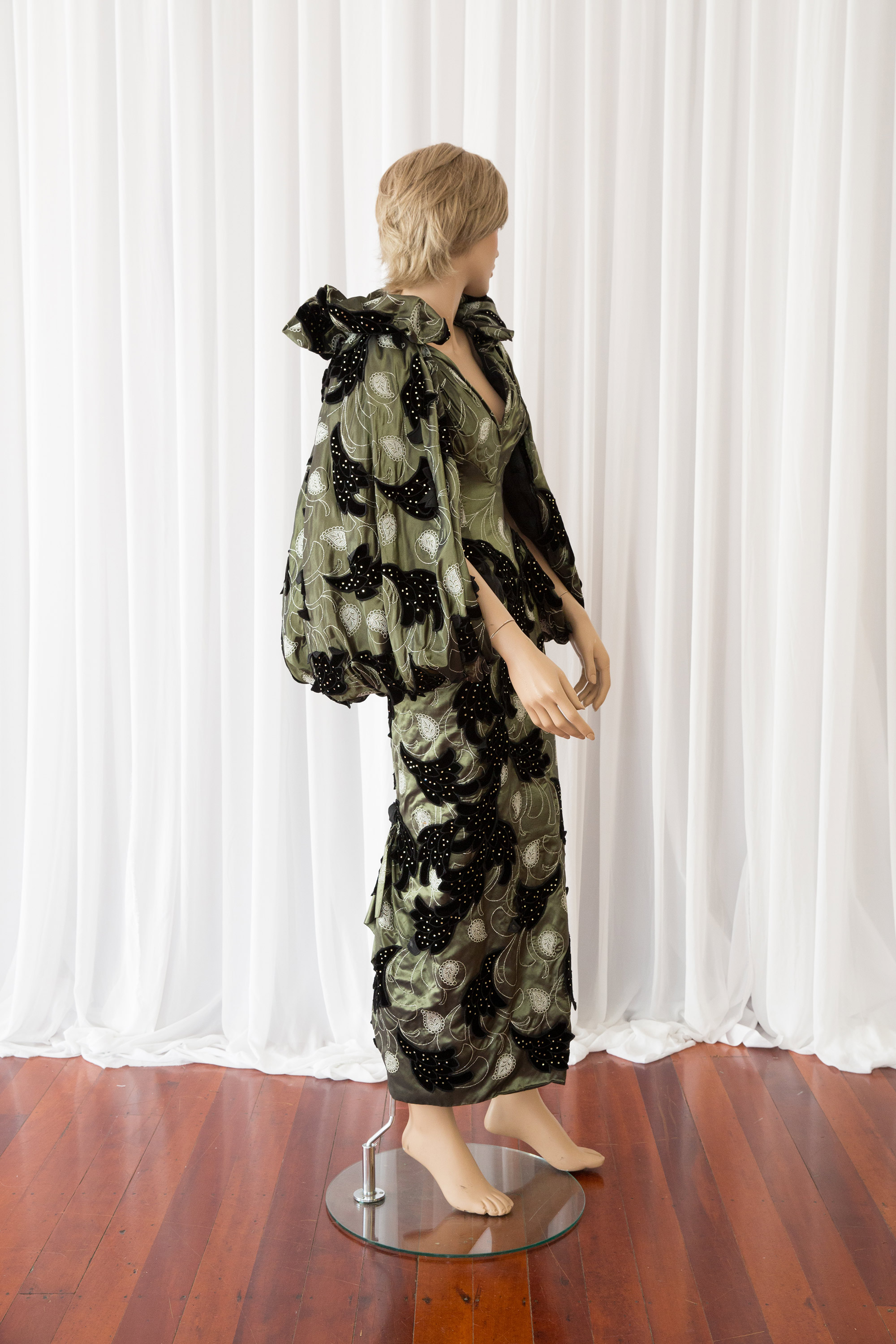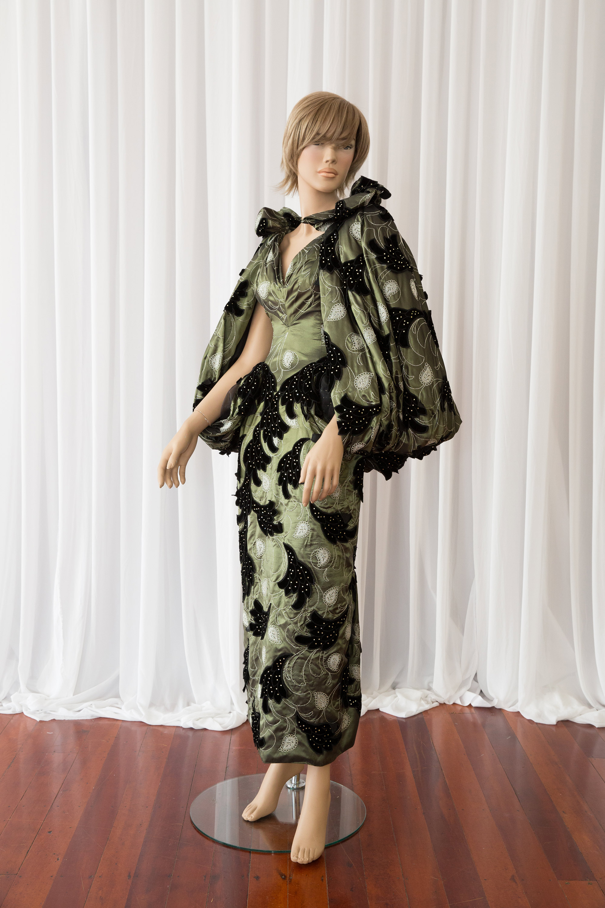 Meegan Pollock, owner of Centrepoint fabrics always had access to unique high quality cloth. She would often bring Bruce Papas a piece of fabric and tell him the event it was to be worn at. After holding the fabric aloft, turning it this way and that to examine its drape, he would immediately pick up a pencil and start sketching. Read more about Bruce Papas in the New Zealand Fashion Museum publication, A Certain Style.