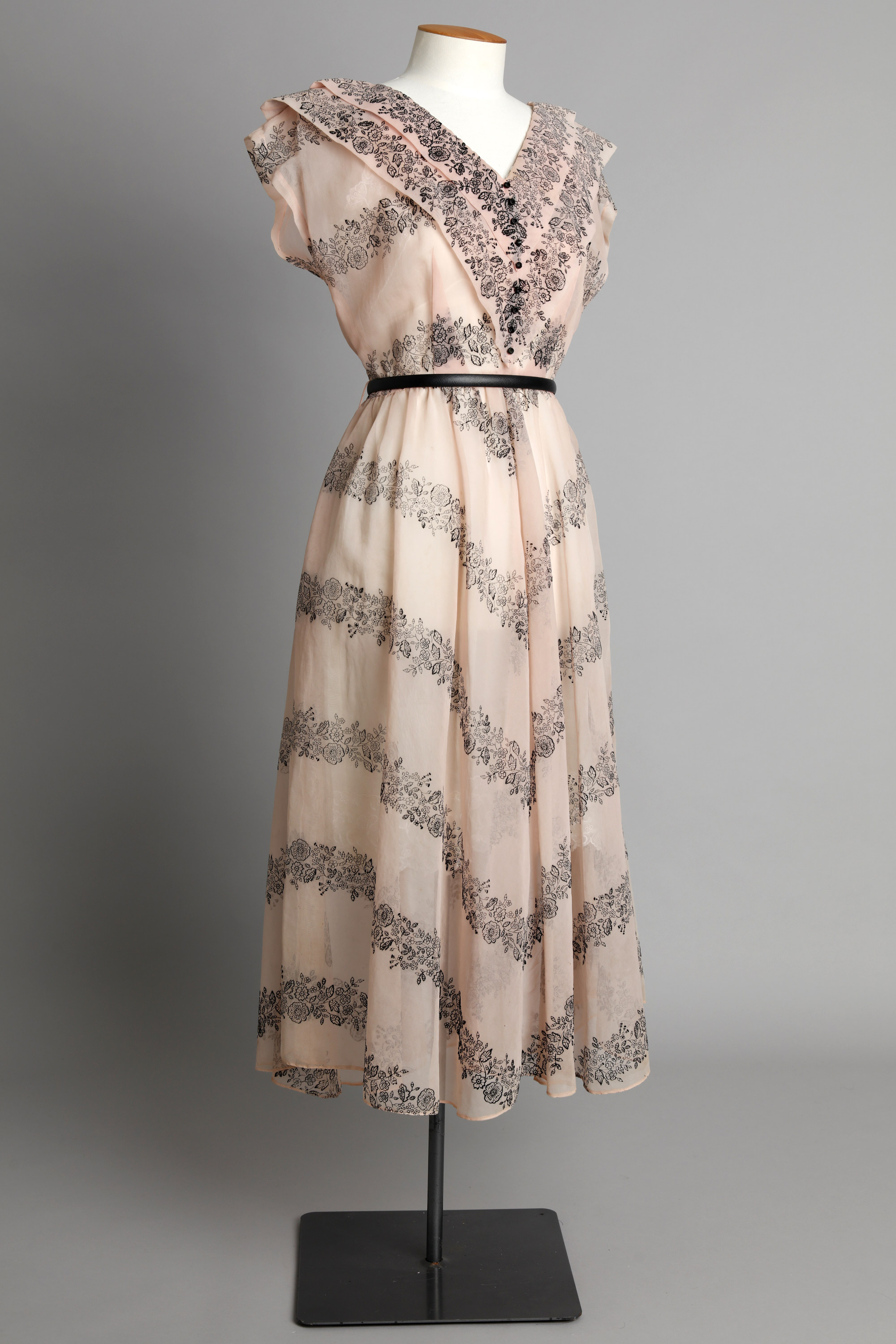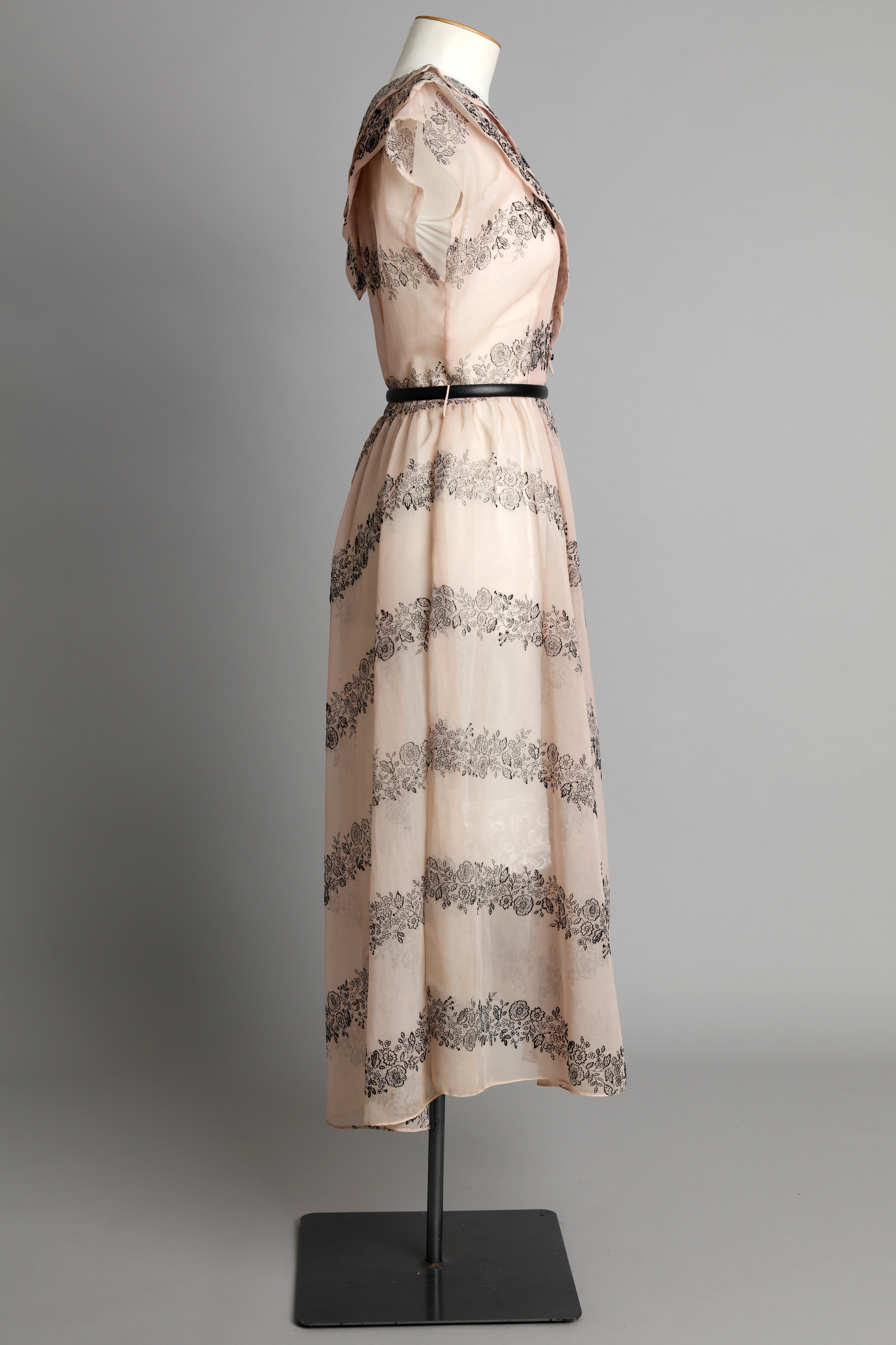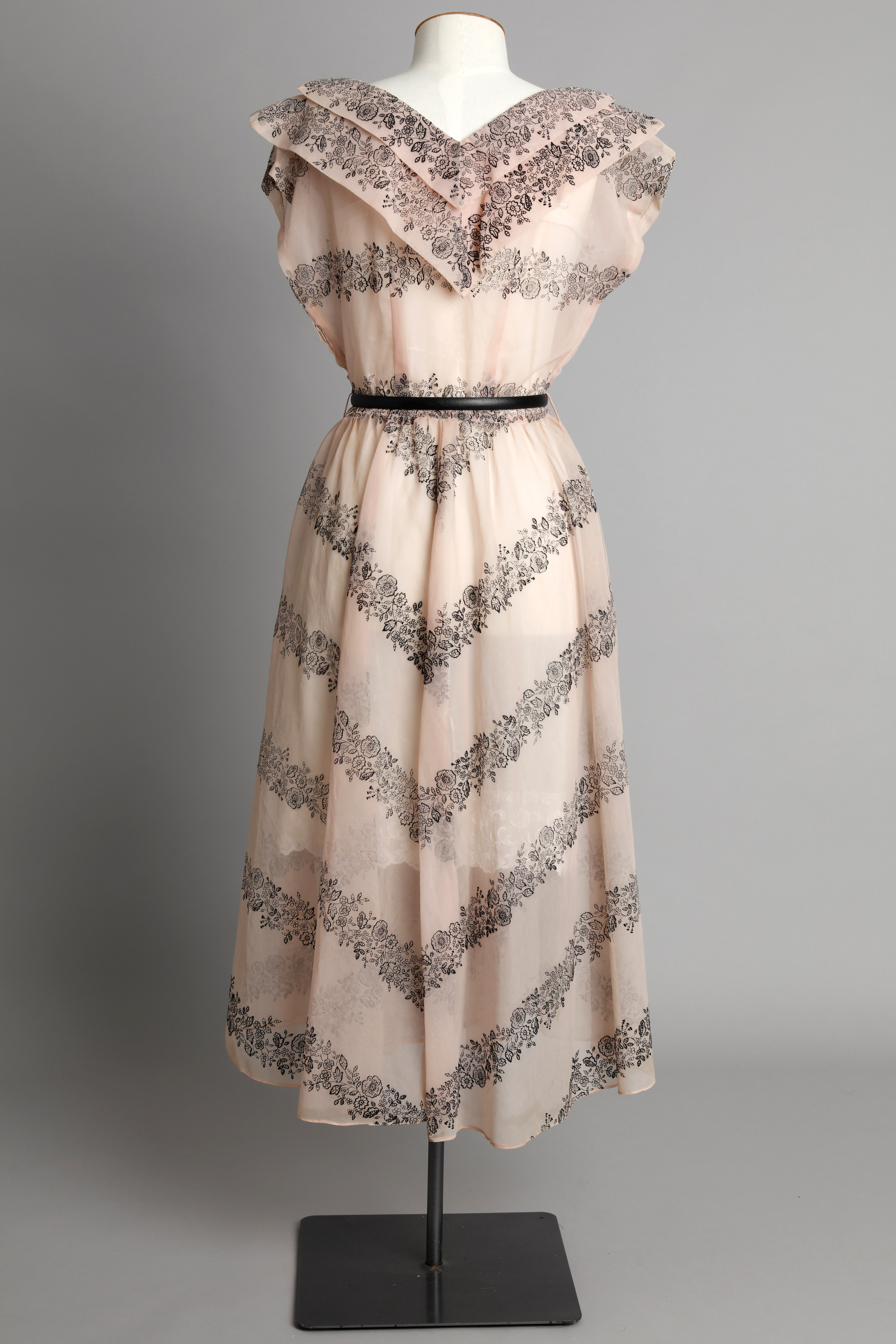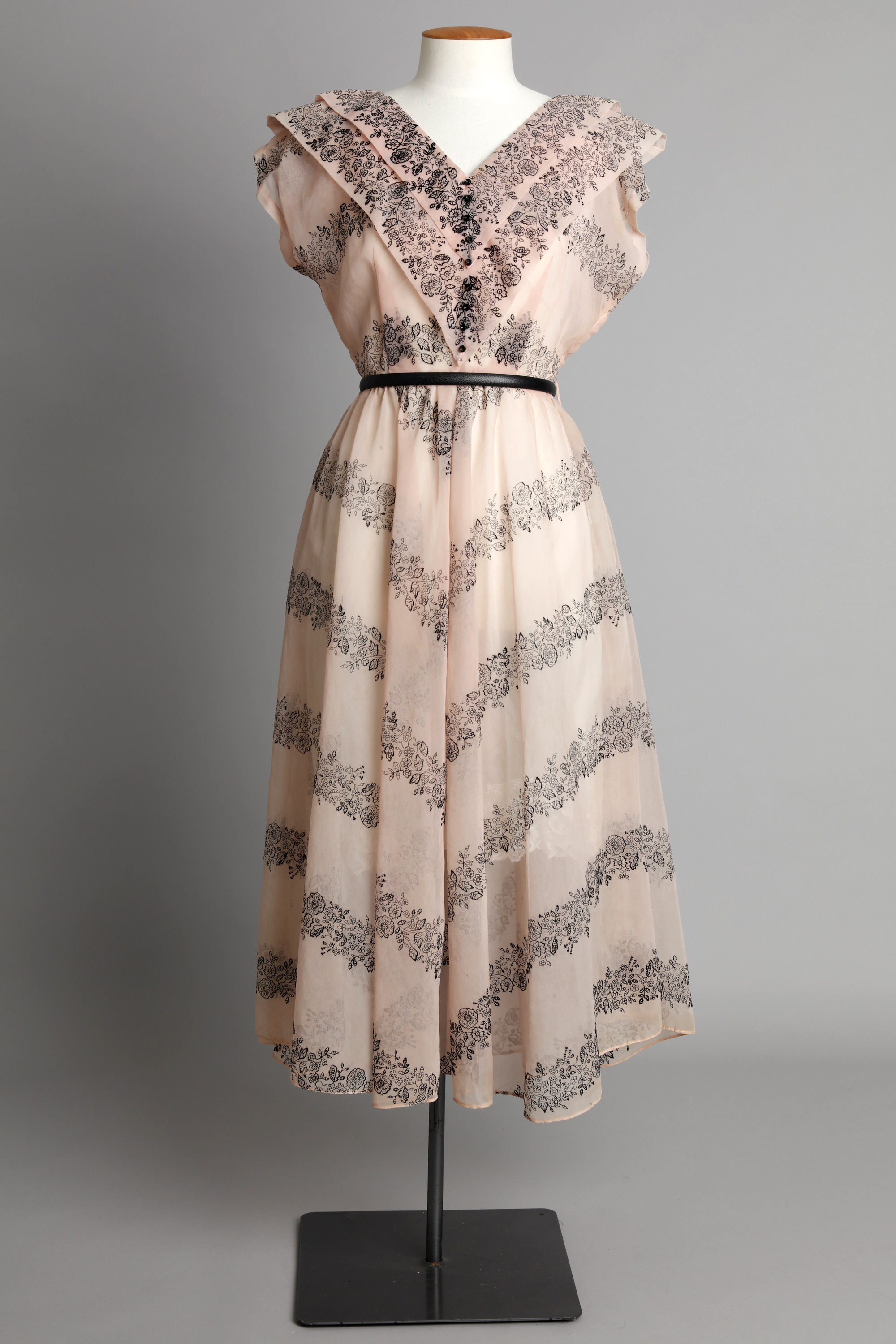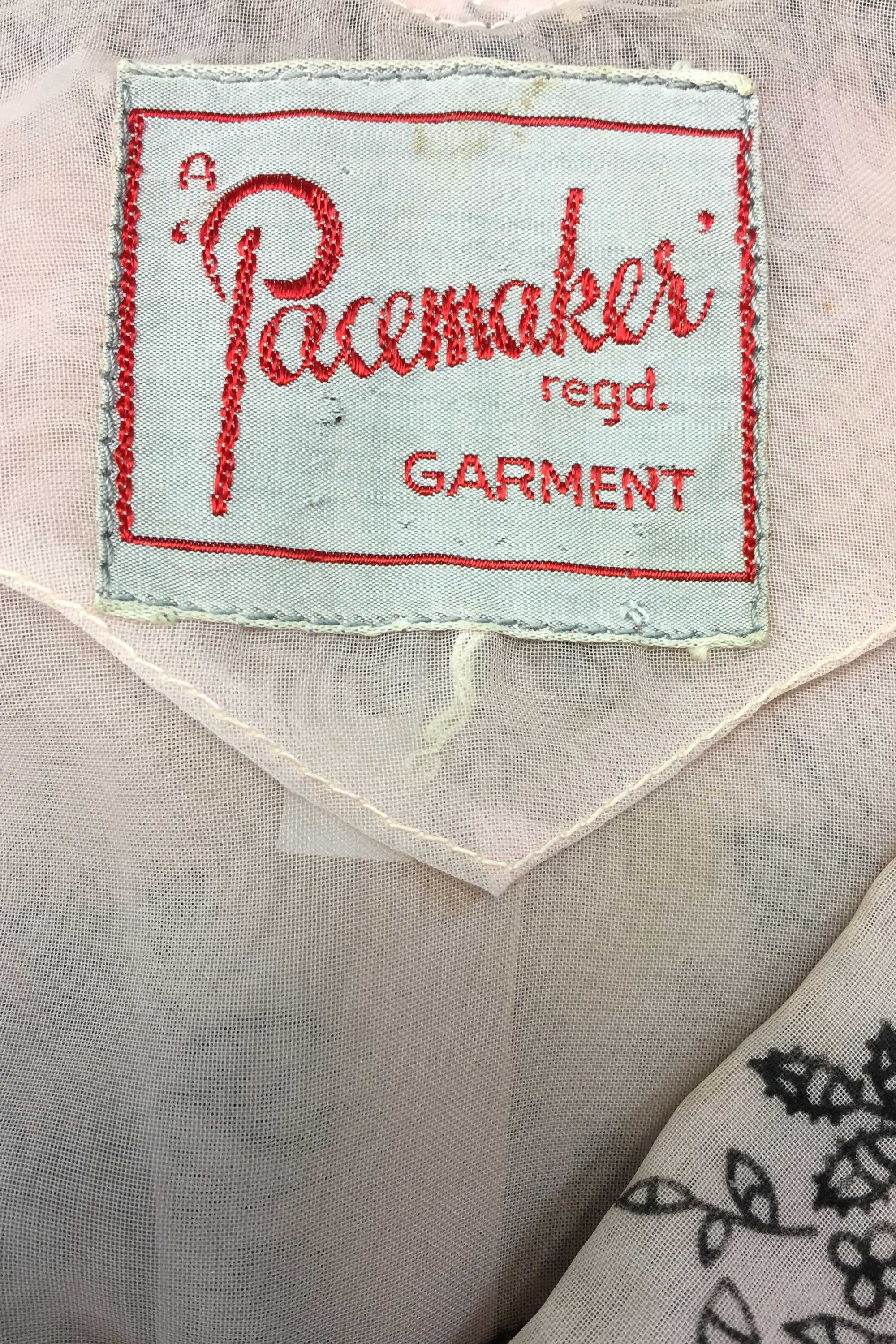 This Pacemakers dress is made from flocked nylon. The fabric became very popular in the 1950s for cocktail and party dresses because it was light and pretty. Its stiffness meant it didn’t take too much to make the skirt flare out and it leaned itself to lovely puff sleeves.