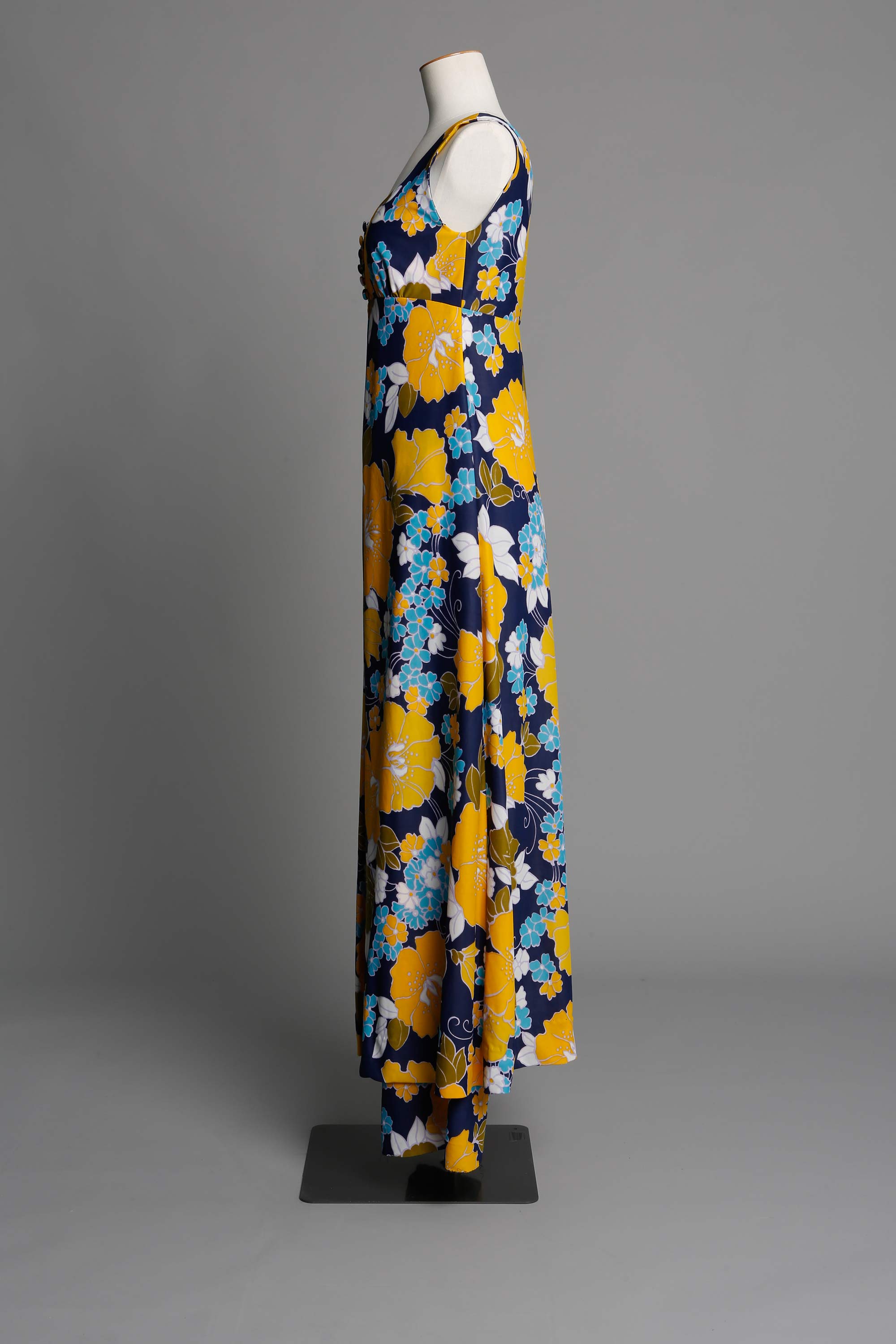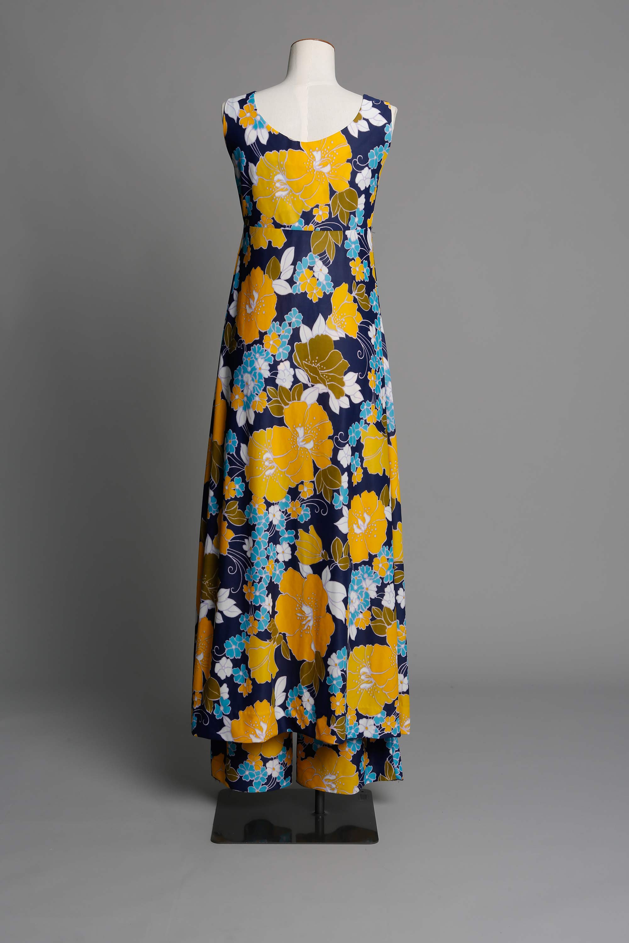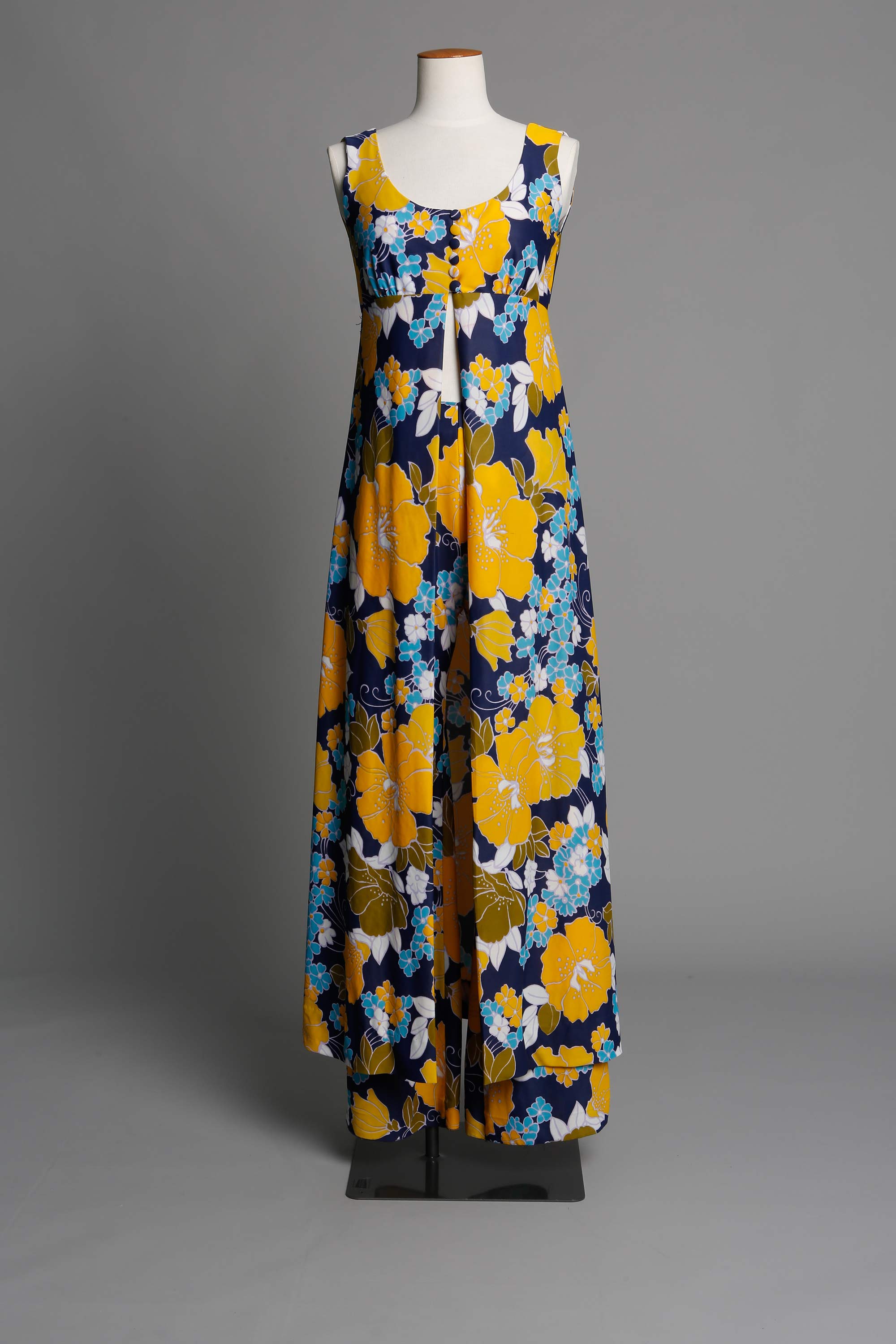 This two-piece outfit is made from a fabric called Arnel, which was represented in New Zealand by Christine's sister, Anne Pirrit. Christine remembers that she loved the outfit, even though it was considered to be a bit 'risqué' when she wore it because of the bare mid-drift. Christine has lived in Ohaeawai, a small village near Kaikohe on State Highway 1, for 50 years. She was in her 30s in the 1970s. "Kaikohe was our closest centre and in those days it was a vibrant community with a great young group of families. There was a amateur theatre group , we all played golf, we had an active church group of 'young wives', we had fund raising Balls and Cabarets and parties." The main street in Kaikohe was busy with many shops. The fashion shop was called La Femme and owned by Winsome Routley. "She had a great eye for fashion. I would have bought most of my clothes in Kaikohe in those days as with La Femme there was no need to go anywhere else. Read more about 1970s fashion in the New Zealand Fashion Museum publication The Age of Aquarius: A 70s Revolution in Fashion.