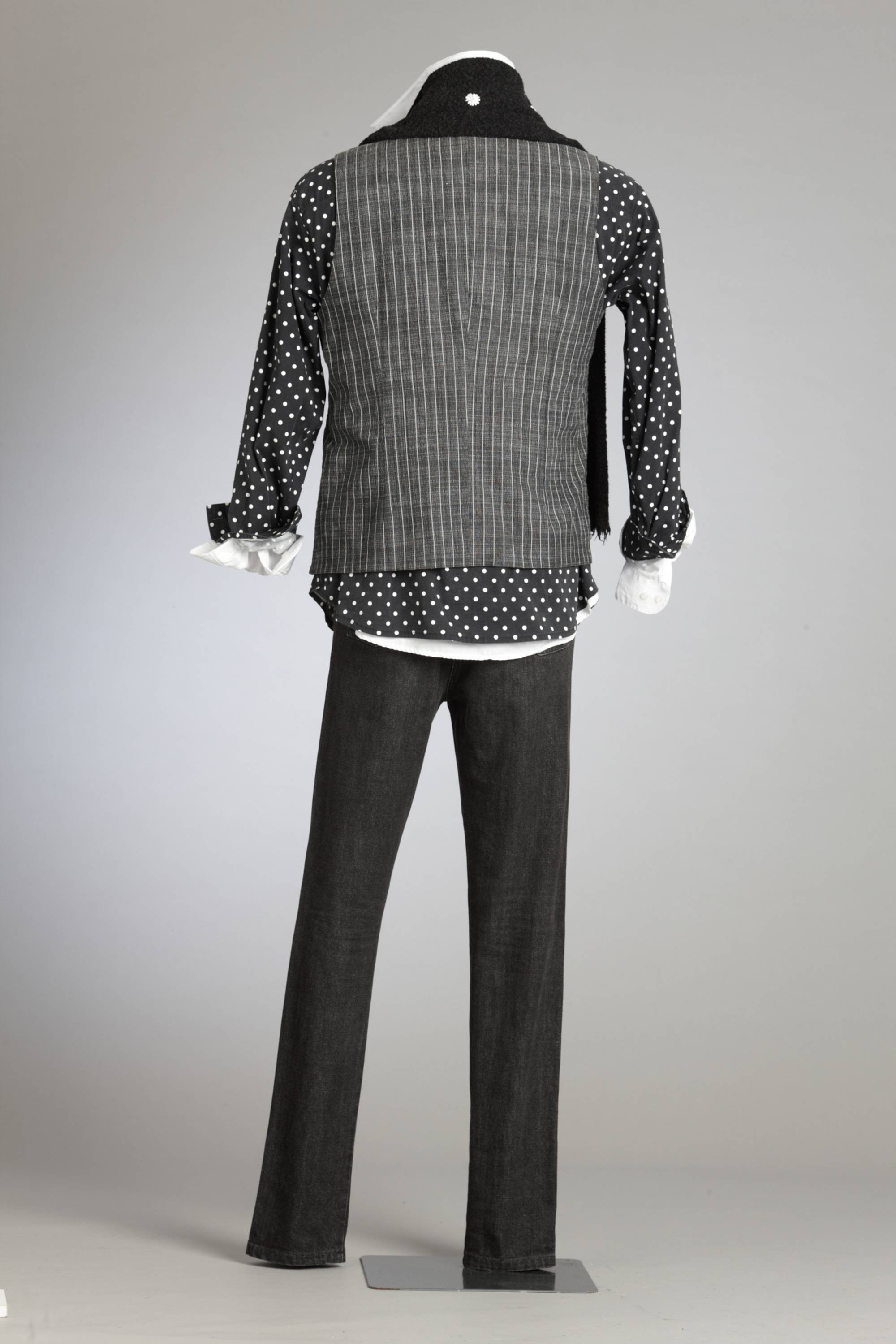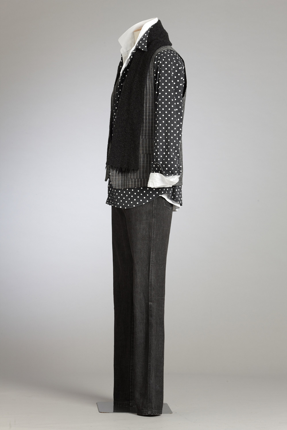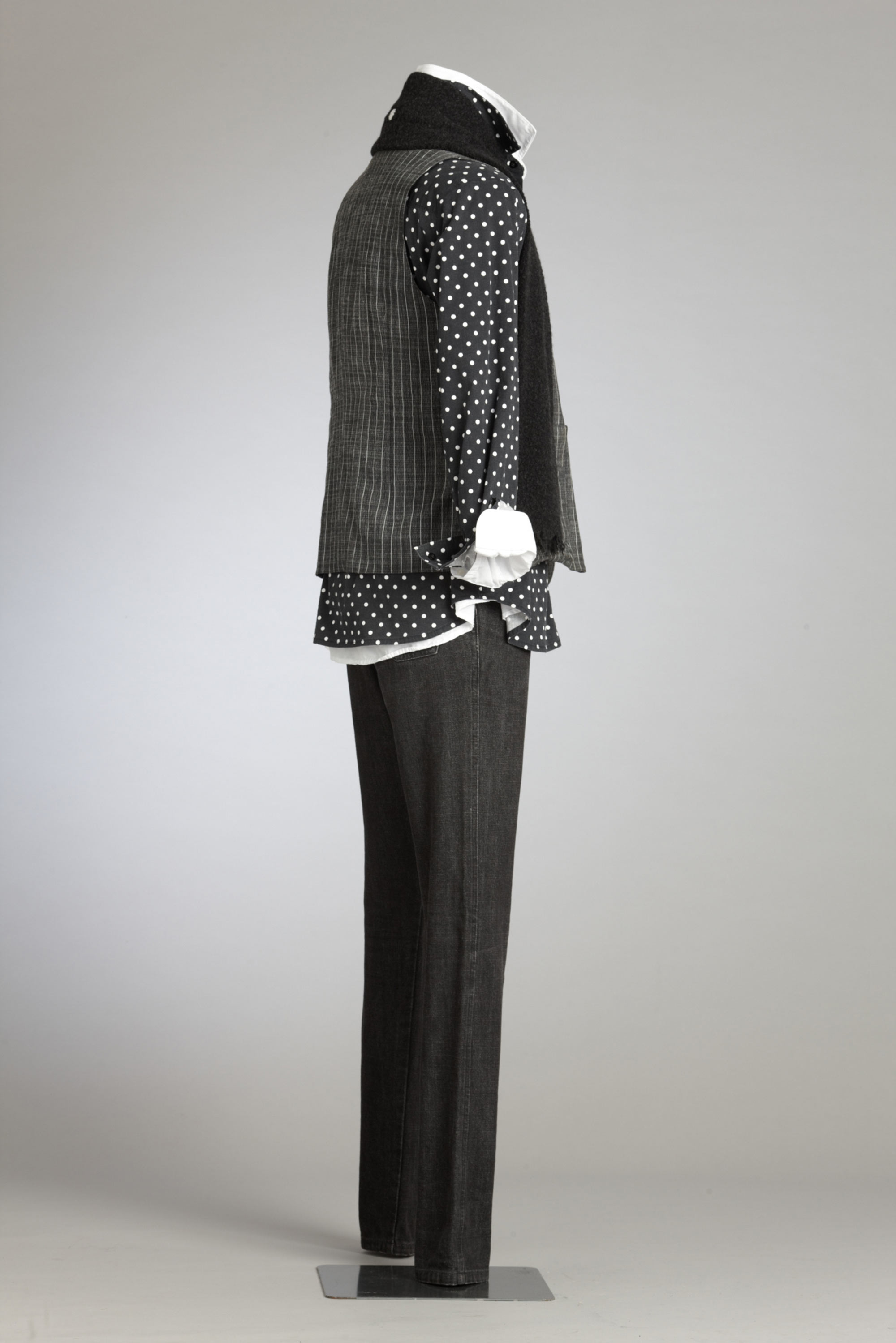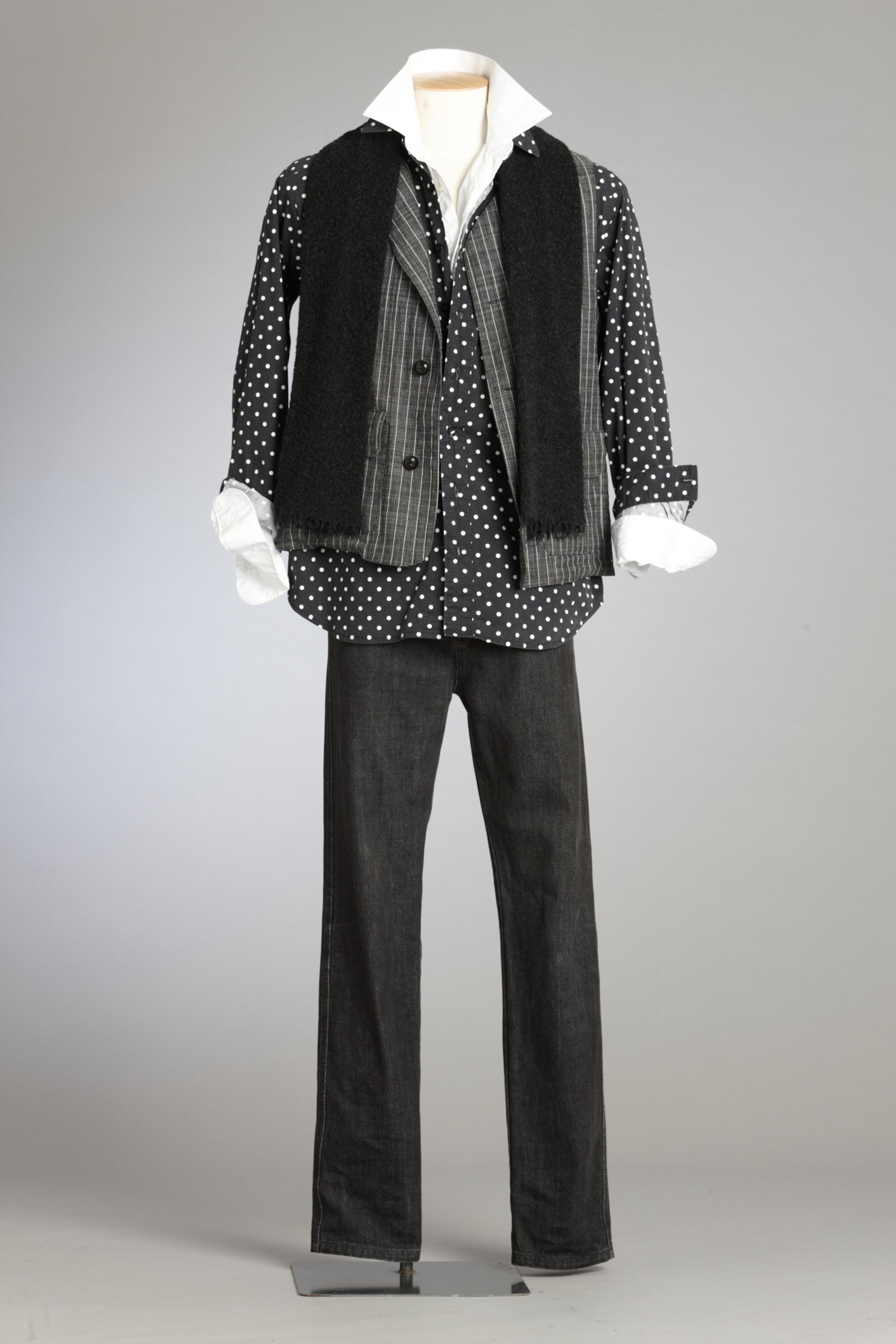 As the country’s best-known performance poet, Sam Hunt's visual image is cemented in popular imagination by his tousled hair and iconic clothing – straight-legged, skinny black trousers named Foxton Straights and an open-necked shirt, with a loose open waistcoat. Oliver Stead has described his art practice: "A bard in the truest sense of the itinerant minstrel, Hunt’s turangawaewae [place to stand] is the public bar. Touring the pubs with bands of musos and poets, he is himself one of the national icons." In keeping with the on-the-road performance lifestyle of a troubadour, Sam himself named the trousers 'Foxton Straights', after the long straight stretch of State Highway 1 near Foxton. He has had them custom-made ever since store fashions shifted to a wider-legged cut for men’s trousers. Until the 2011 earthquakes in Christchurch devastated her Lyttleton premises, Caro Allison made these trousers for him. Caro is the great-granddaughter of Kate Patterson whose mother of the bride dress features in the Black in Fashion exhibition. Read more about wearing the colour black in the New Zealand Fashion Museum publication Black: The history of black in fashion, society and culture in New Zealand.