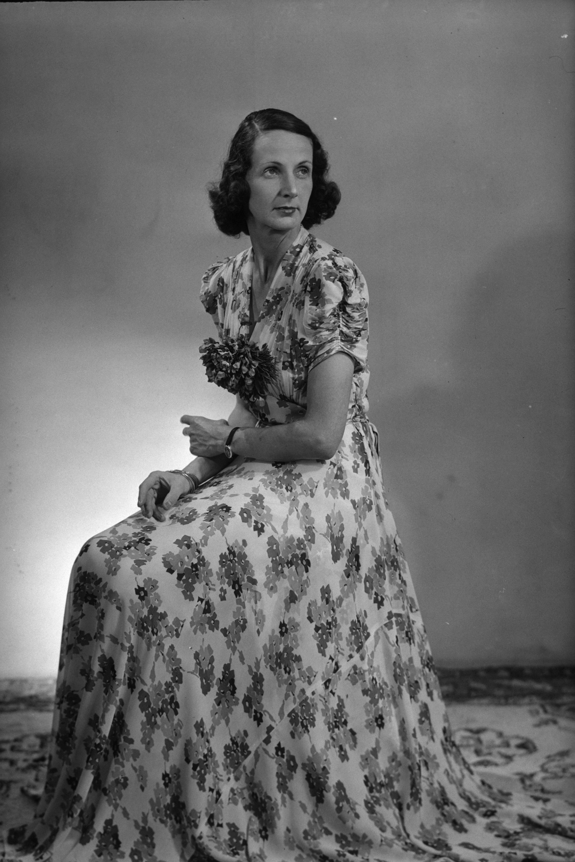 Full-length evening gown with silk flower