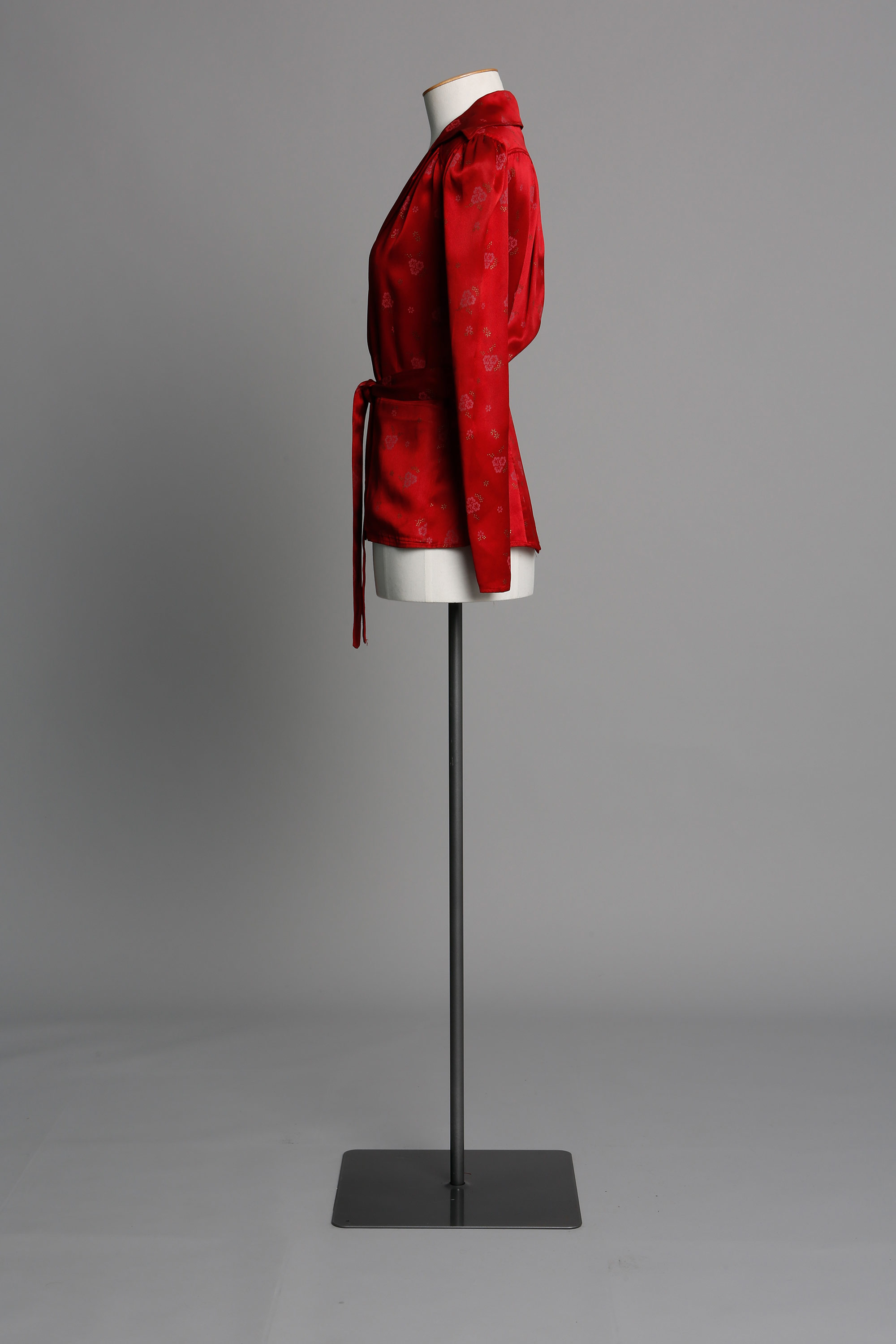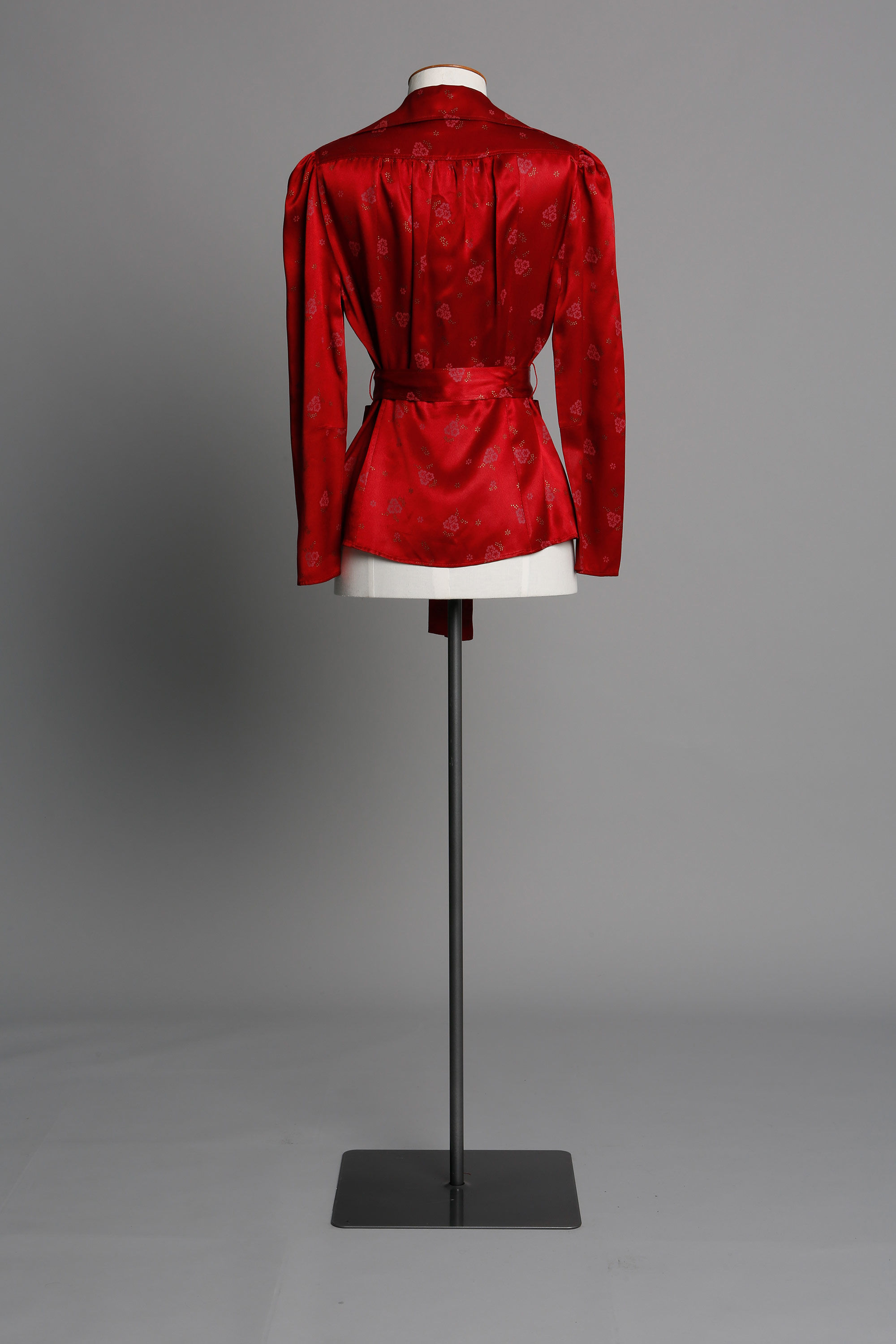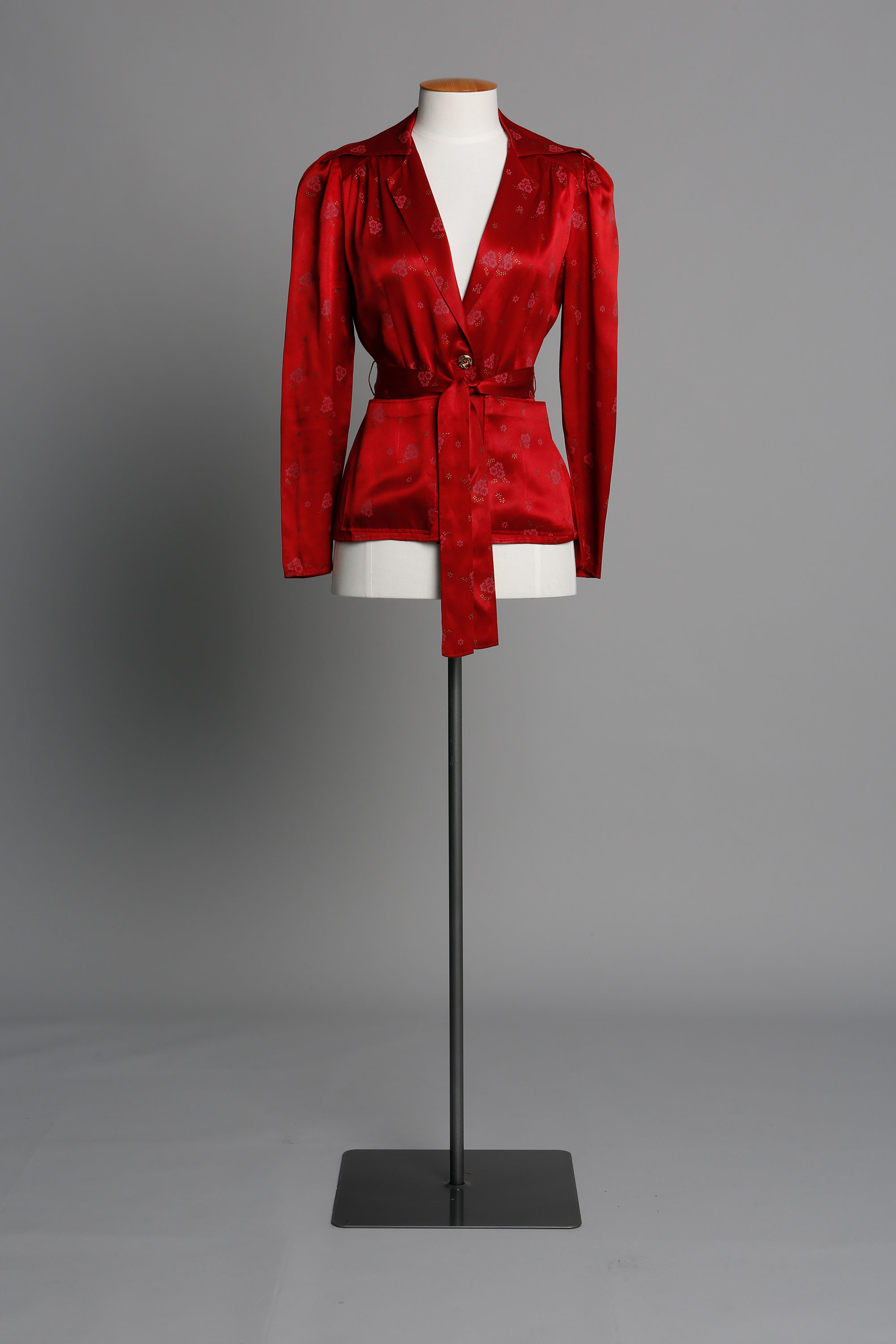 In the early 1970s there was an underlying influence of 1920s fashion, which culminated with the release in 1974 of The Great Gatsby starring Mia Farrow. The 1920s subtly influenced the work of Linda Evans during this time. This jacket was originally sold with a flared A-line skirt on a waistband. "To go with the set we made a cream satin crepe blouse with a V neck and puff top short sleeve. There was a cream rose motif on each side of the neckline, which was slightly gathered off a yoke. Pearl necklaces were encouraged!"