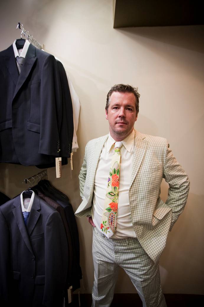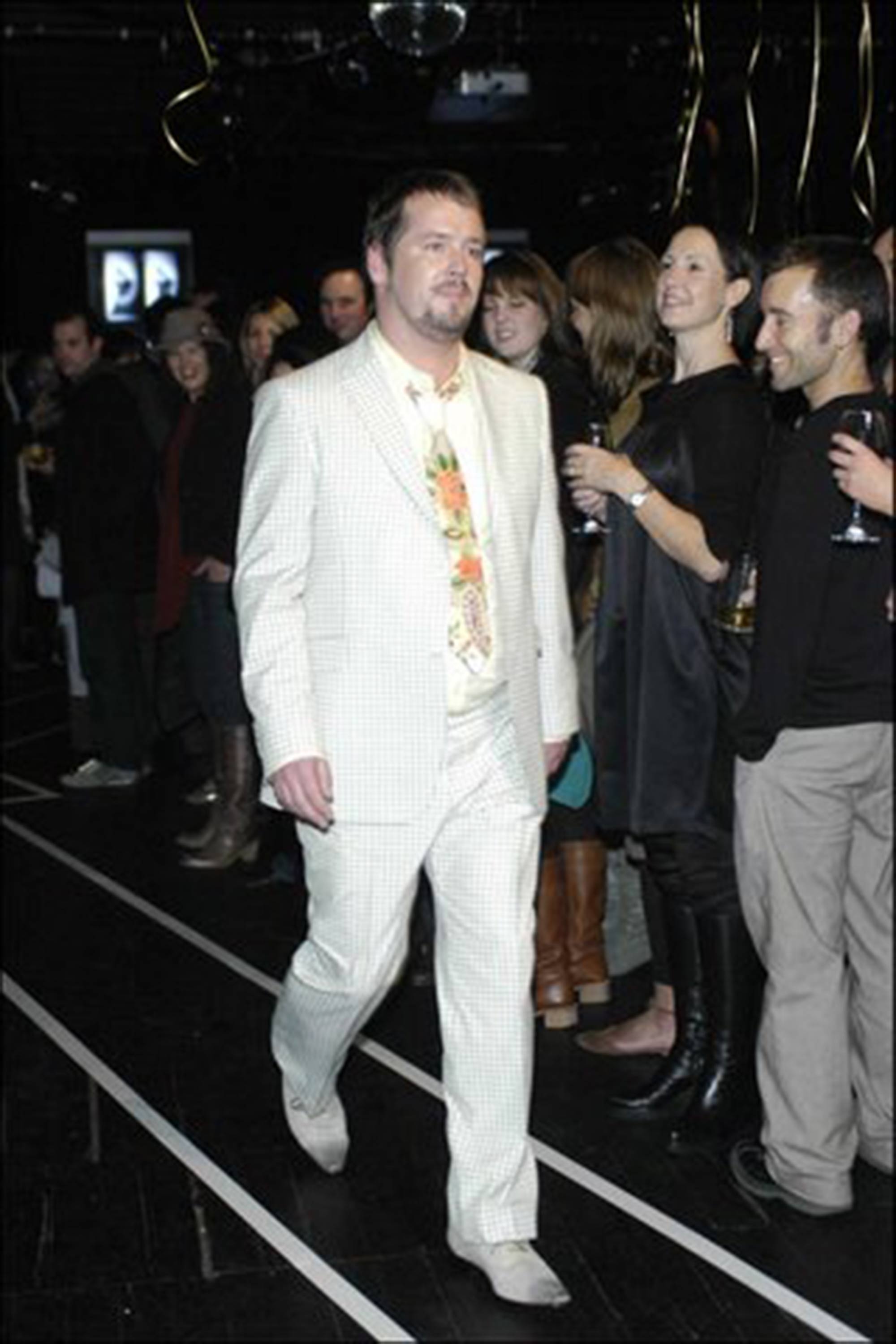 This is the first of many suits made by Mandatory for Joe Lindsay, trombone player for Wellington band Fat Freddy's Drop. The jacket features a clever underarm invisible zip adaptation in the style of jackets made for orchestra. These release Joe's pits for arm lift enabling playing the trombone while staying suited! Joe modeled this suit for Mandatory's 10th Anniversary fashion show in 2007, which featured a number of fabulous luminaries. The suit was purchased by Museum of New Zealand Te Papa Tongarewa in 2010.