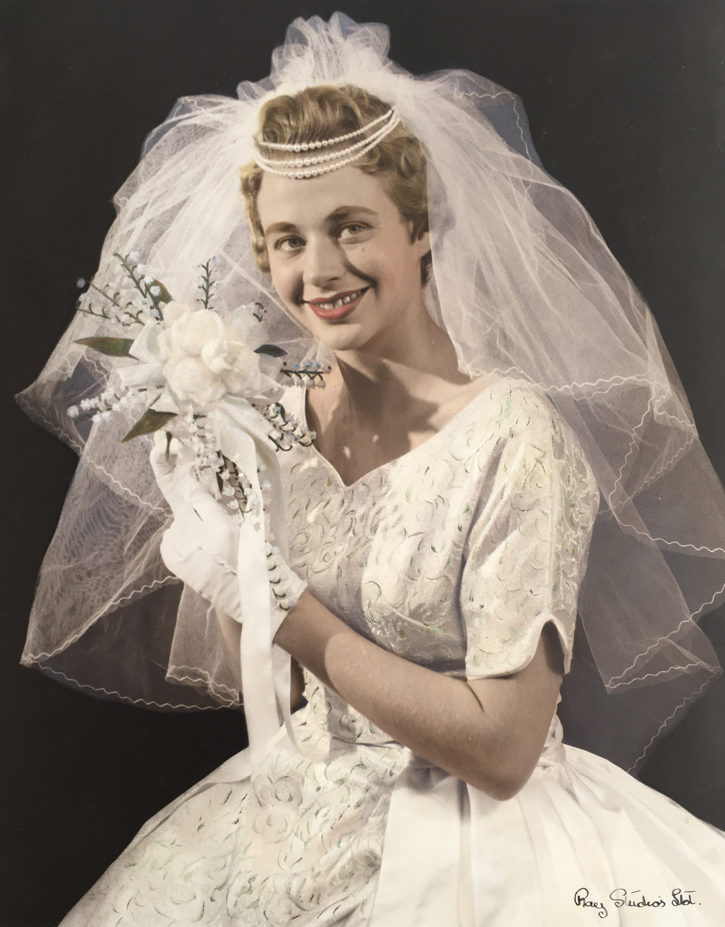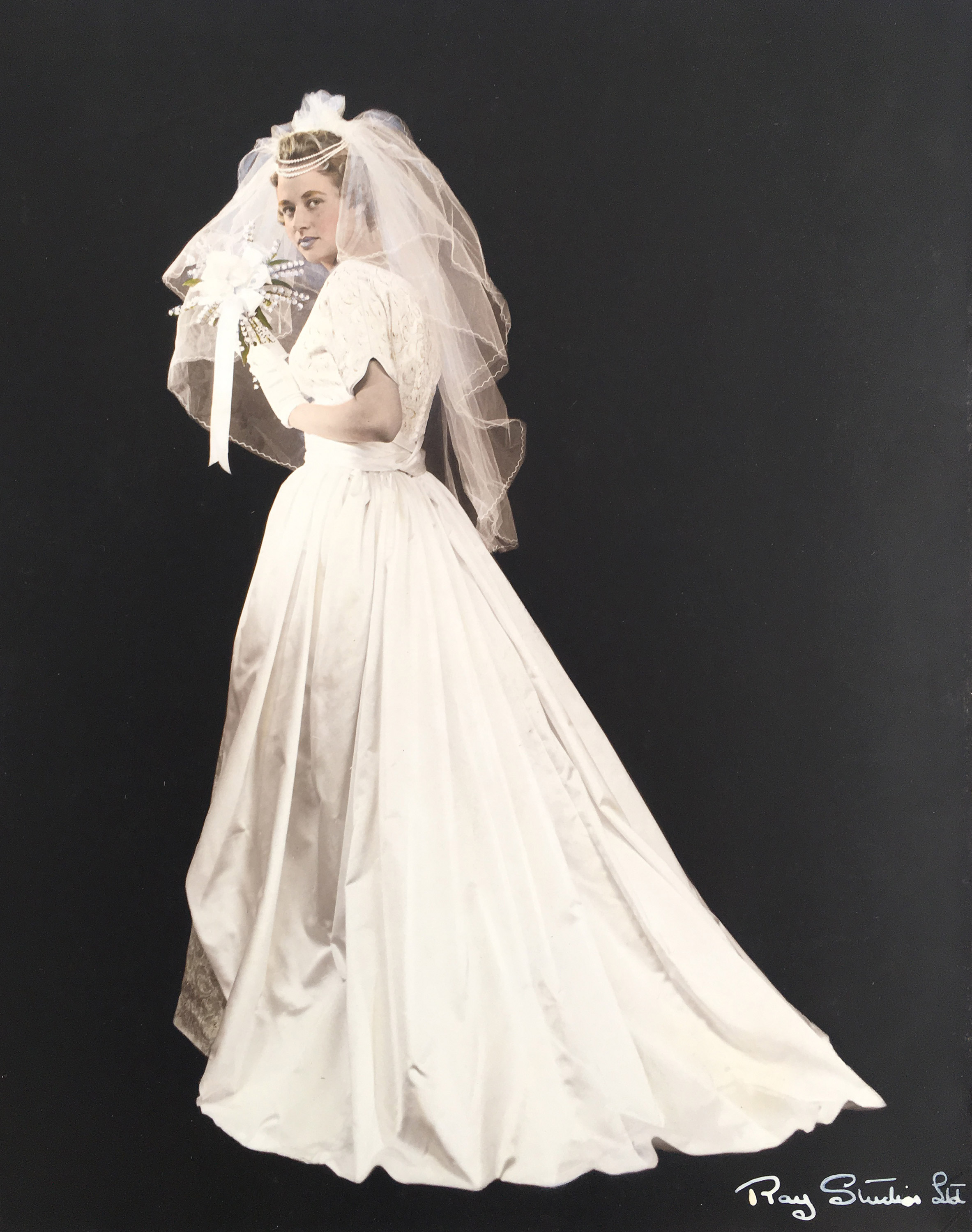 Maud Barrell found the fabric for her daughter Beverley's wedding dress many years before it was required. Beverley recalls it as a small roll wrapped up in brown tissue paper. The fabric was about two yards of a French gold metallic lame, enough for a short sleeved bodice and the front panel. The overskirt was satin. The dress was designed by Maud and made by one of her former machinists. Maud had a very clear vision for her only daughter's wedding dress and Beverley recalls that she had very little say in the matter. Beverley spent several hours of her wedding day being photographed at Ray Studios.