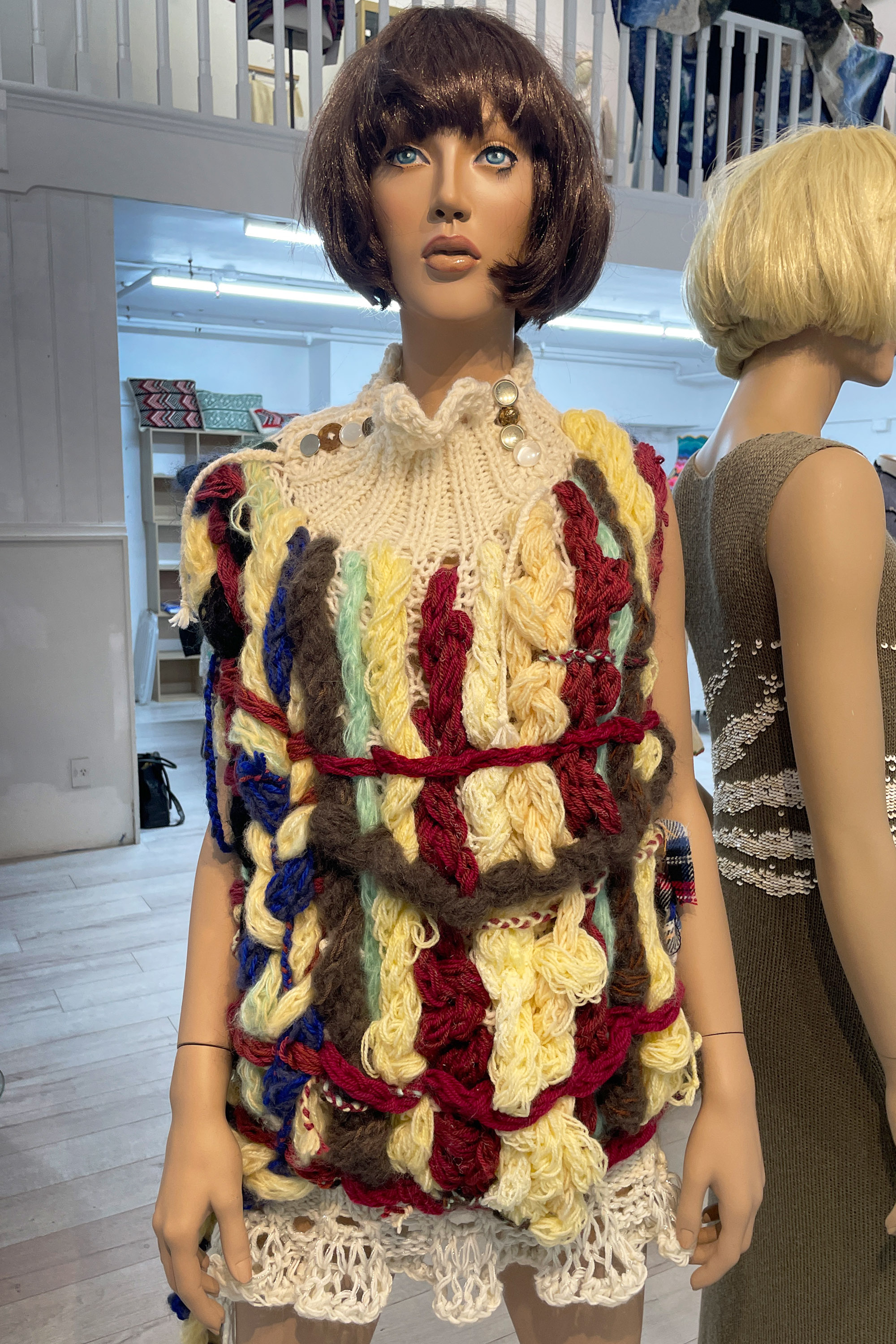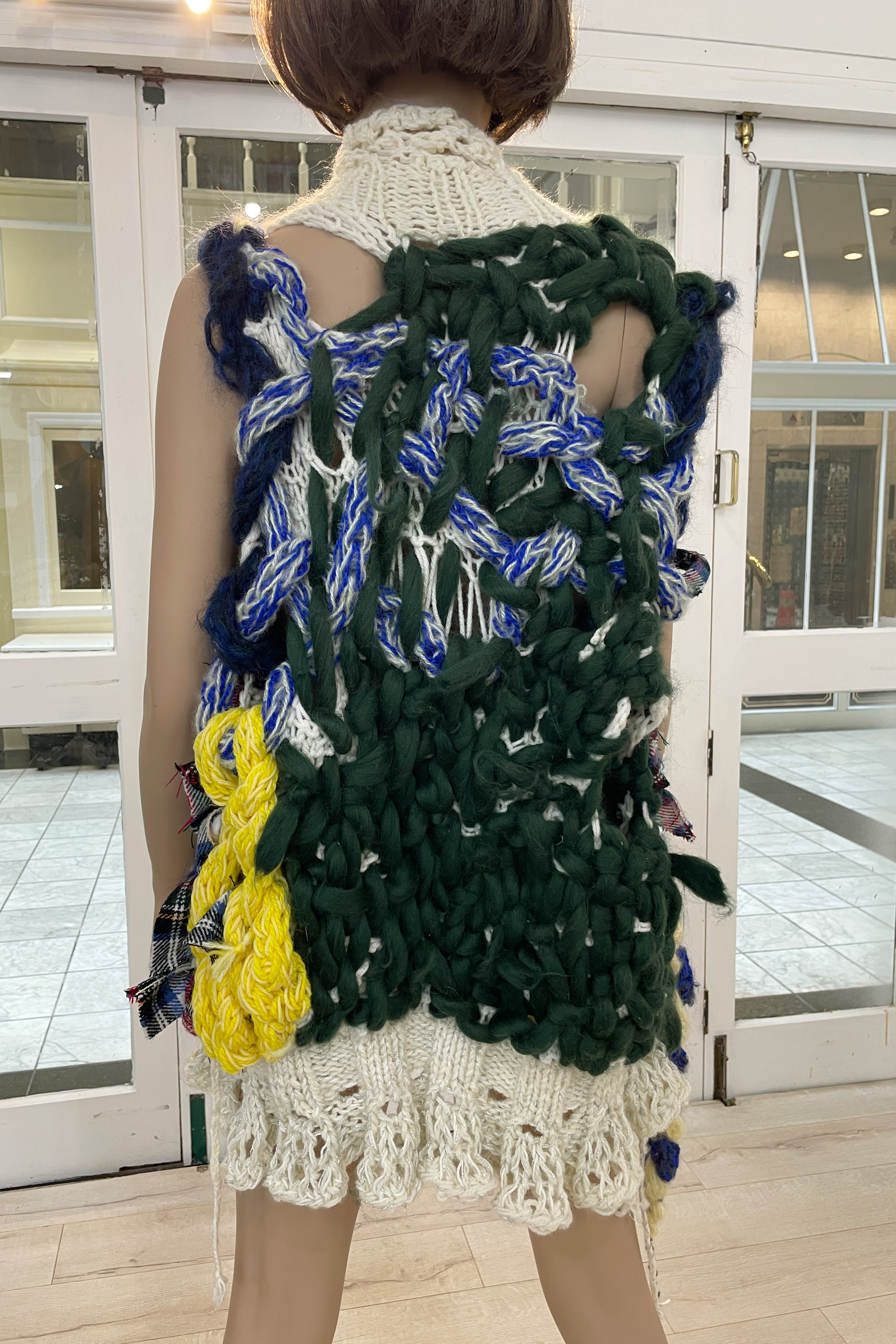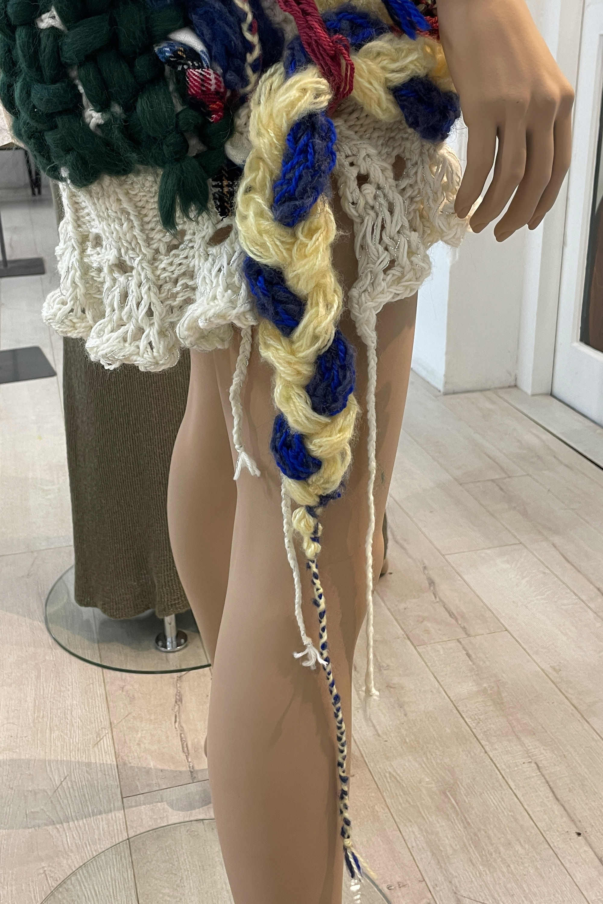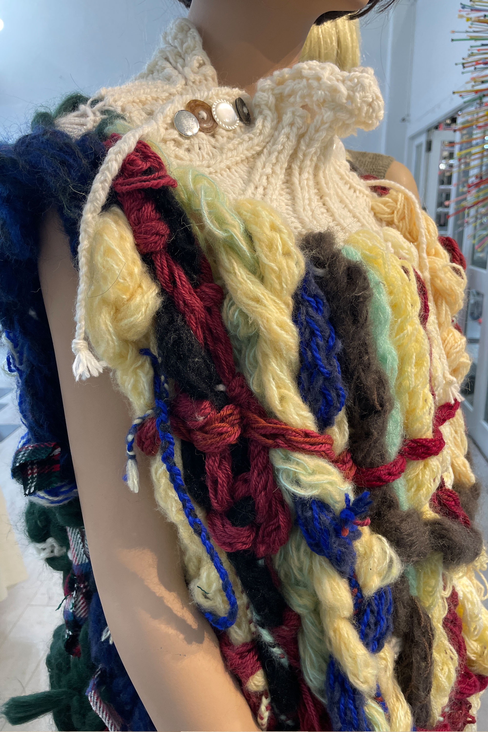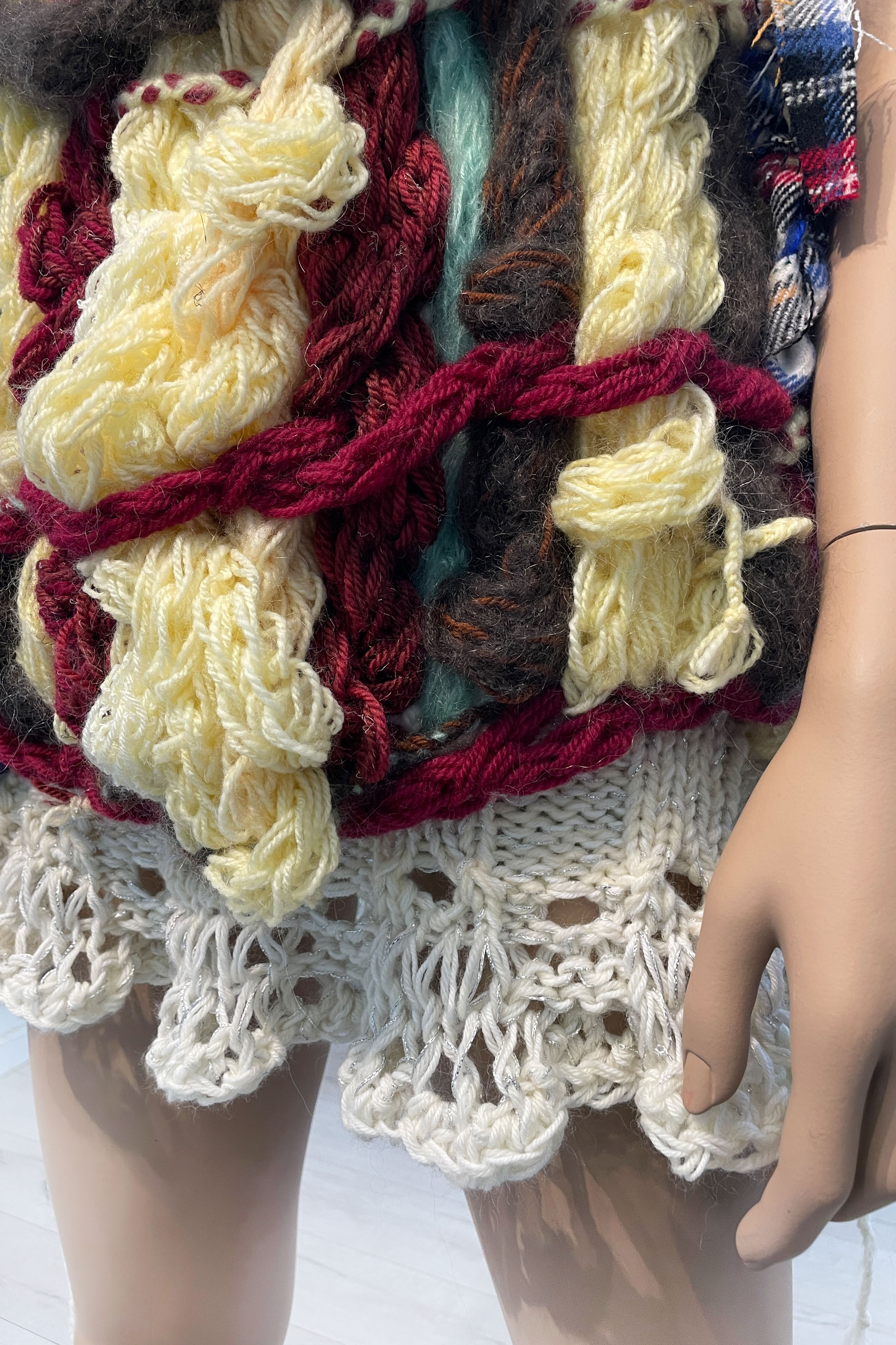 finger knitted strands and plaits of varying thicknesses and colours, free knitting, lace knit hem, rib knit collar