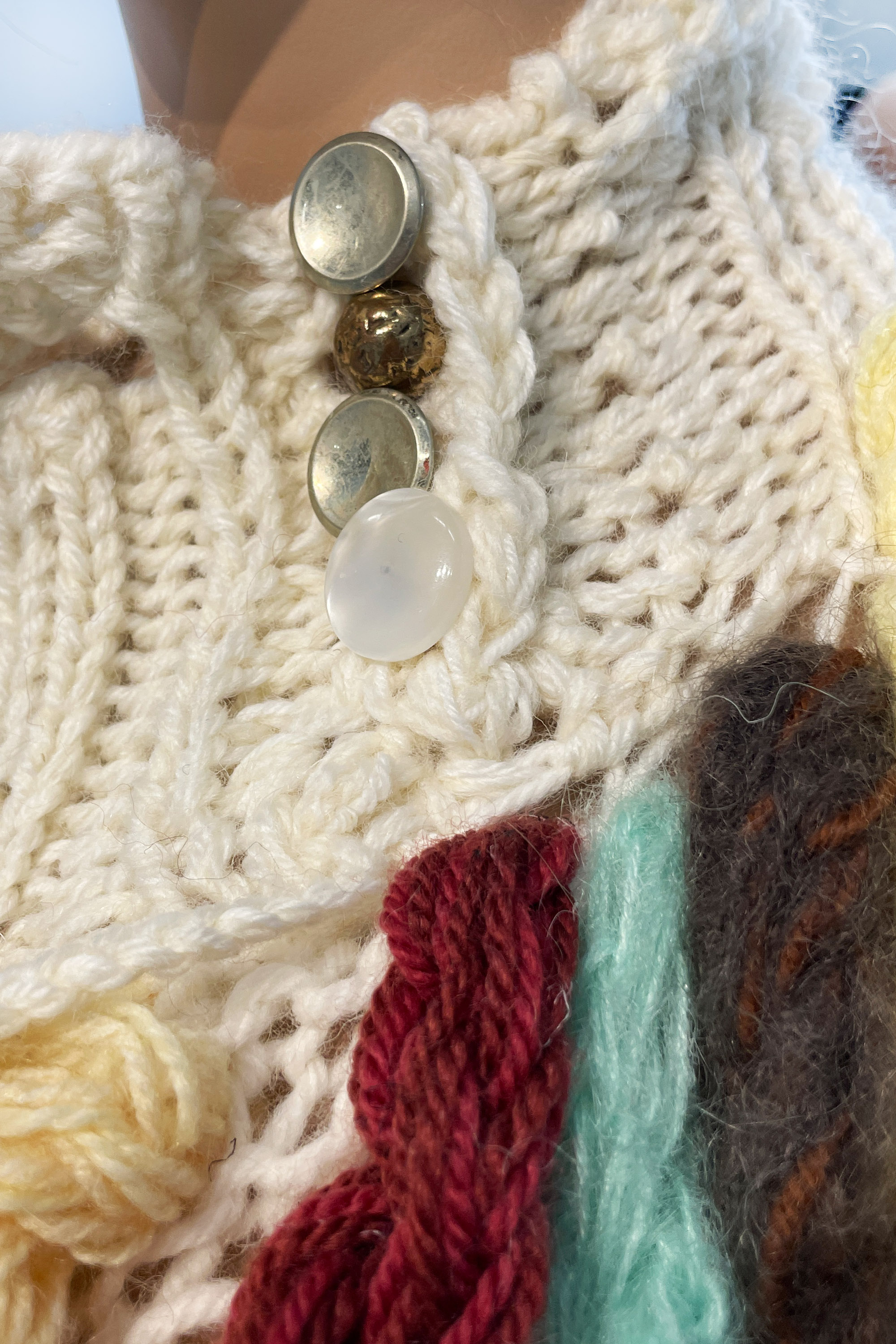 Yarn collected from West Coast op-shops between Tamaki Makaurau and Poneke, vintage buttons