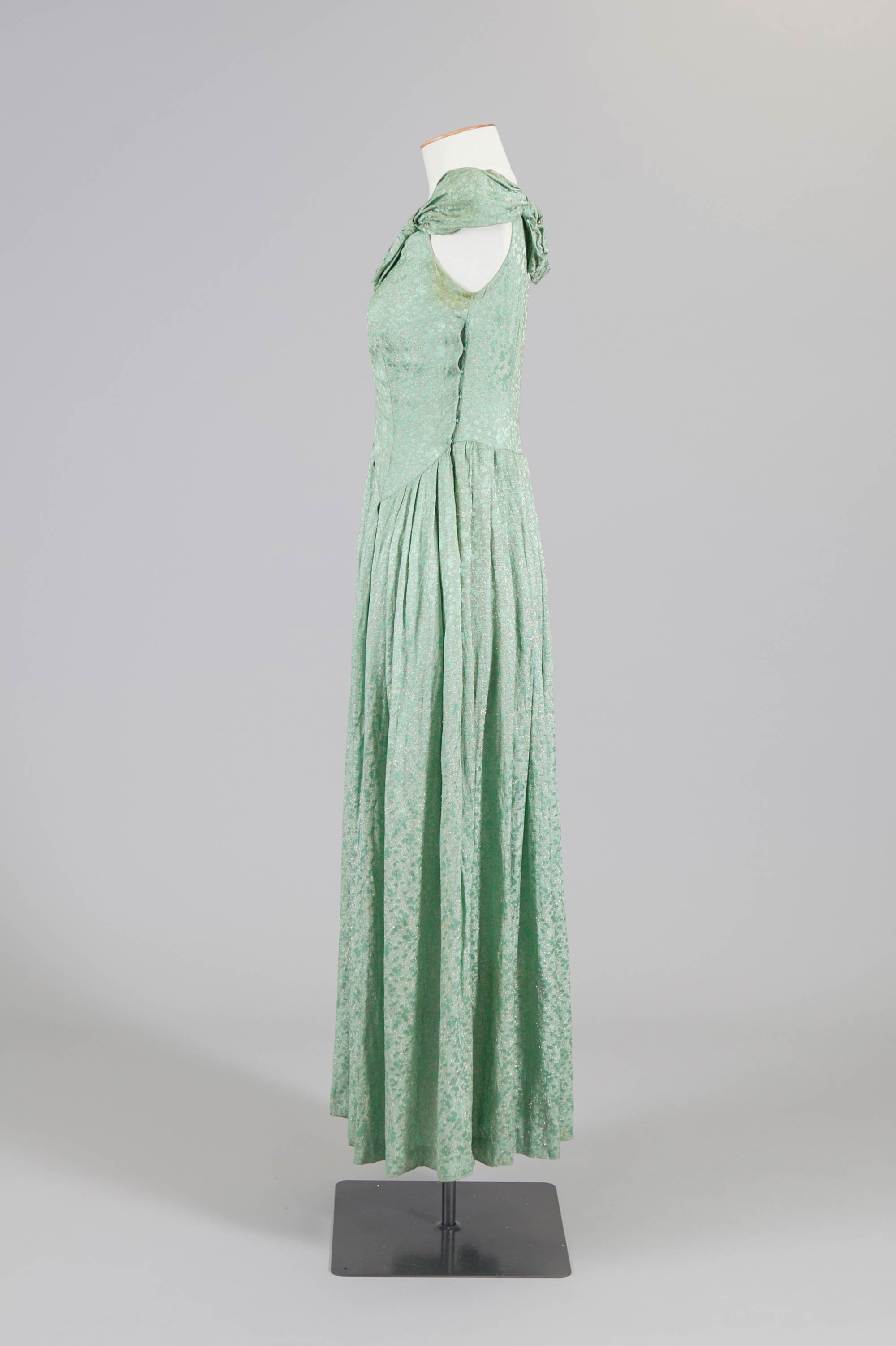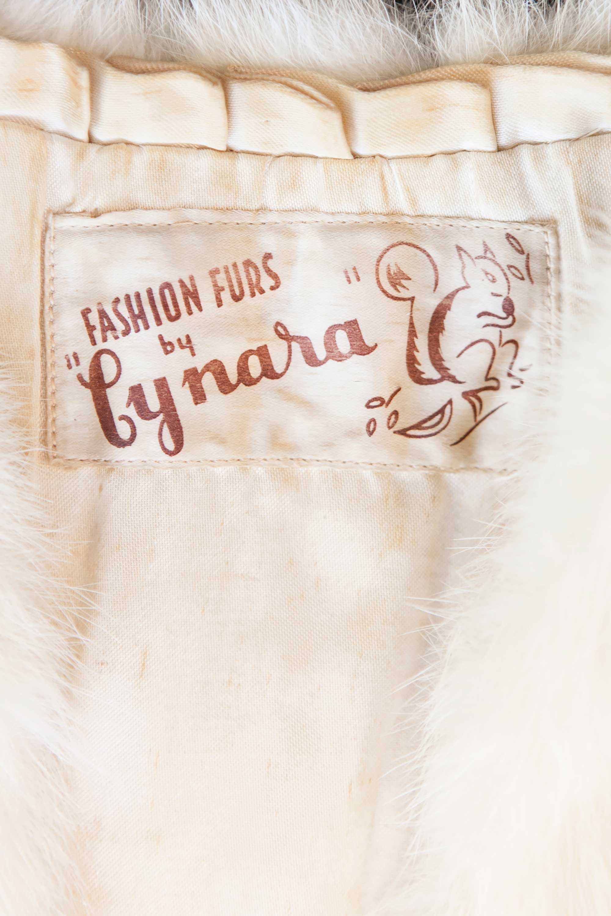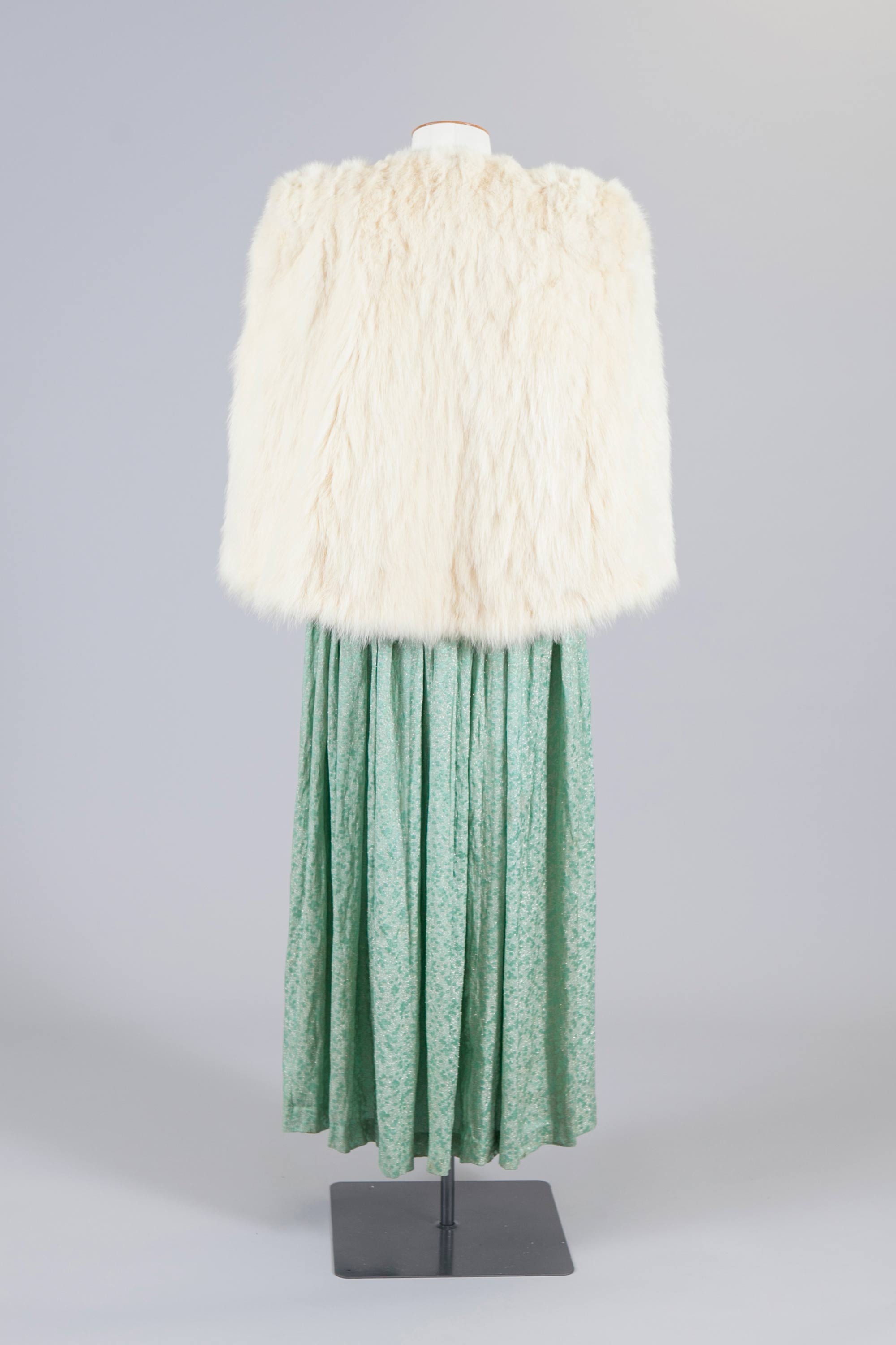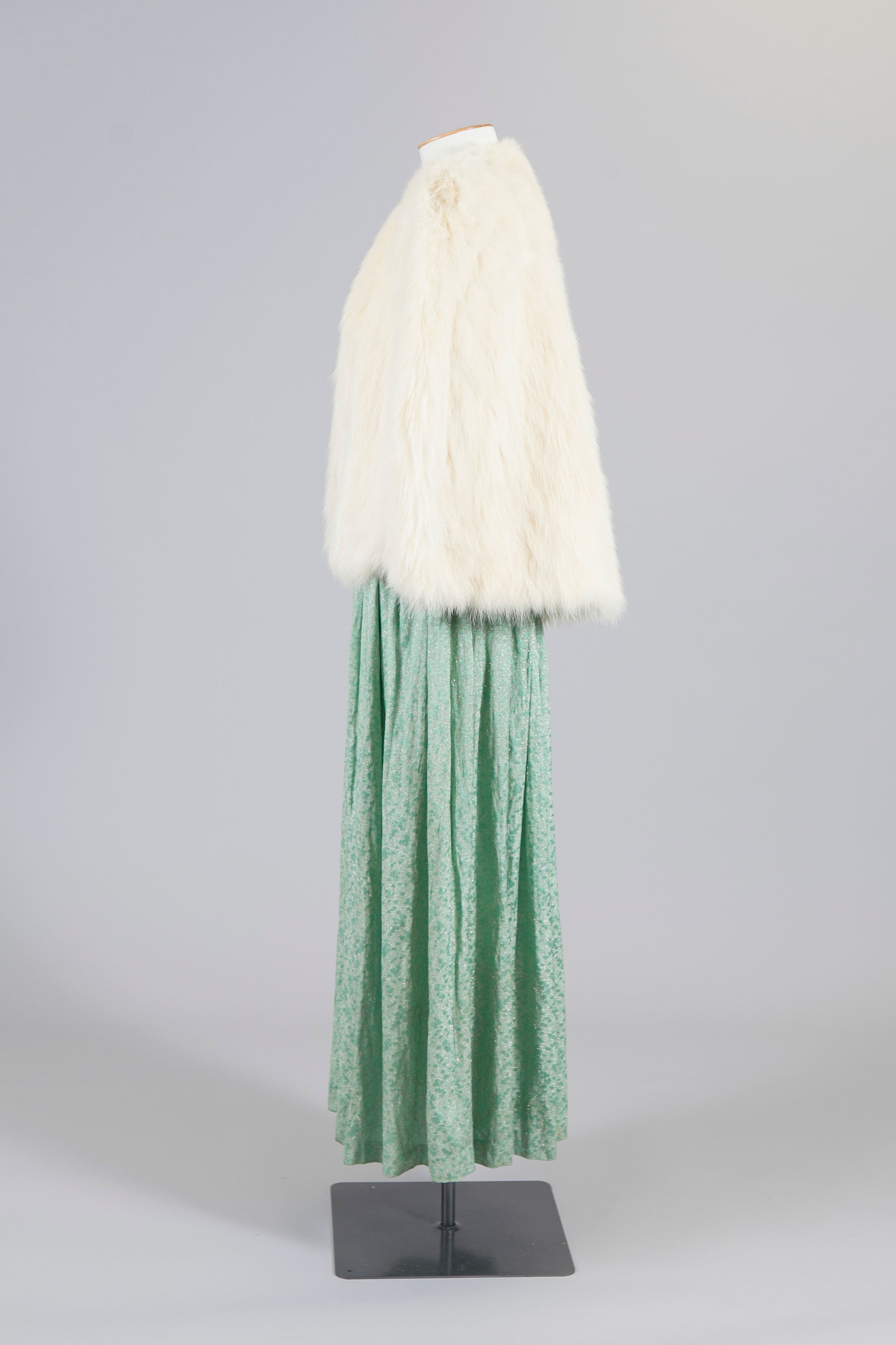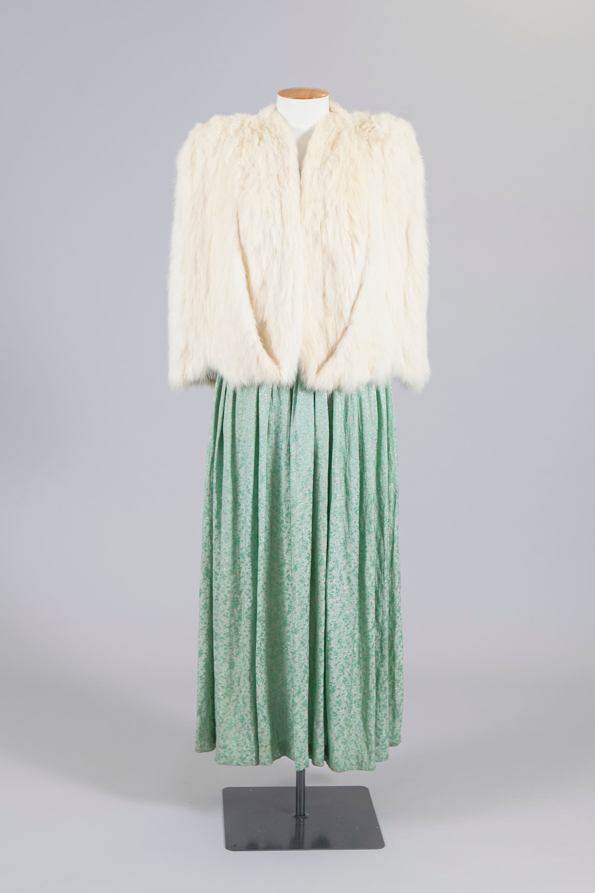 This Cynara jacket and green evening dress belonged to Mona Cheetham. 'Fashion Furs by Cynara' is one of the labels produced by Dunedin furrier, Mooneys Furs.