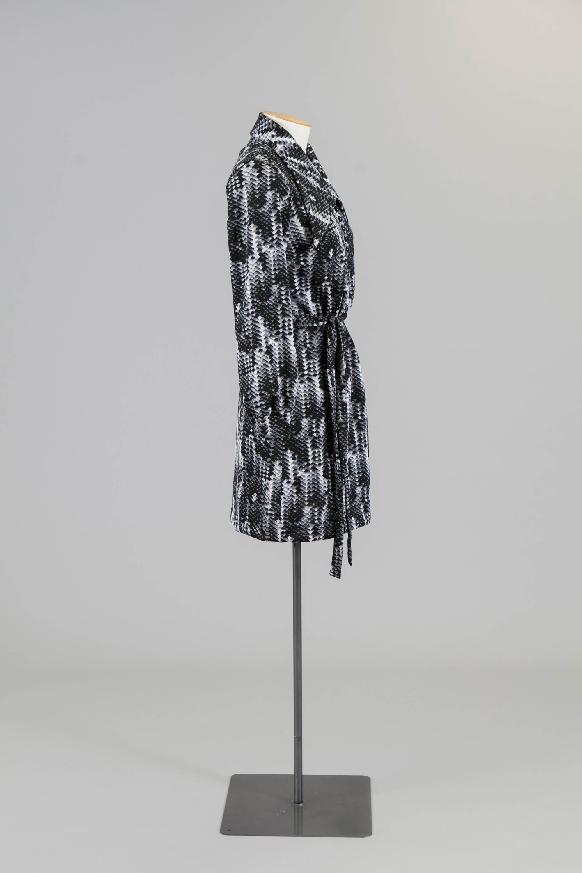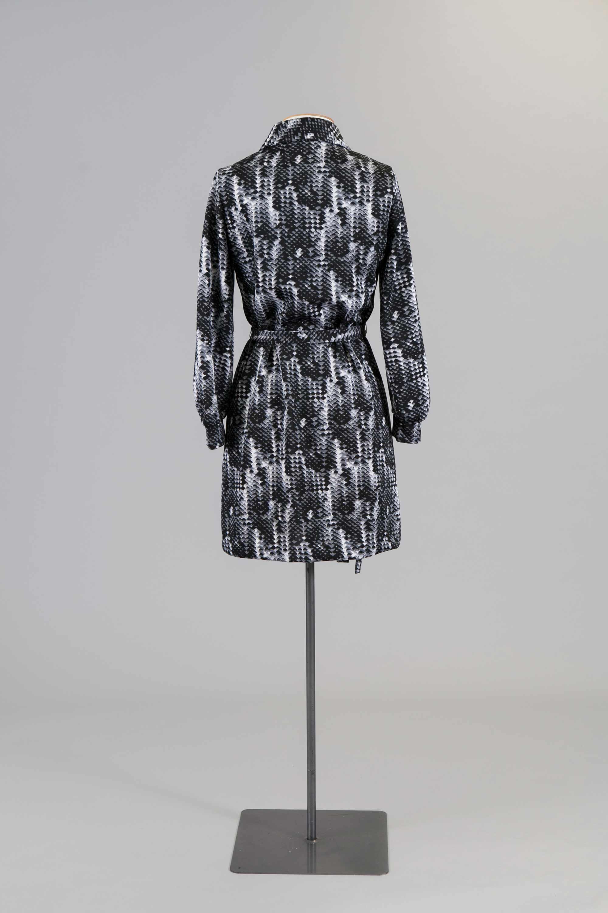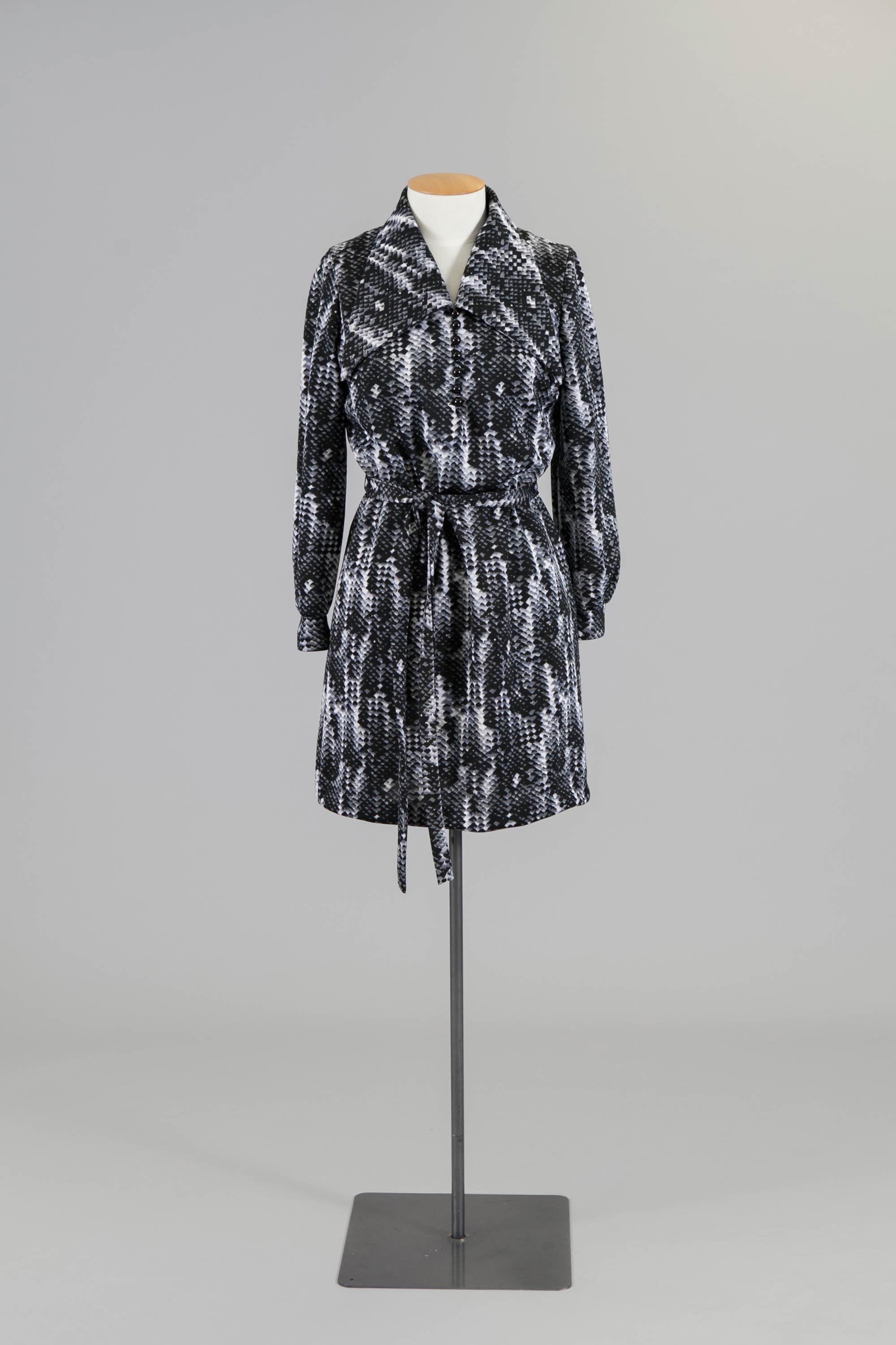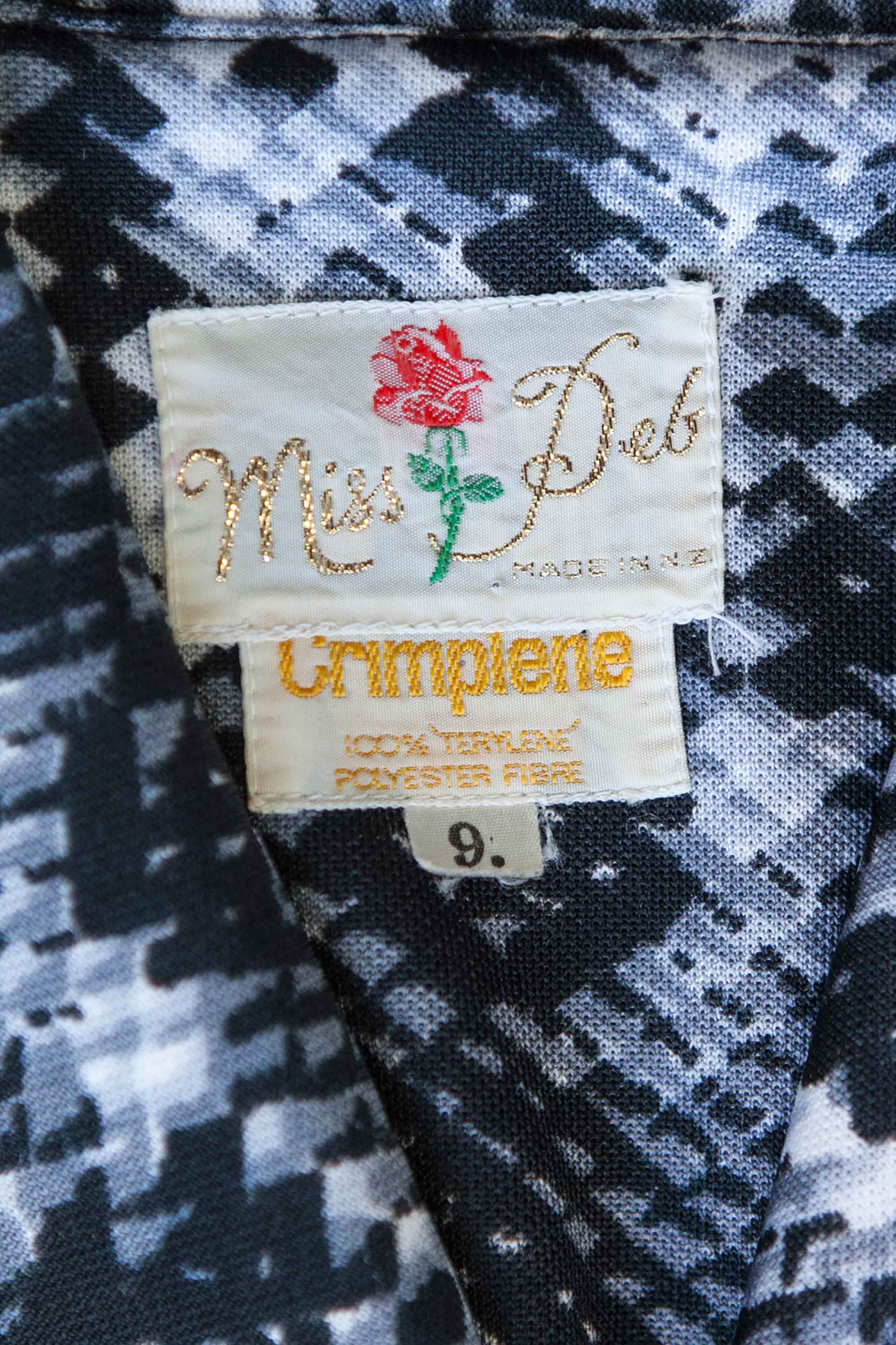 In the late 1960s, it was difficult for new manufacturers to obtain an import licence. Maurice Mihotich of Miss Deb worked with Levin's Levana Knitting Mill to develop this fabric. "We asked for a snakeskin print and they submitted a design to us which was very similar to the final manufactured fabric." The fabric was used to make a range of garments, including a one-piece jumpsuit. This tunic dress was originally paired with snakeskin print trousers.