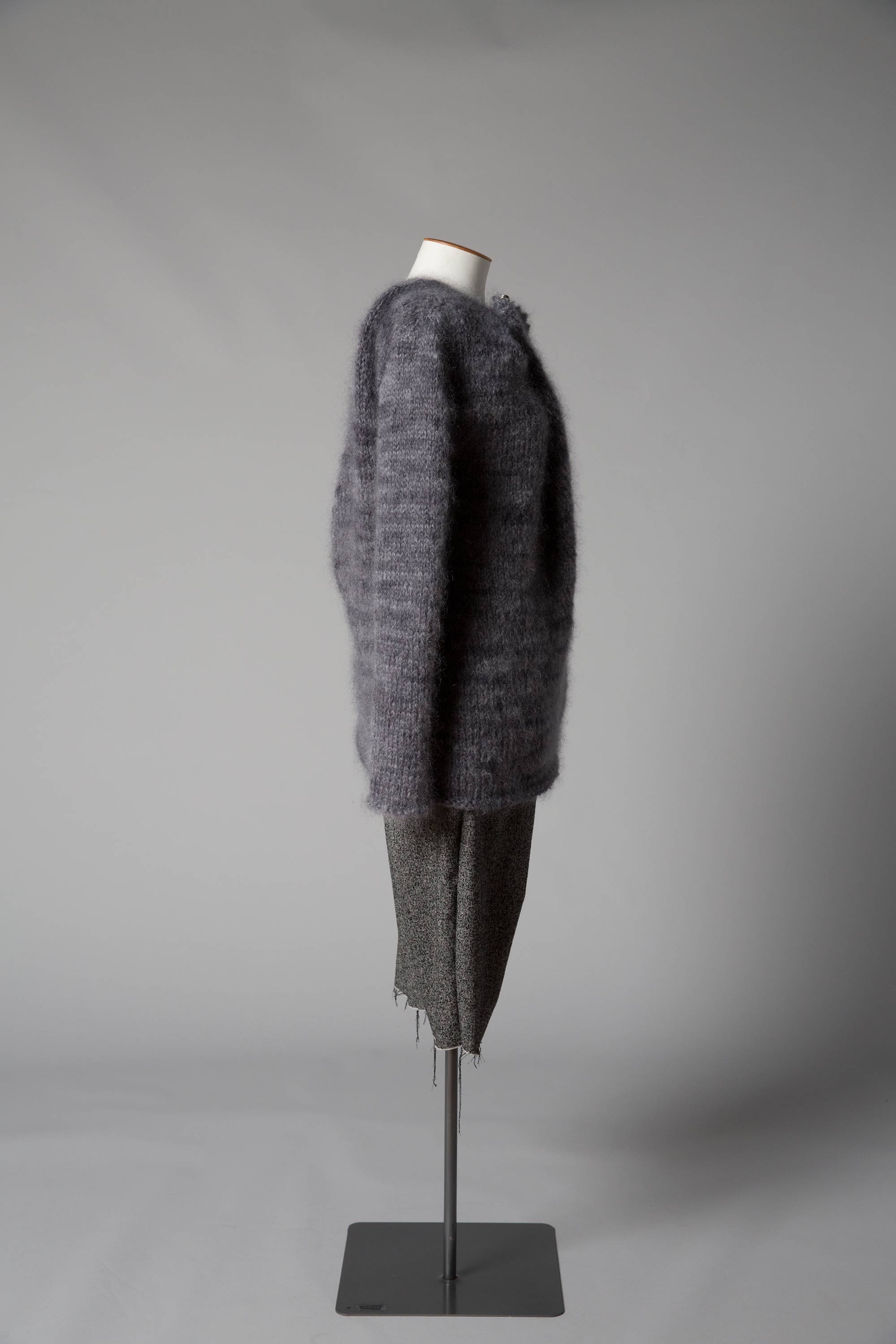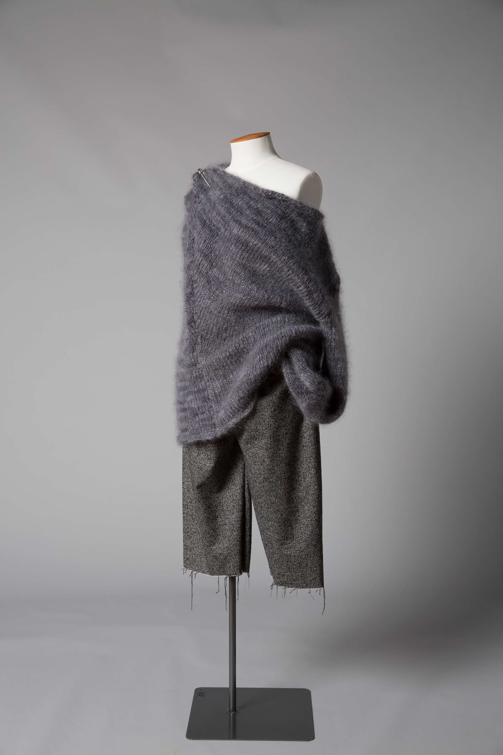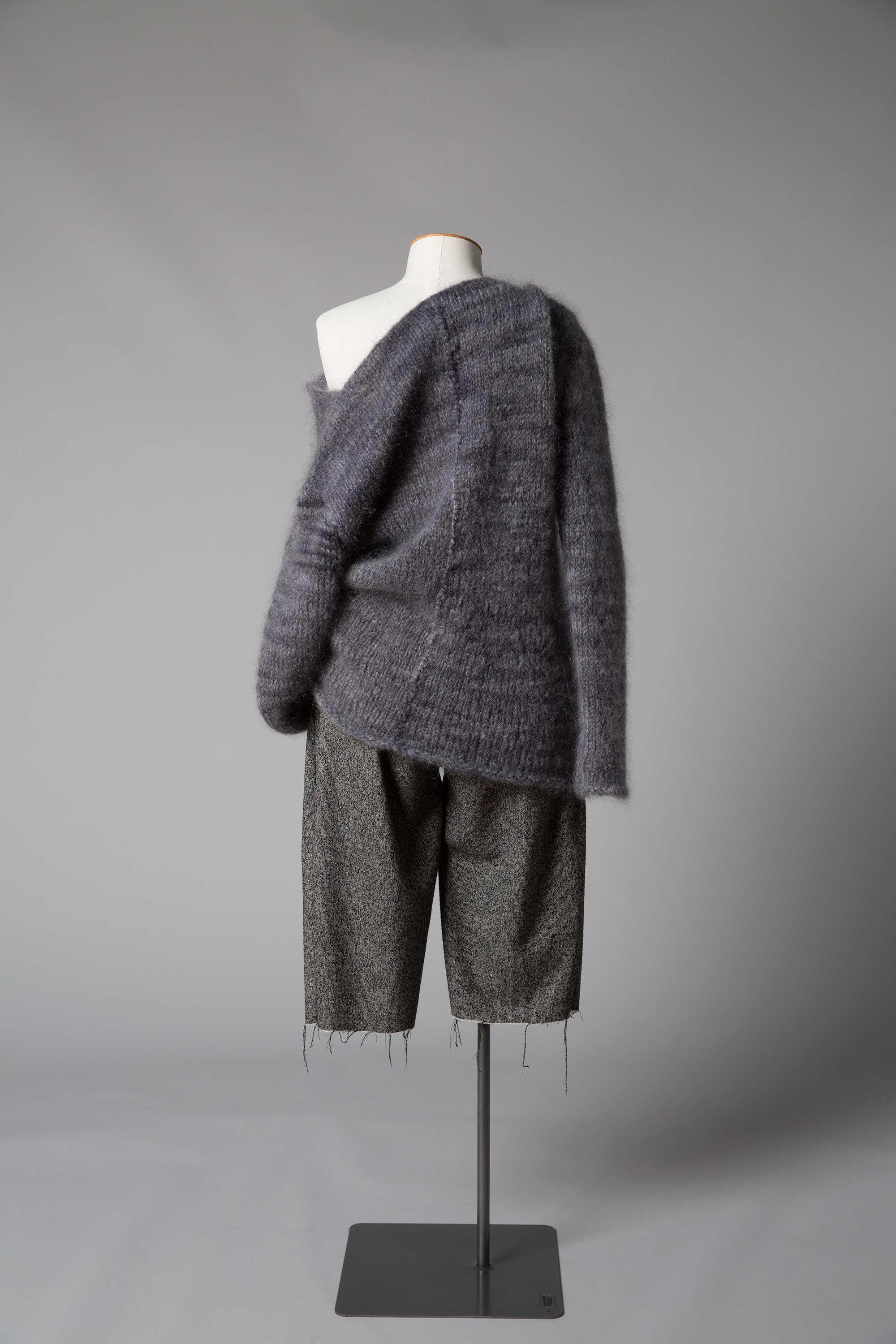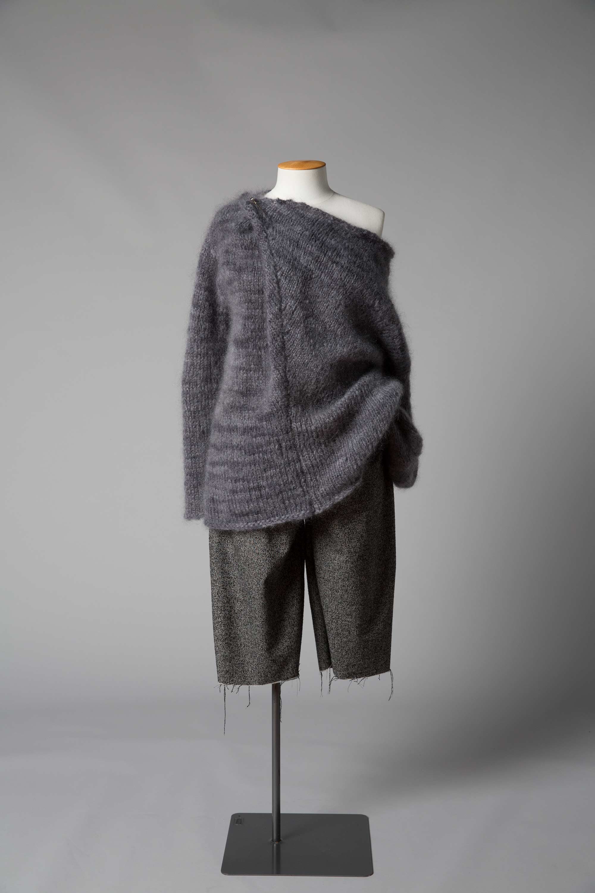 Anthea Tucker knitted this jumper with two wooden 10mm needles given to her by her grandmother. She used a "very basic" plain stitch. "I drew a flat pattern in miniature scale and measured in centimetres how big I wanted the hip width and the length through the body and went from there. Each piece that I knit starts in this way. I start out with a very loose approximation of how I envisage the end result but it makes the knitting process more interesting for me as I have no guide accept the 3D image in my mind of how I want it to look. Each yarn responds differently to the tension you apply, or the needles you use, and to me knitting is an organic process so controlling each angle to the millimetre feels very unnatural."