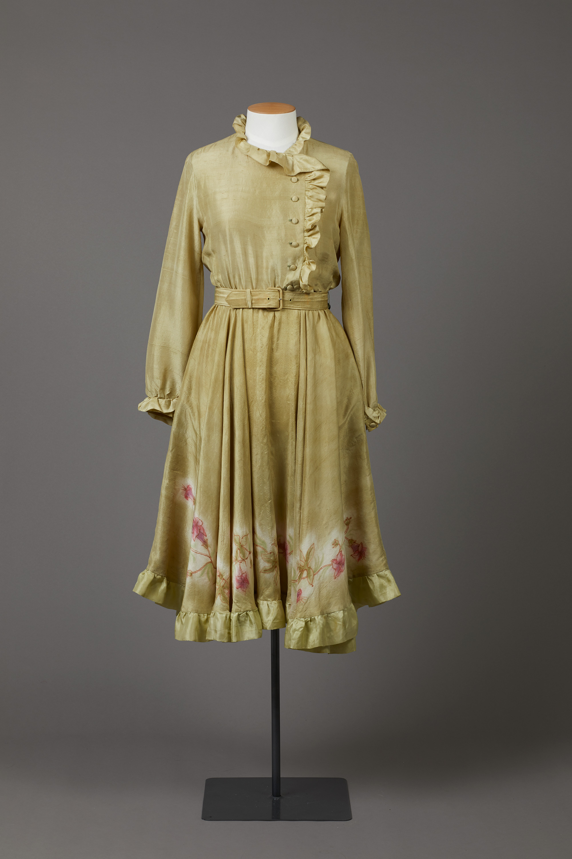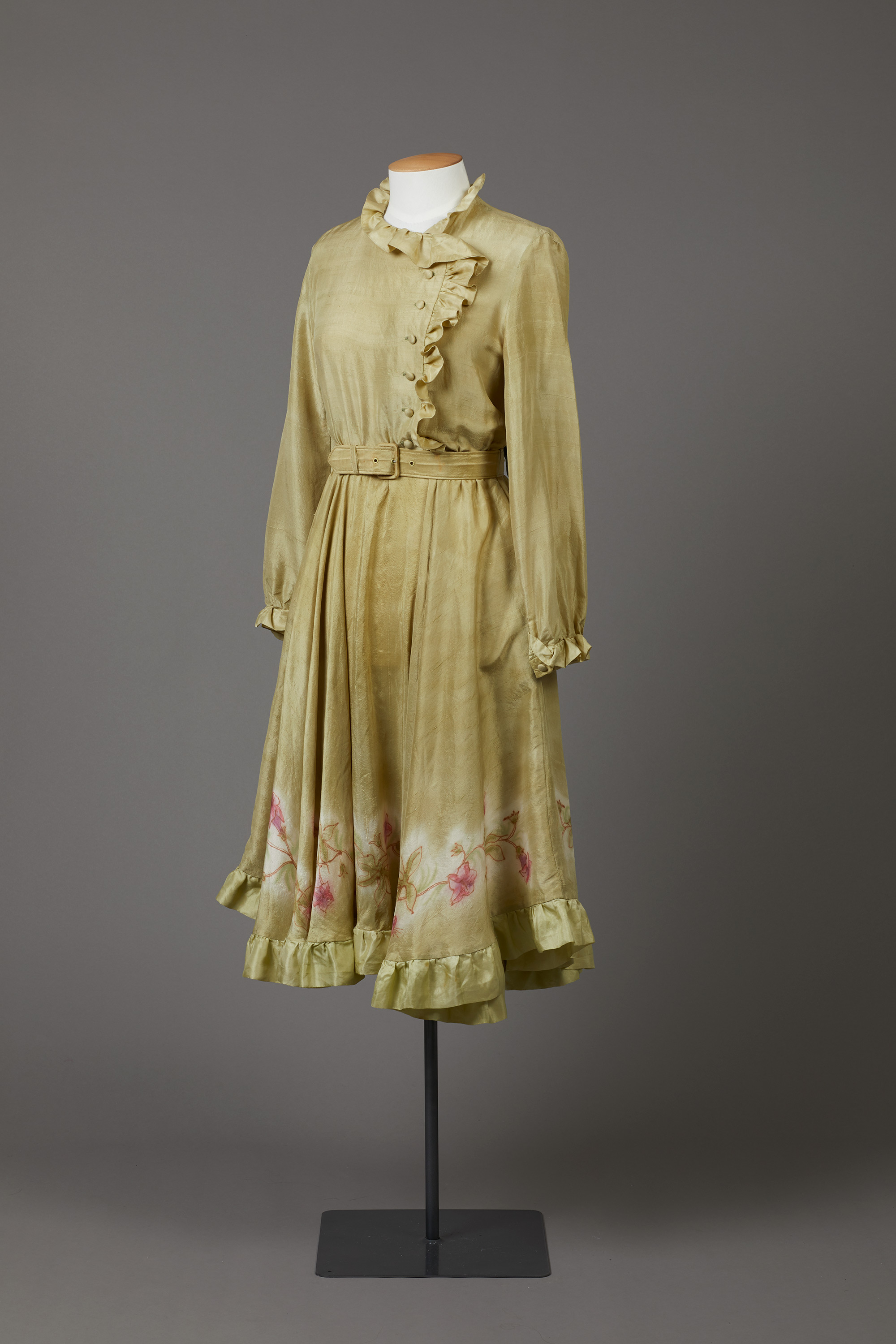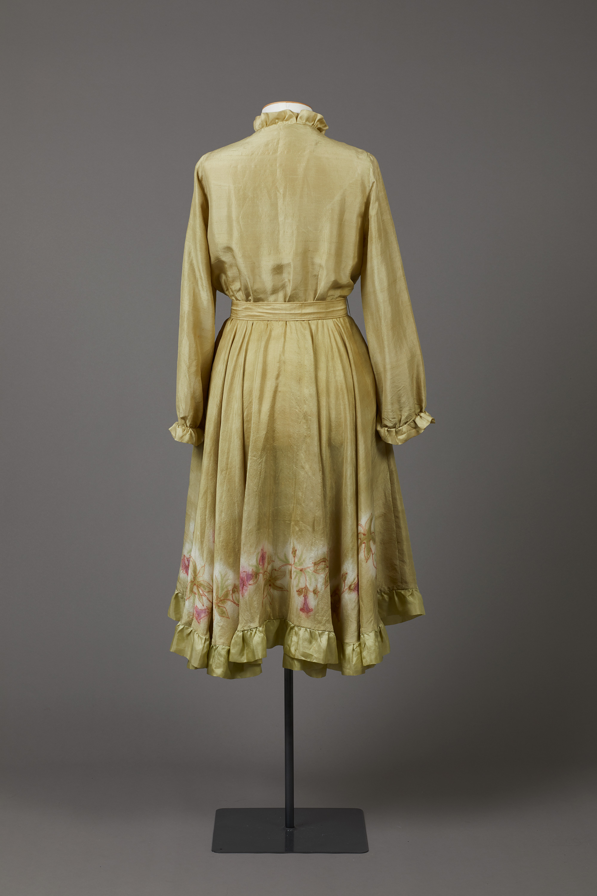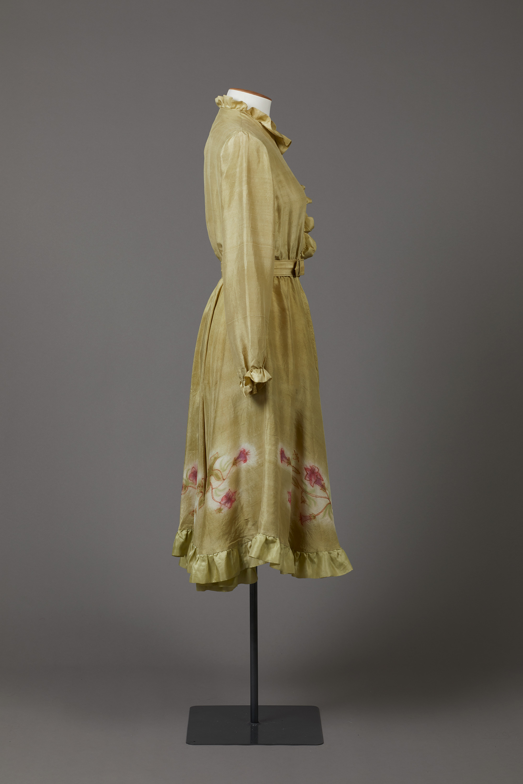 The dress is hand-painted then dyed around the painting. It has frills at the bodice, cuffs and hem and a self-fabric belt.