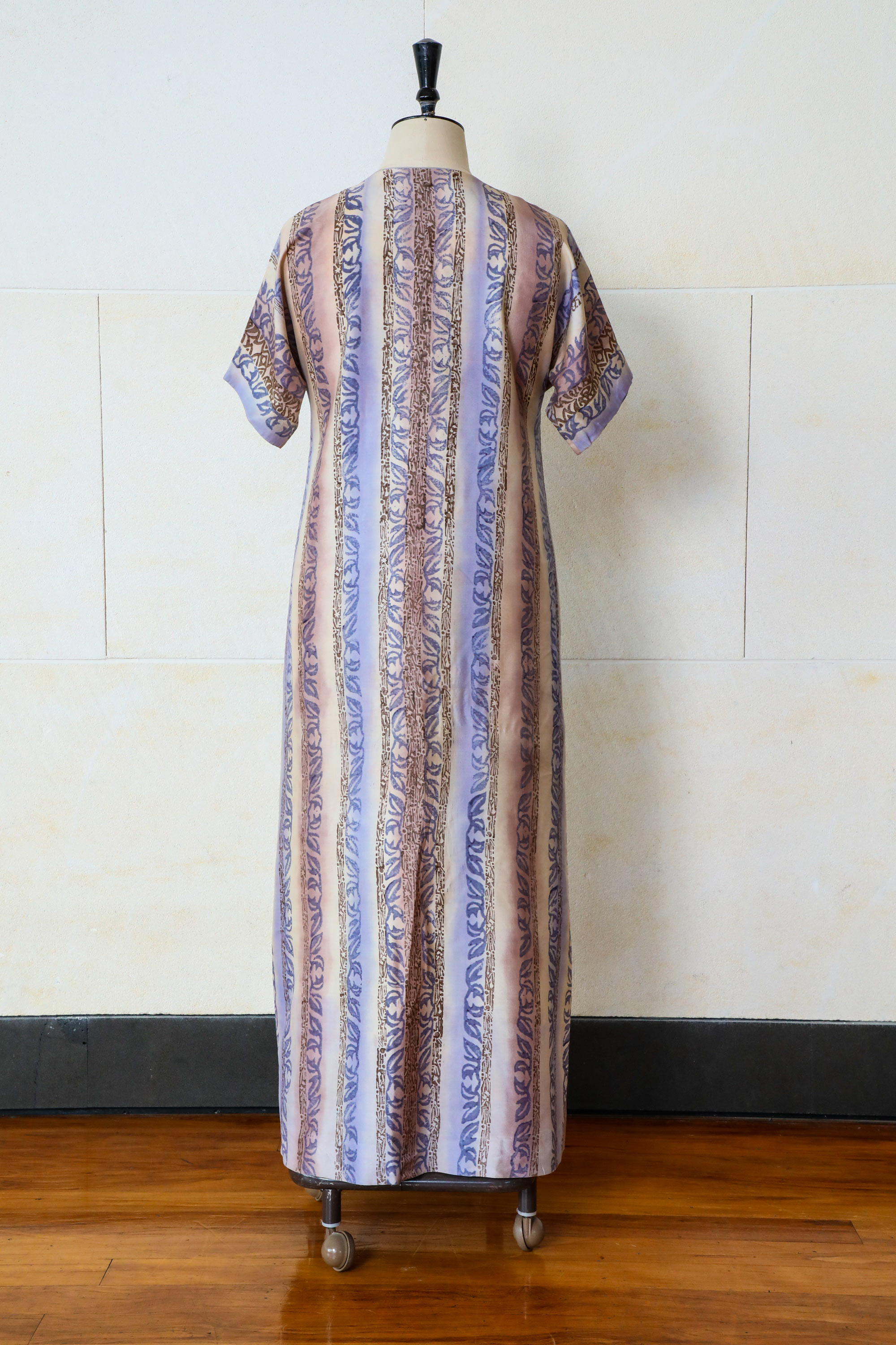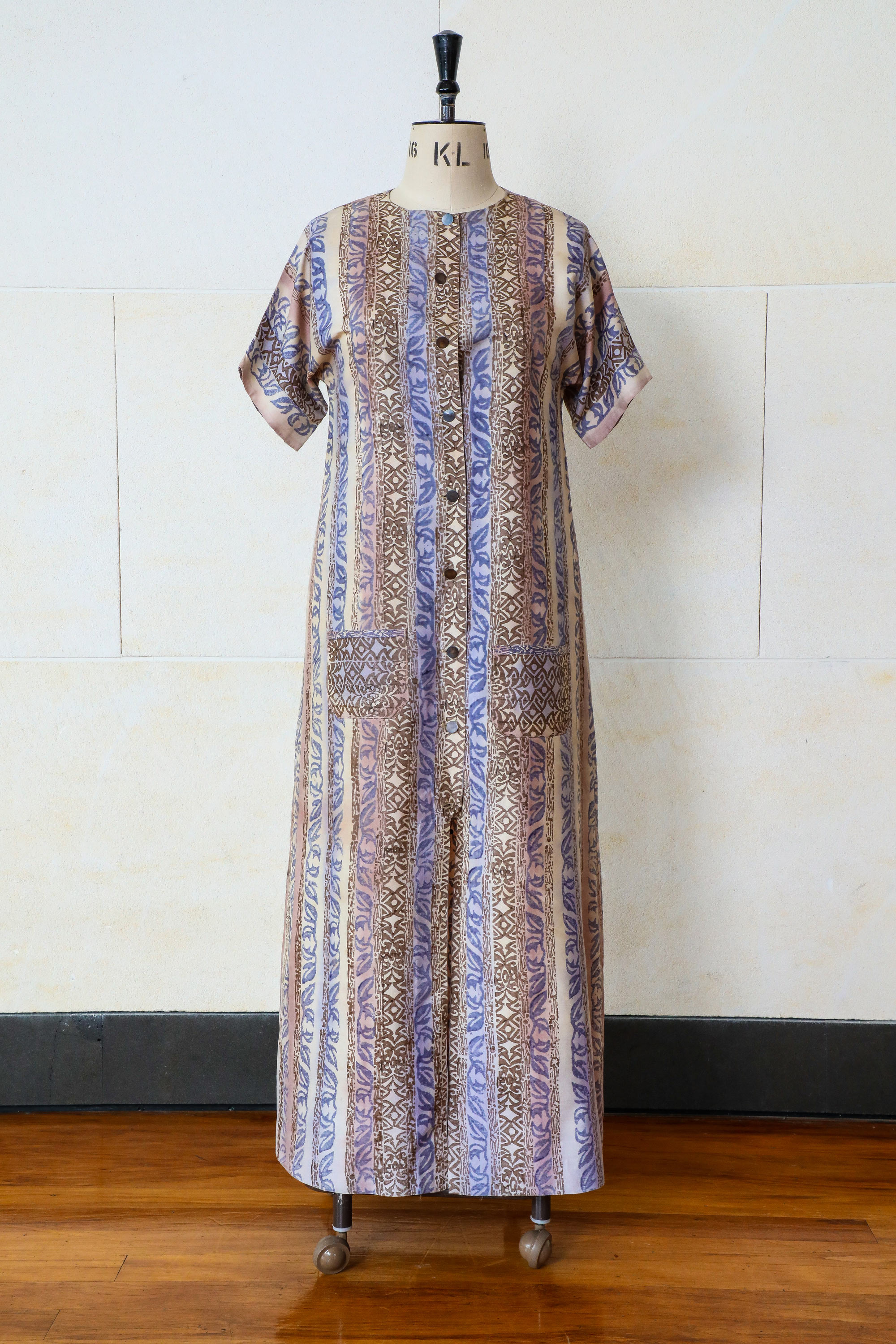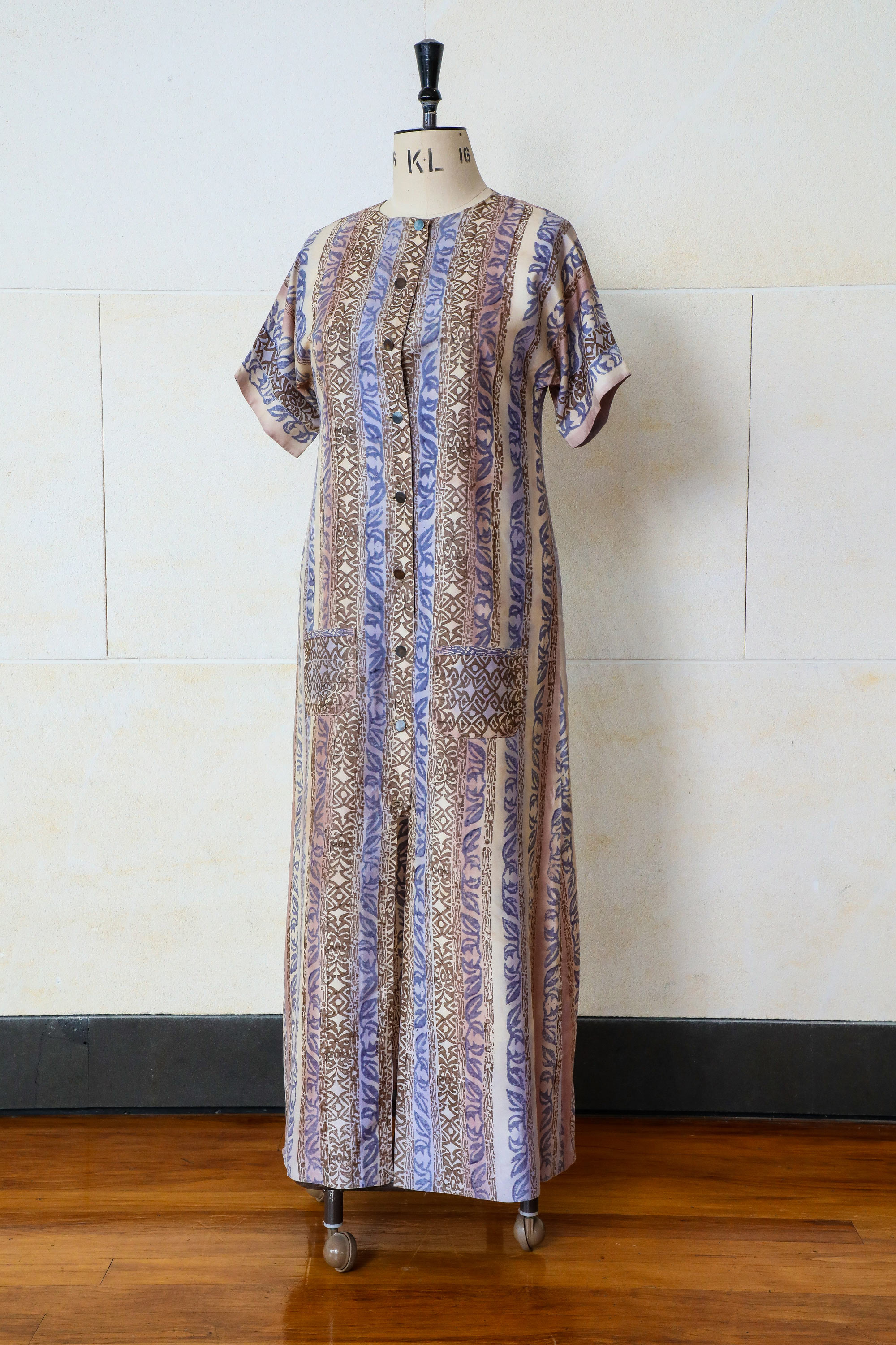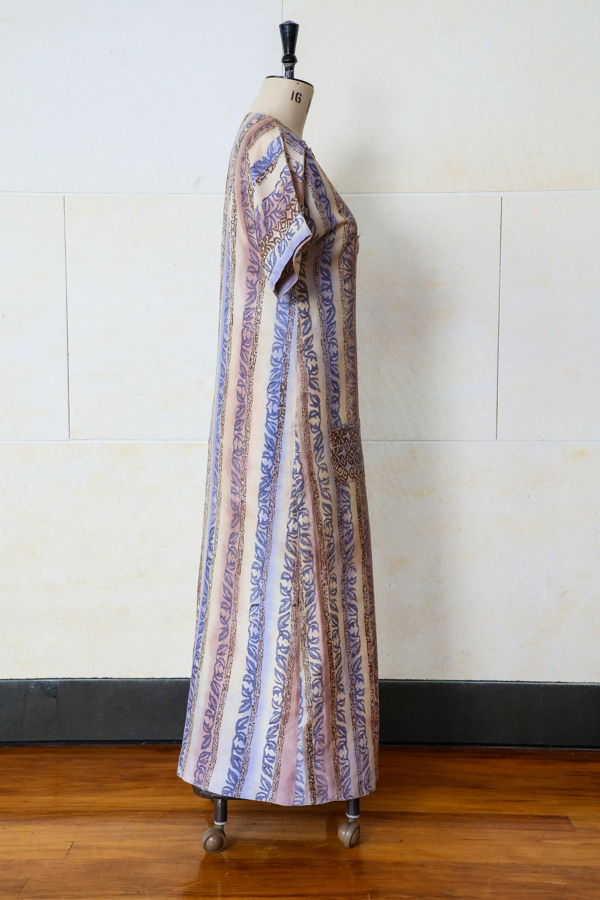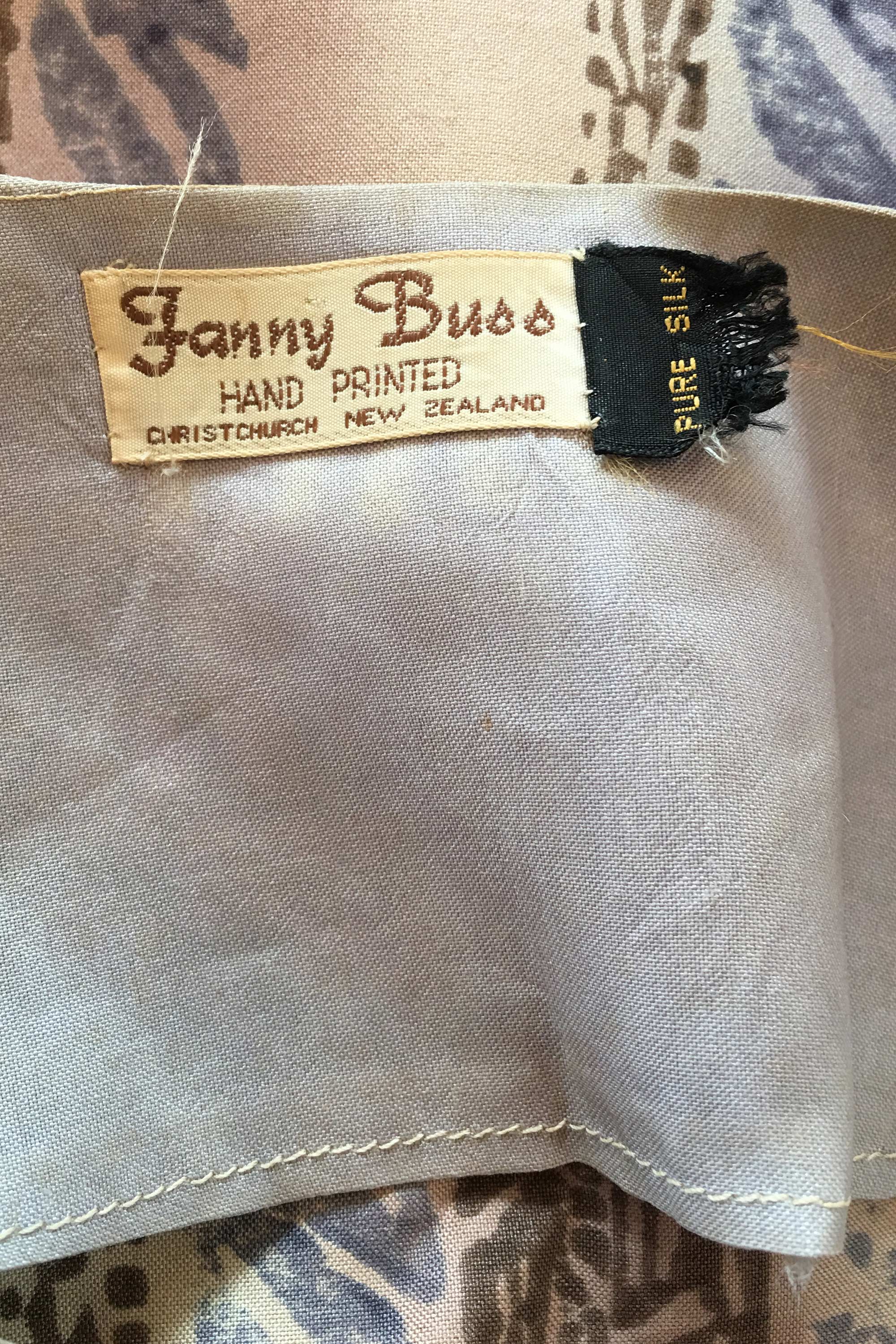 Helen Edwards and her mother Cecily Ann Buchanan bought Fanny Buss dresses before Helen's wedding in March 1973. Maureen Hitchings sold them at the ‘Cellar Crafts and Exhibitions Gallery’, located in the basement of jewellery firm Dawsons Limited in Dunedin’s Princes Street. Maureen’s discerning eye and artistic connections provided the gallery with its reputation for quality. This Fanny Buss dress was worn by Cecily, as mother of the bride. Helen notes that they also received many wedding presents, "still of practical and artistic value", purchased from the shop she knew as 'Dawson’s Basement'. "It is not surprising so many presents came from there, as Michael Hitchings, the Hocken Librarian, was my boss, and guests with library connections chose to visit Maureen for help with their selections."