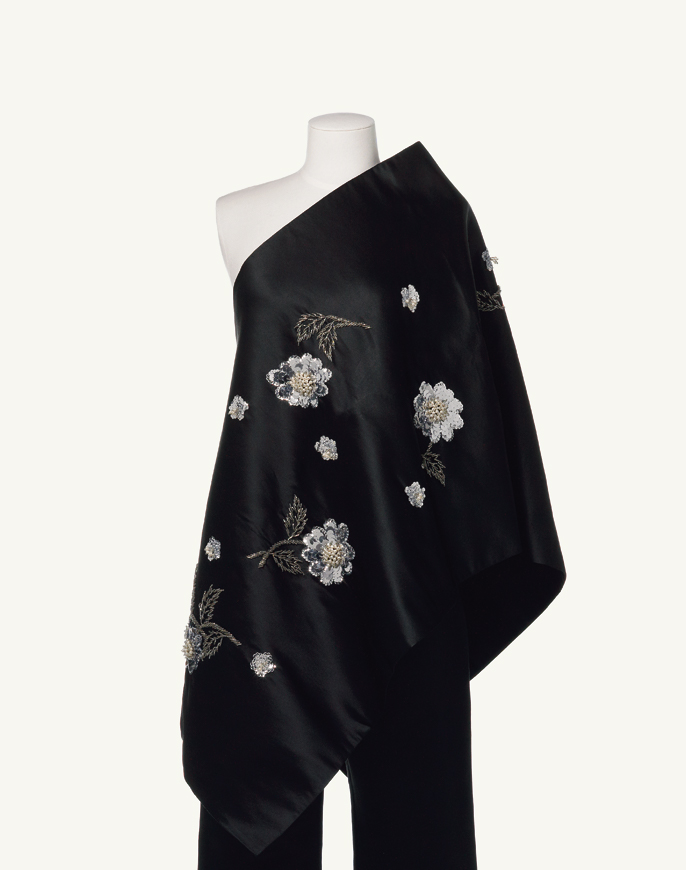 This shawl is from Sharon Ng's Chinoiserie collection, A/W 2003. The Christchurch designer set up her label, NG, in 1993. Sharon loves beautiful and finely crafted pieces. As a girl she was fascinated by her mother's wardrobe with its embroidered, silk sequinned cheongsams, and their more casual woollen and silk versions. Ideas for some of Sharon's more formal designs were seeded here.
