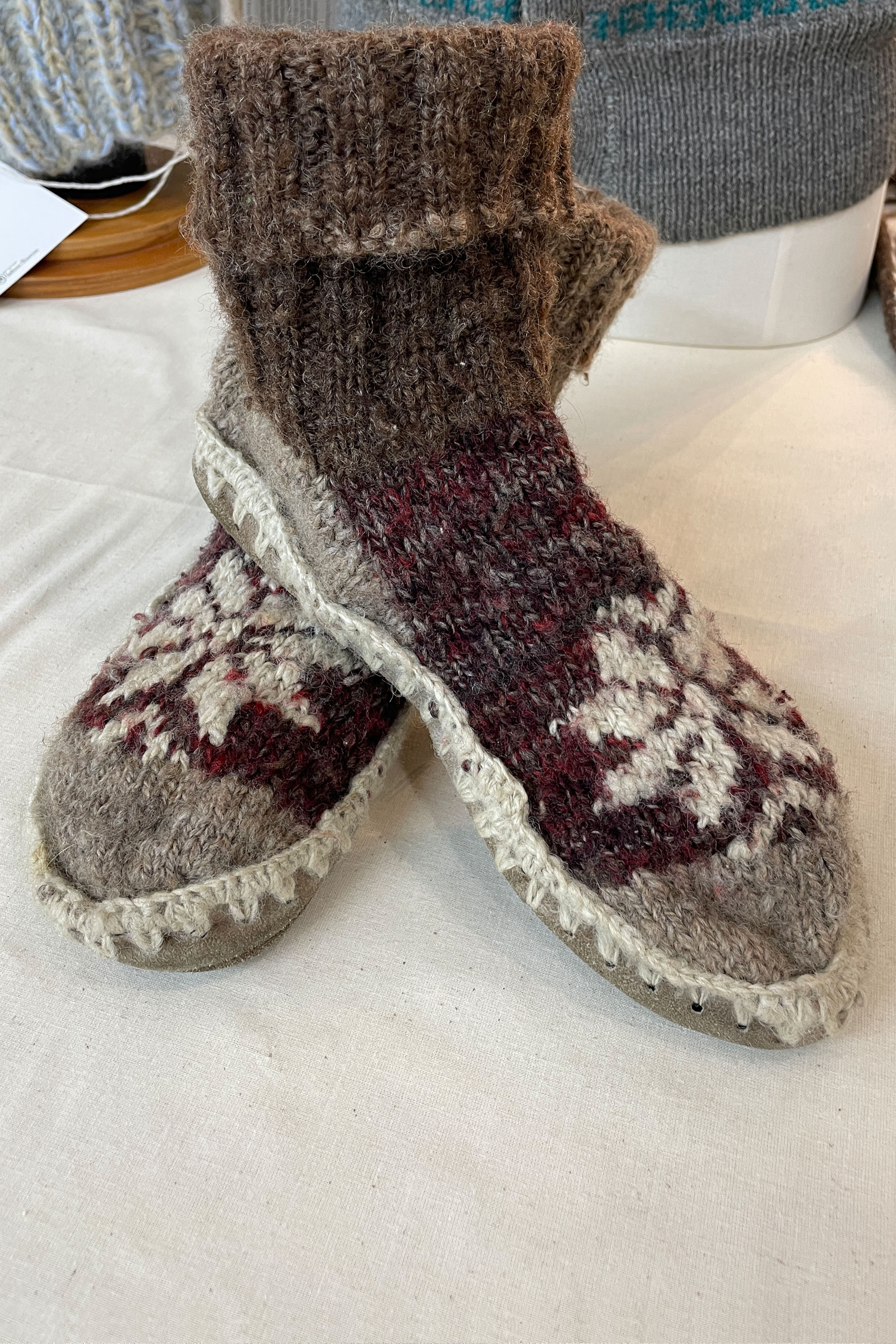 Ribbed sock-like ankle, fair isle motif on vamp, suede sole attached with crochet stitching