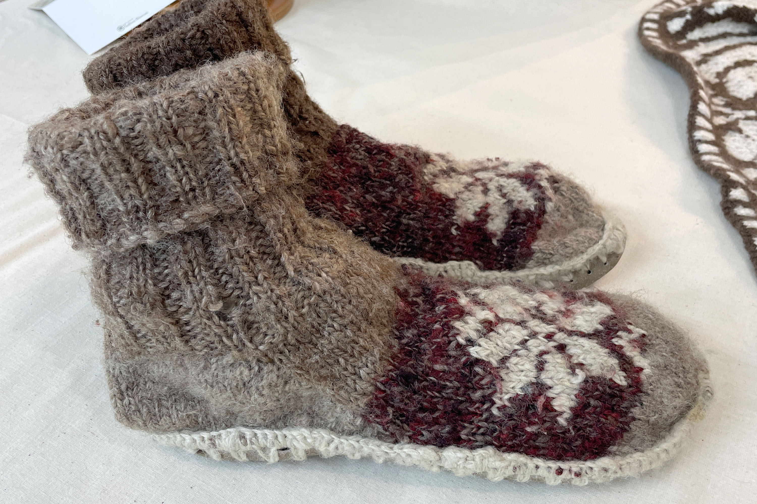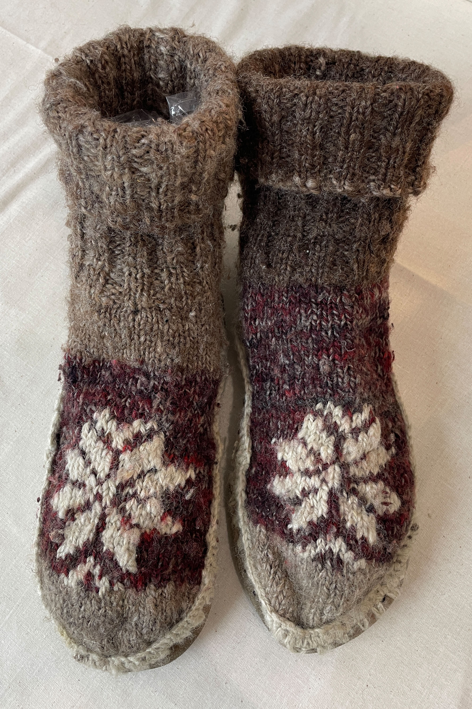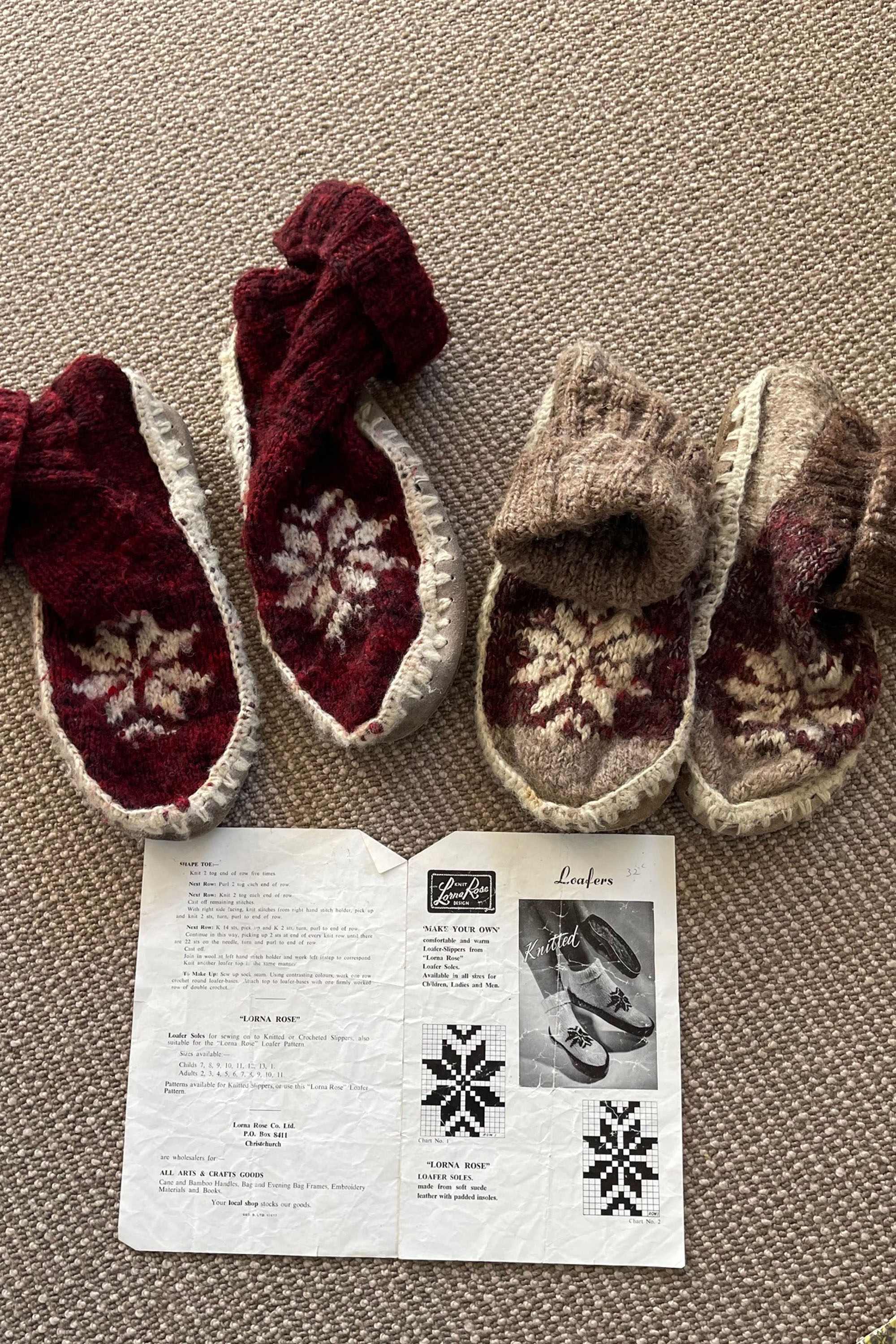 Like most of her generation, Diana Fletcher's mother, Mary Parrish learnt to knit as a child but taught herself to prepare fleece and spin in the 1970s after ending up with an Ashford spinning wheel. She crafted everything in her own very ‘hand spun’ style - it was just luck if the item she made happened to fit. These slippers for her son-in-law David are one of two pairs made in the 1980s from a 1950s pattern.