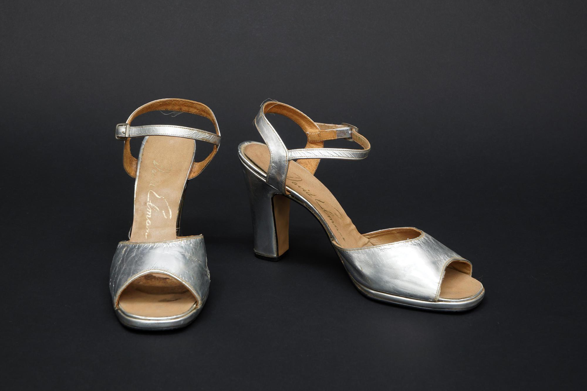 The shoes have peep toes, a slingback strap that joins a buckled strap over the foot and a tapering heel.