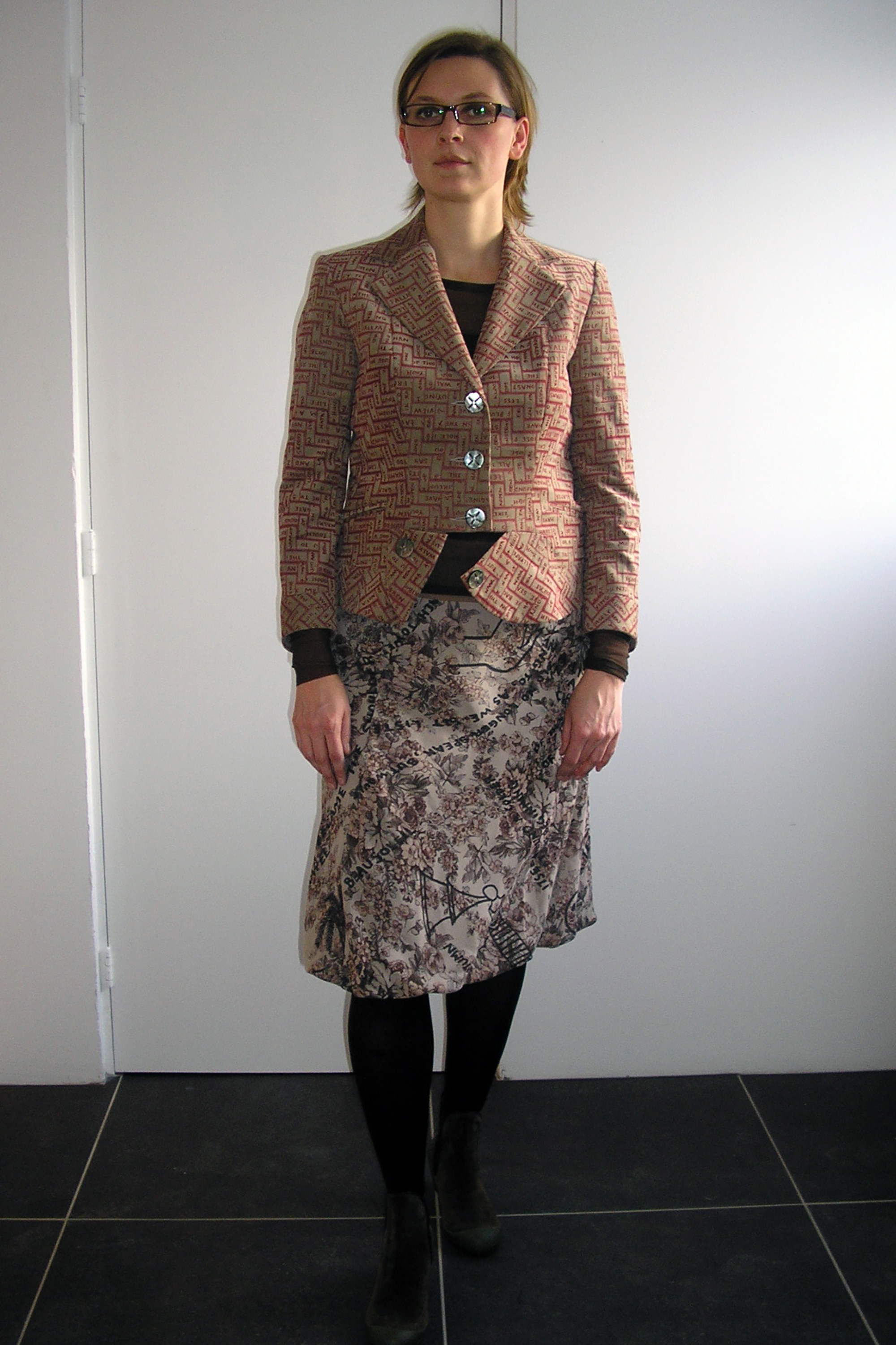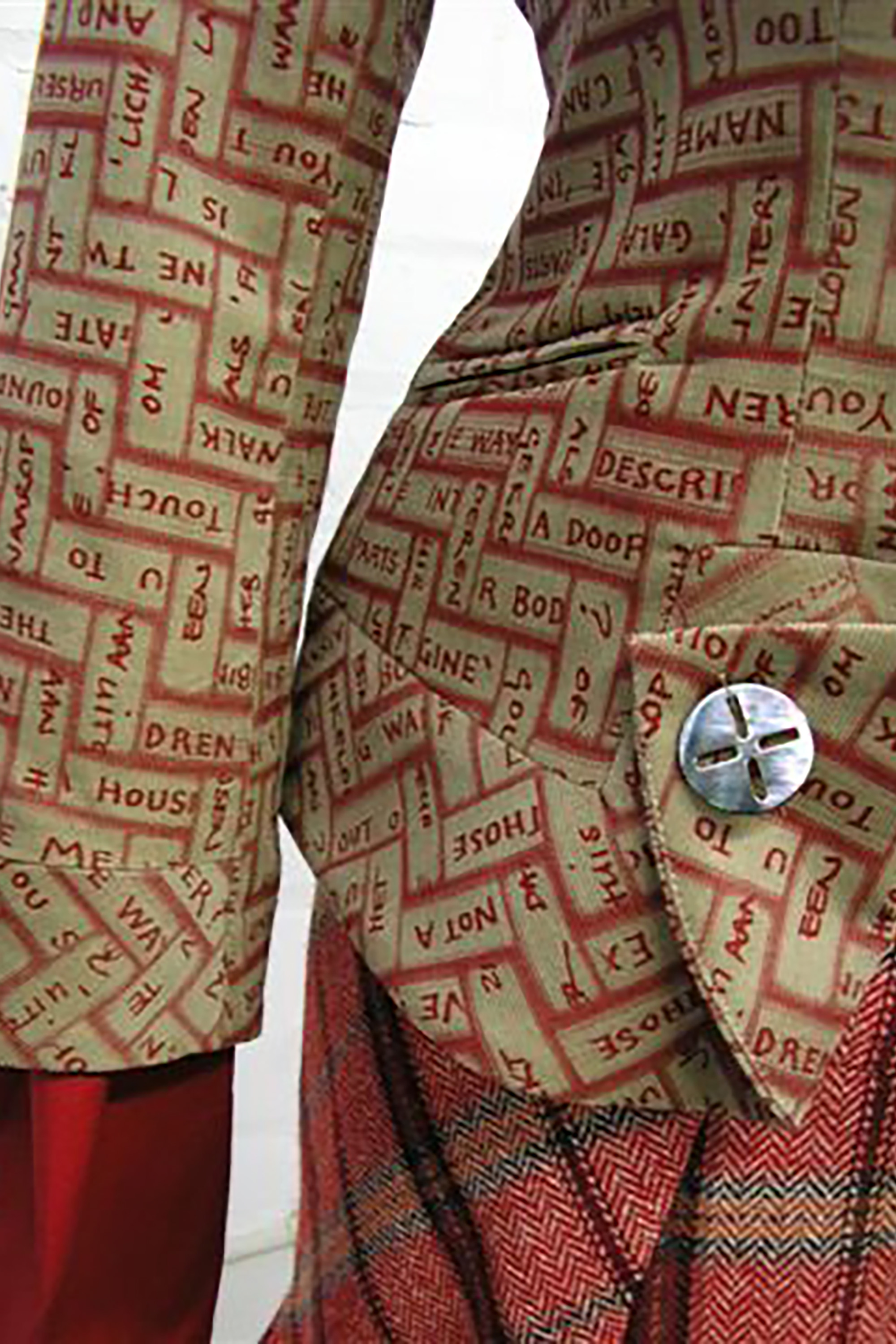 With the re-launch of her label in 2003, Doris de Pont began to collaborate with artists to create signature fabrics for each collection. For the winter 2006 collection, Beausoleil, she worked with Wellington poet Gregory O’Brien. One print from the collection combines a woven flax motif and English and Dutch words from Greg O'Brien's poem 'House and Children'. The poem was translated into Dutch for Greg's reading at the Poetry International Festival in Rotterdam in 2005. "Using words in art is a very New Zealand thing to do, and I wanted to explore using words in fashion," explains Doris. "The fun part of this collection is when you cut the fabric into garments it breaks up the words and creates unpredicted meanings. The letters are both decorative images and meaningful symbols. It is quite fascinating." Greg agrees. "I like the idea of someone walking around inside a poem. Maybe these garments could be called 'kinetic poems', making their way through the world, changing all the time, depending on who is wearing them, what they are doing and on the conditions around them: shadow, wind, weather…" The women's jacket was named 'COR 831' and the men's jacket 'MEN 835' - tongue in cheek reference's to the Dewey Decimal Classification used in libraries.