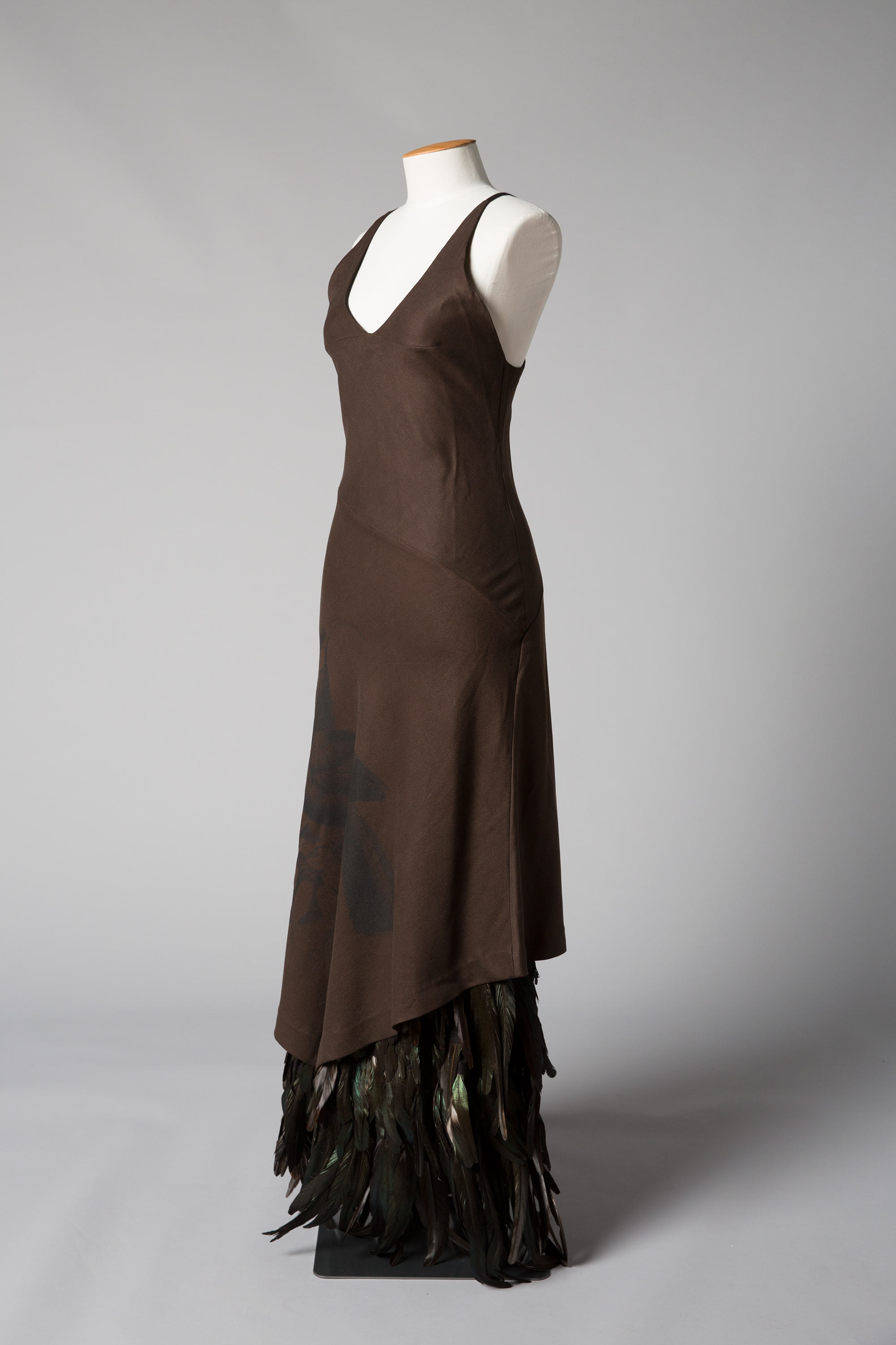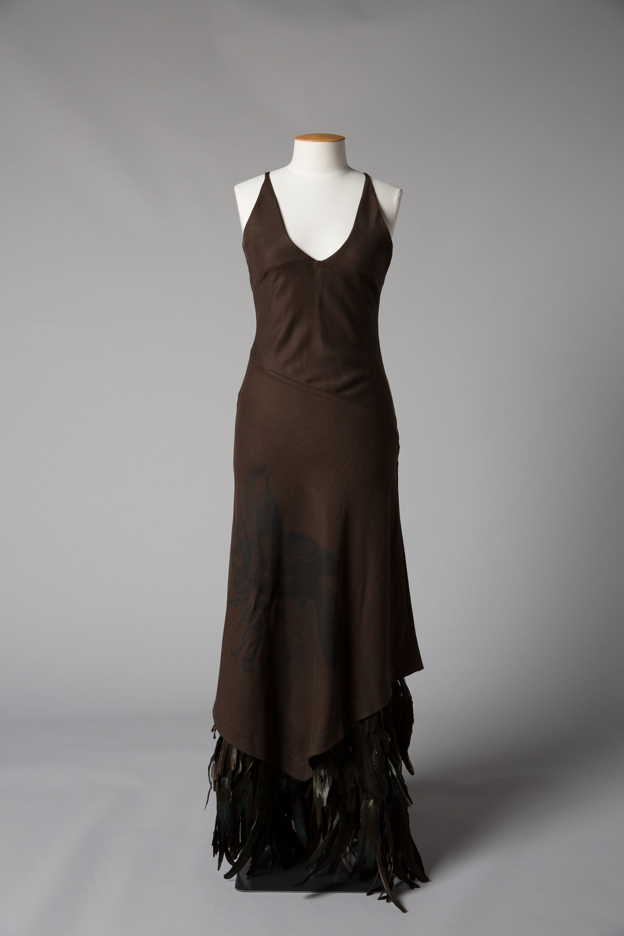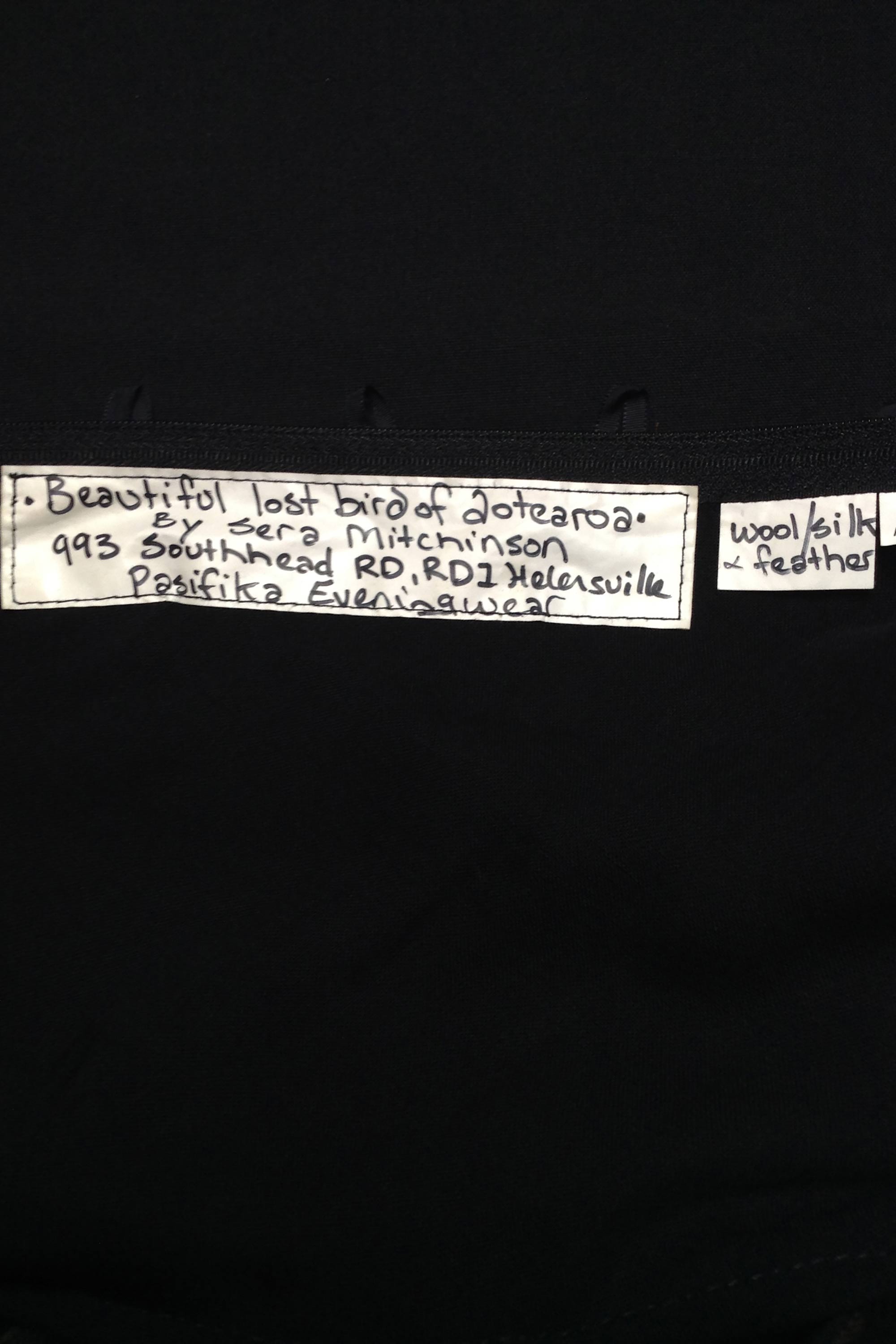 The dress is screen printed with a faded shadow of a Huia and there are rows of feathers attached to the hem.
