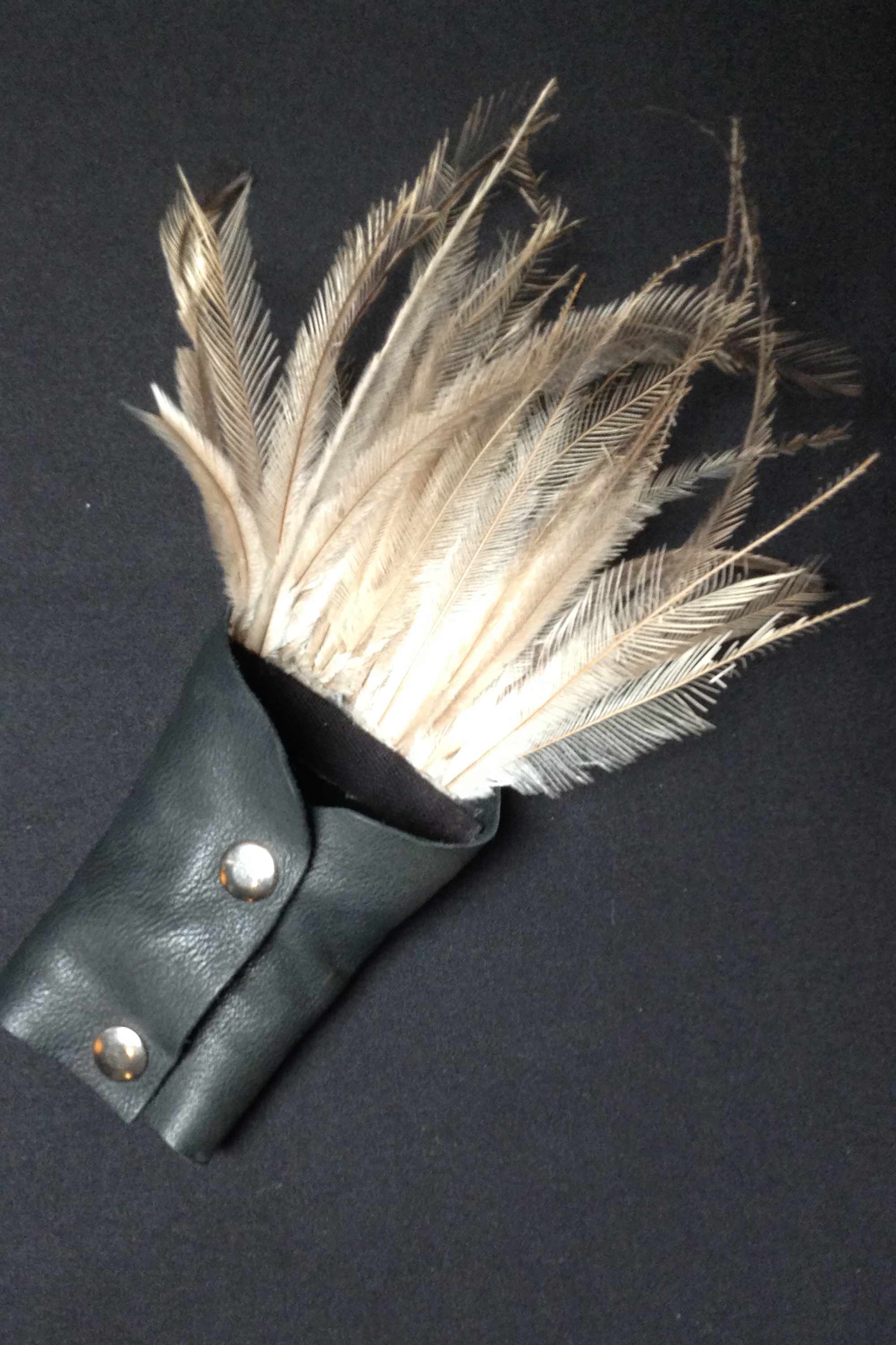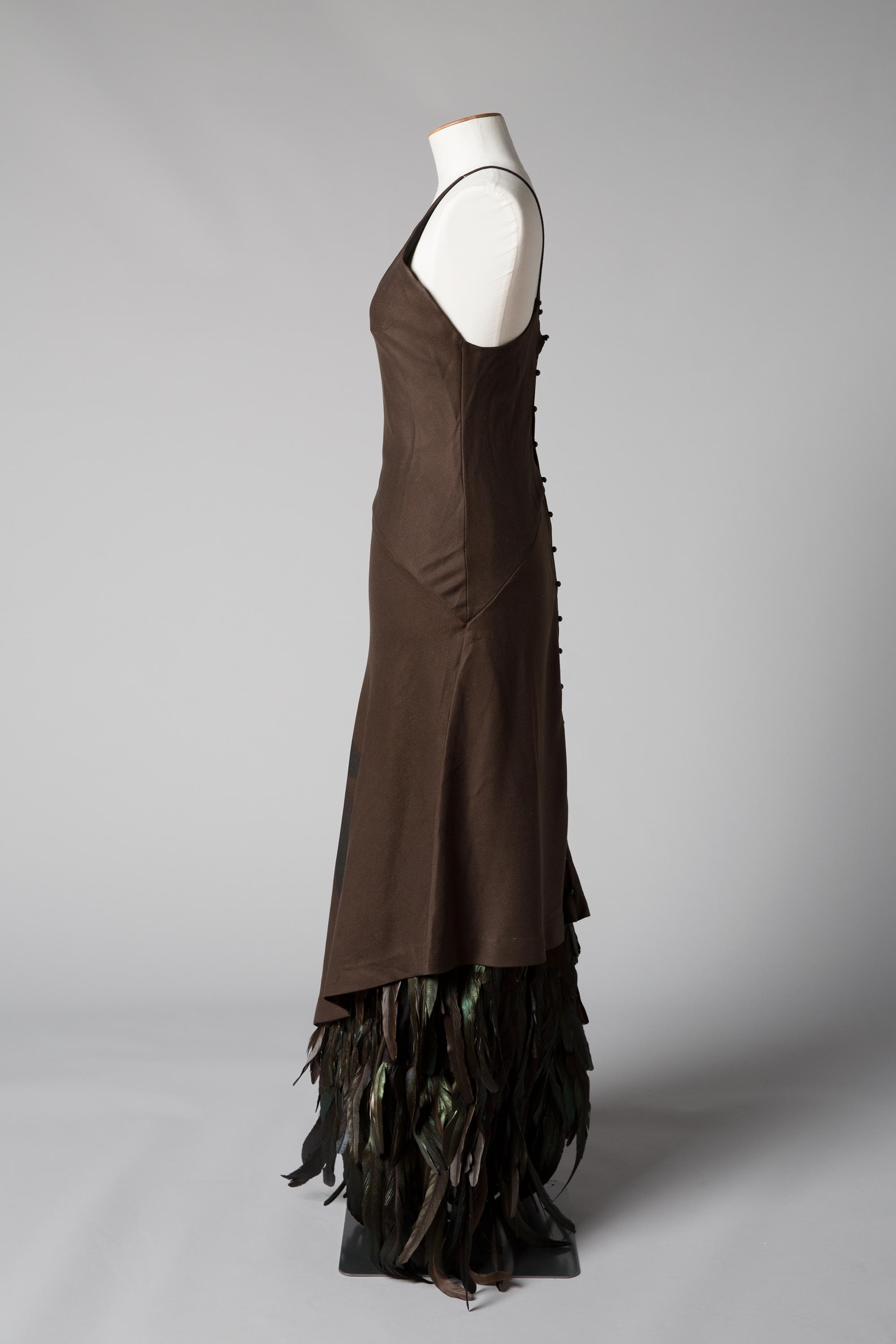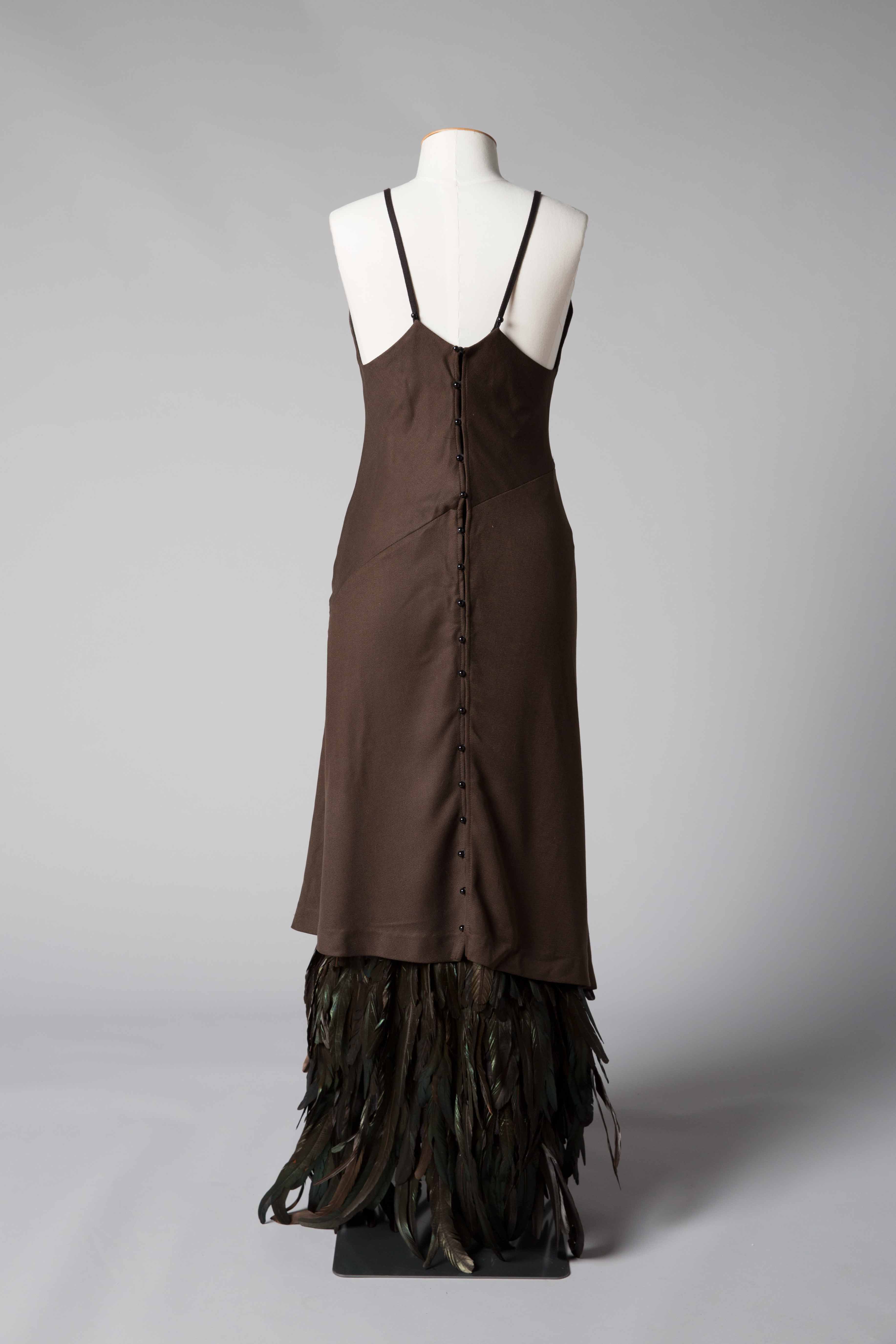 The dress is screen printed with a faded shadow of a Huia and there are rows of feathers attached to the hem.