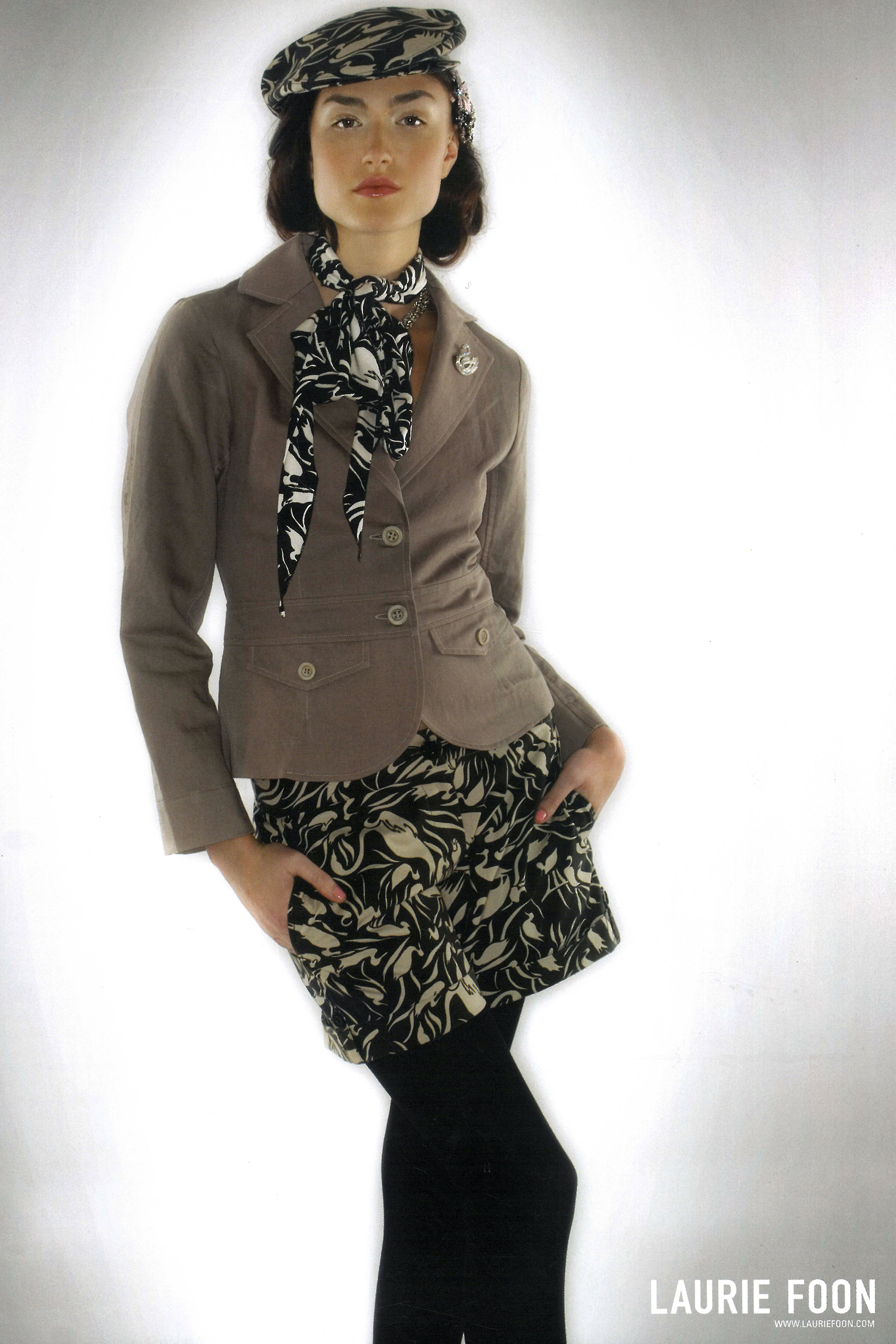 These Laurie Foon shorts and accessories are made from fabric that reproduces a work by post-war textile artist Avis Higgs. Avis' 'Duckpond' design, inspired by a visit to Wellington Zoo, was renamed 'Black Swan' by designers Laurie Foon and Carleen Schollum for the 2005/06 summer collection. Laurie Foon opened Starfish Boutique in Wellington's Willis Street in 1993. She introduced her Laurie Foon label in 2003, which she sold alongside the established Starfish range.