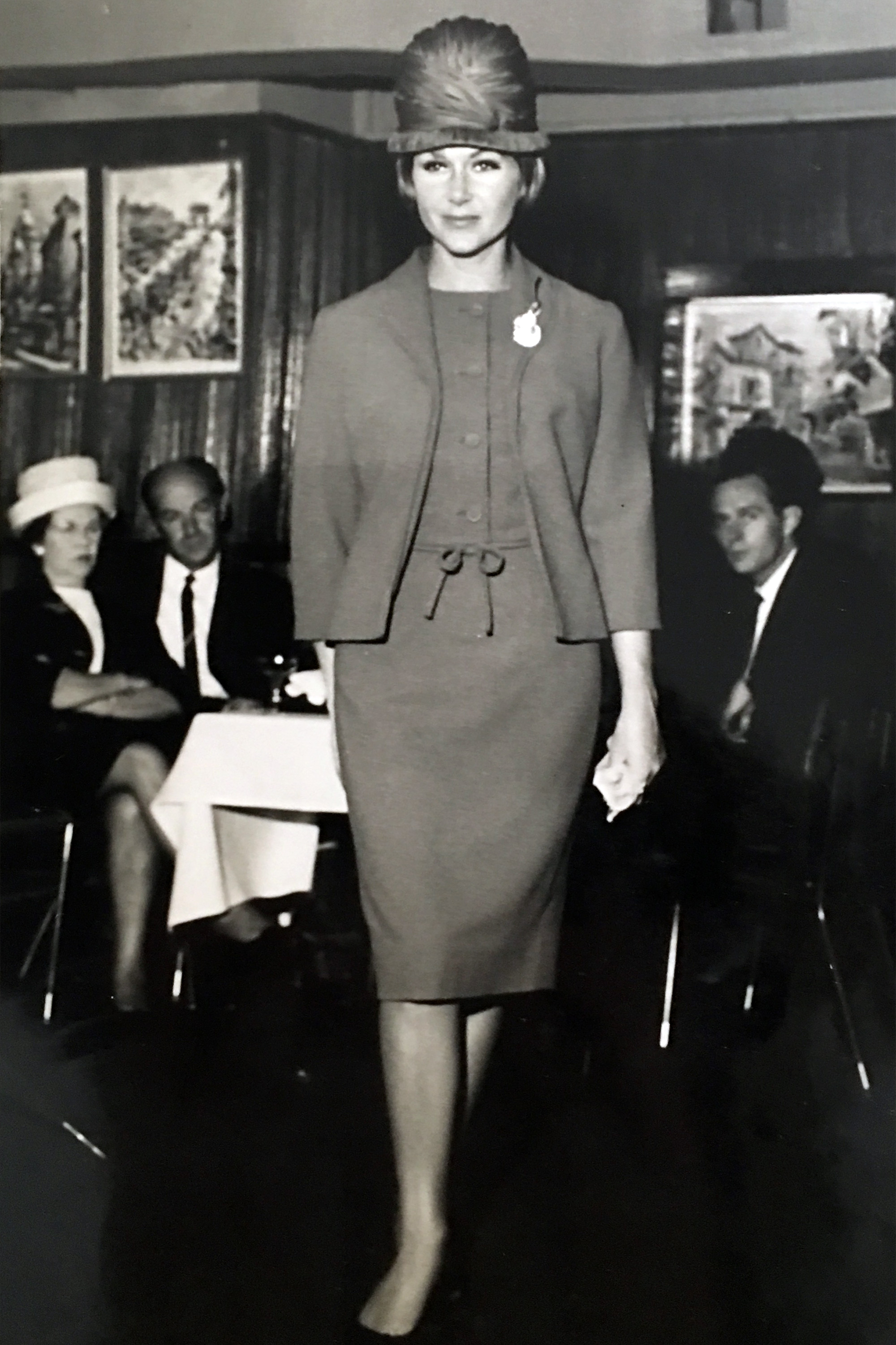 Barbara Herrick showed her Babs Radon winter 1964 collection at La Boheme - a restaurant in Wellesley Street, Auckland. Seated at the table are three representatives from Smith & Caughey's, including Dennis Caughey on the right.