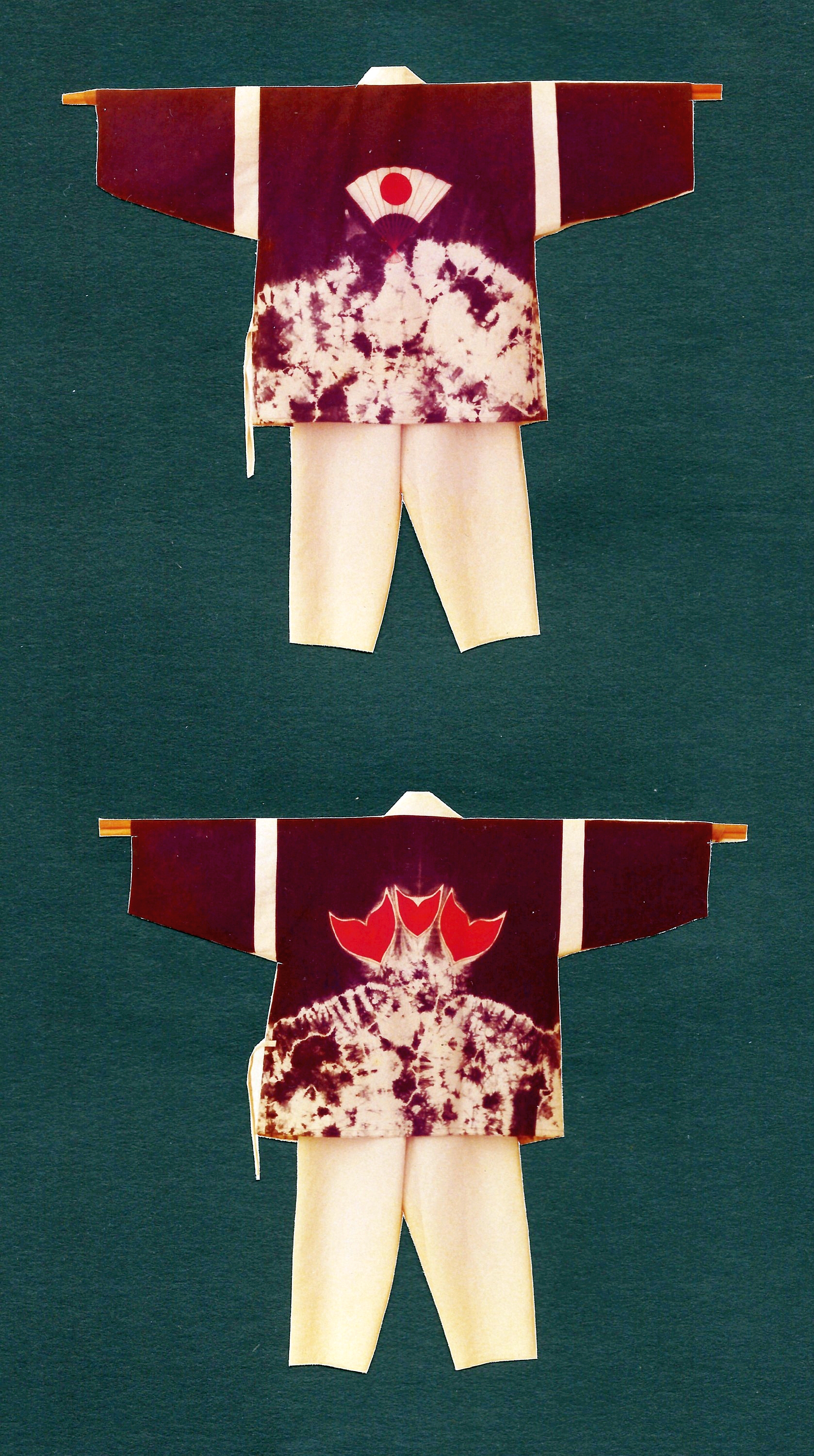 Fabric artist and wearable art designer Louisa Simons usually worked with silk but cotton canvas was another favoured medium. For these cotton canvas traditional Japanese Hippari jackets and Monpei pants she employed Itajimi Shibori dyeing and tie-dye techniques.