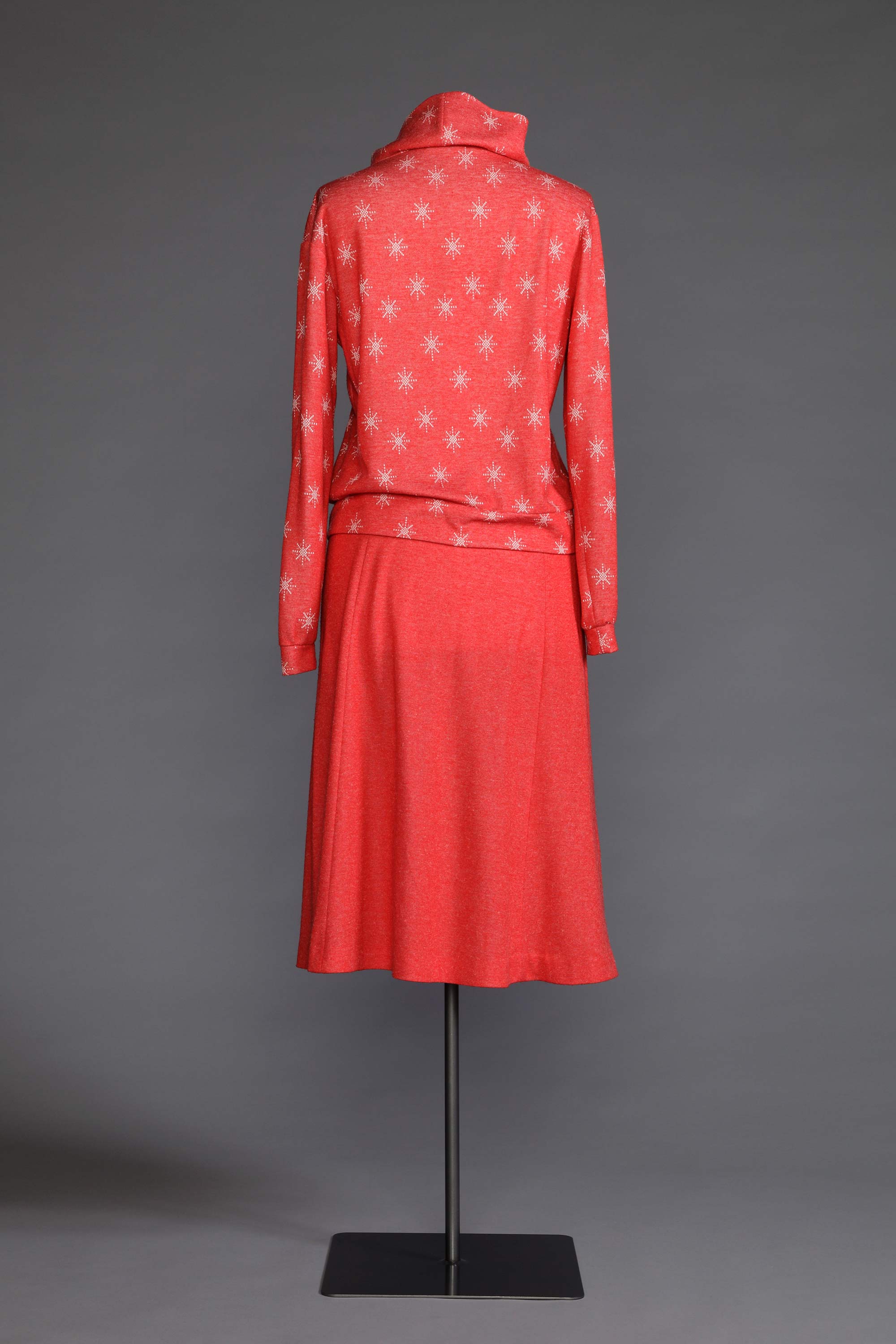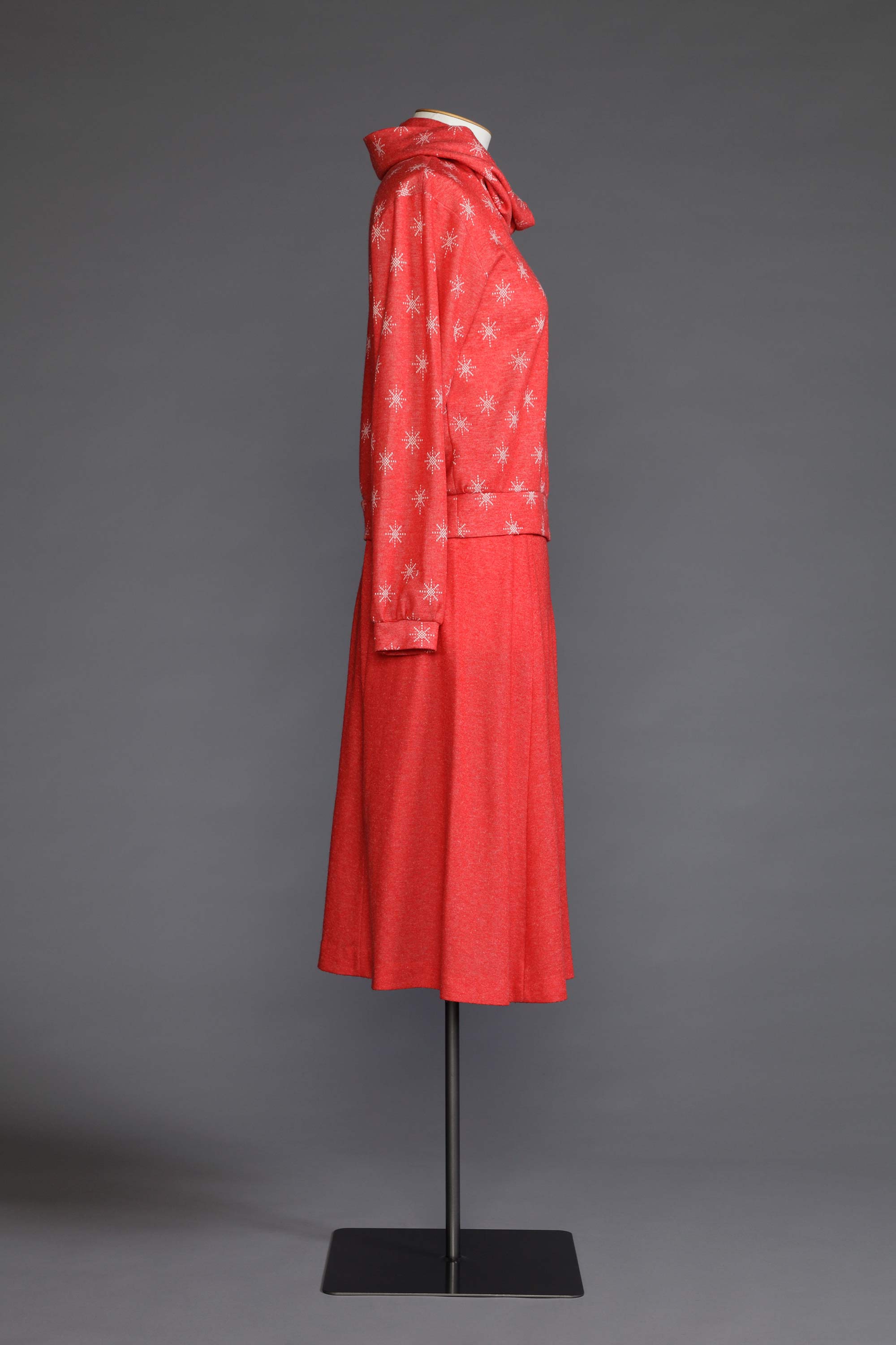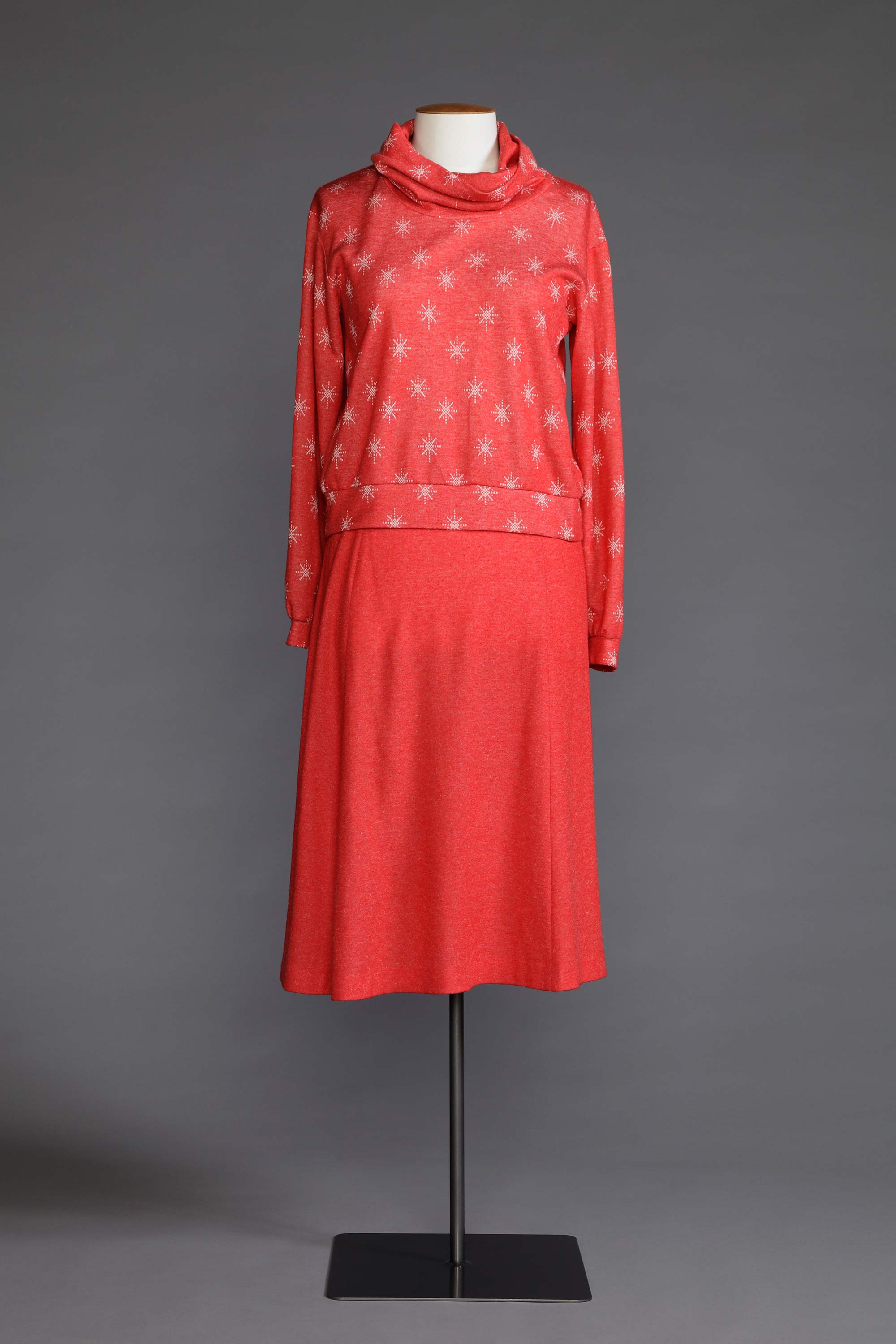 As knitwear became hugely popular in the 1980s, the use of all sorts of knit fabrics in fashion took off. Many home sewers such as Nancy Berry learnt how to use this fabric in new ways through a Knitwit sewing course. Huge meterages of knit fabric were produced here in New Zealand and it was available as sweatshirting, double knits, single knit jerseys and in fabrications of cotton, poly cotton, acrylic, wool and swimsuit lycra. Knitwit patterns were developed in Australia and were quick and easy to sew, allowing women to make fashionable outfits for the whole family often using just an overlocker. Nancy’s daughter Nardene has kept this outfit as a keepsake to remember her mother by. Read more about the history of home sewing in the New Zealand Fashion Museum publication Home Sewn.