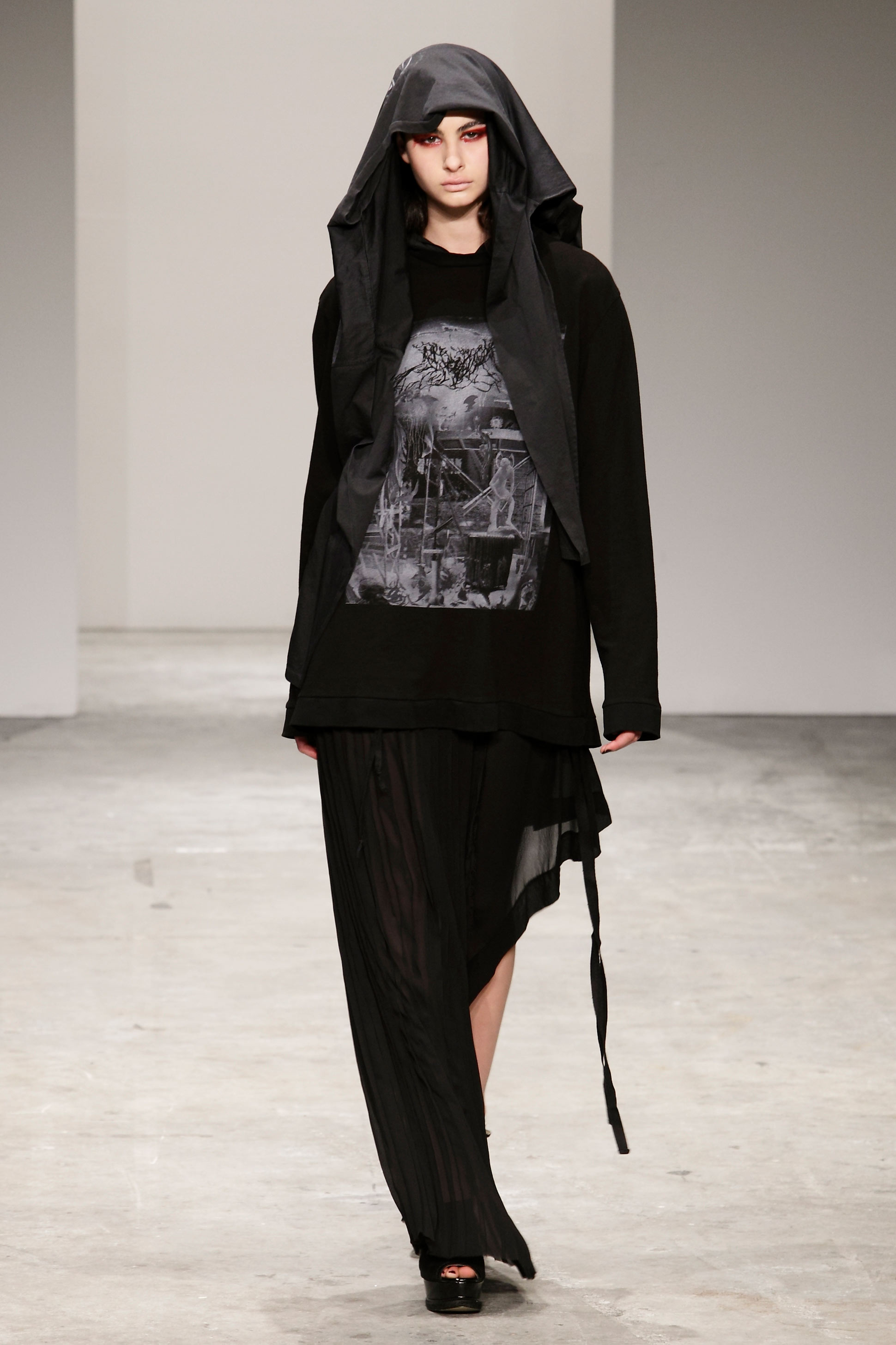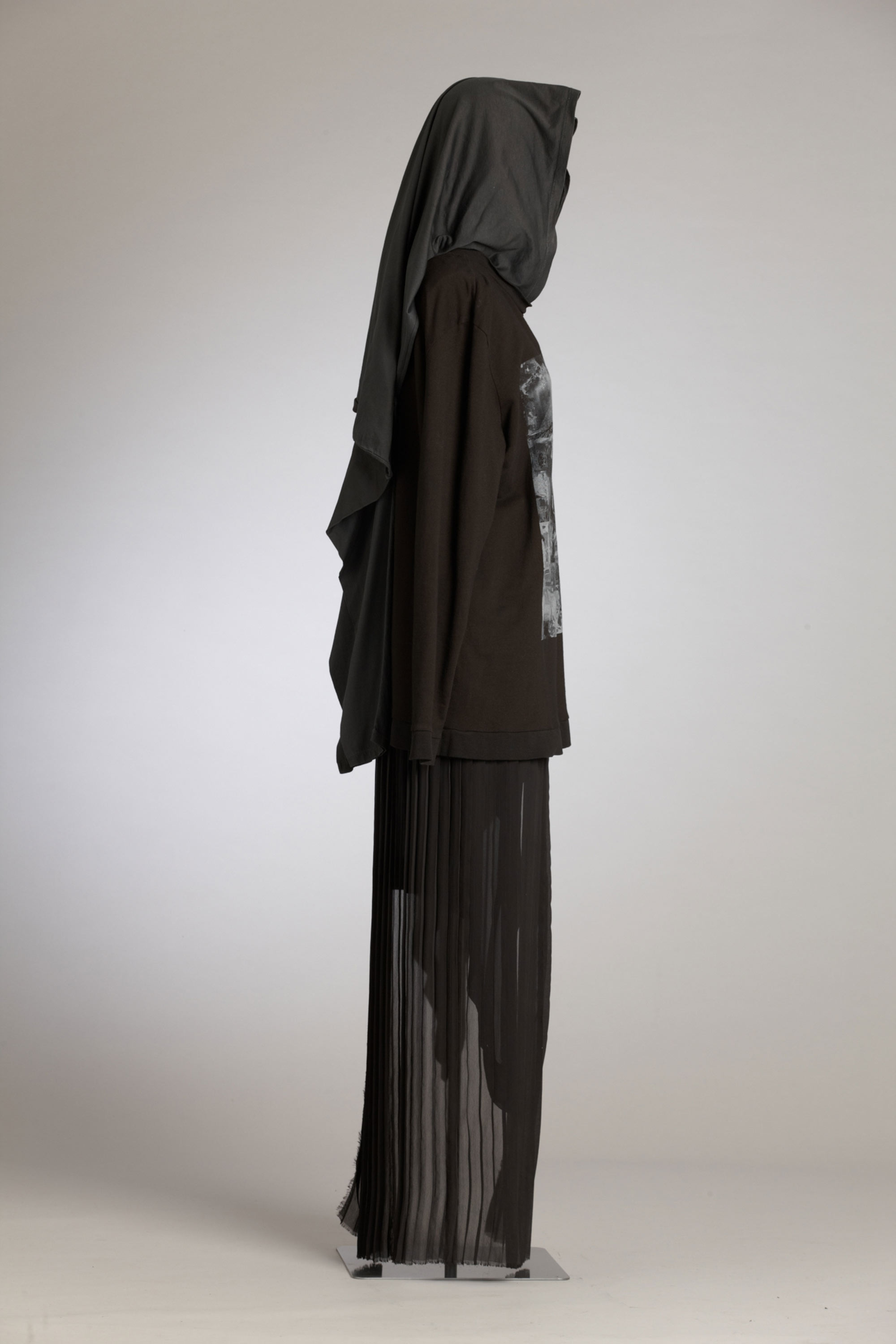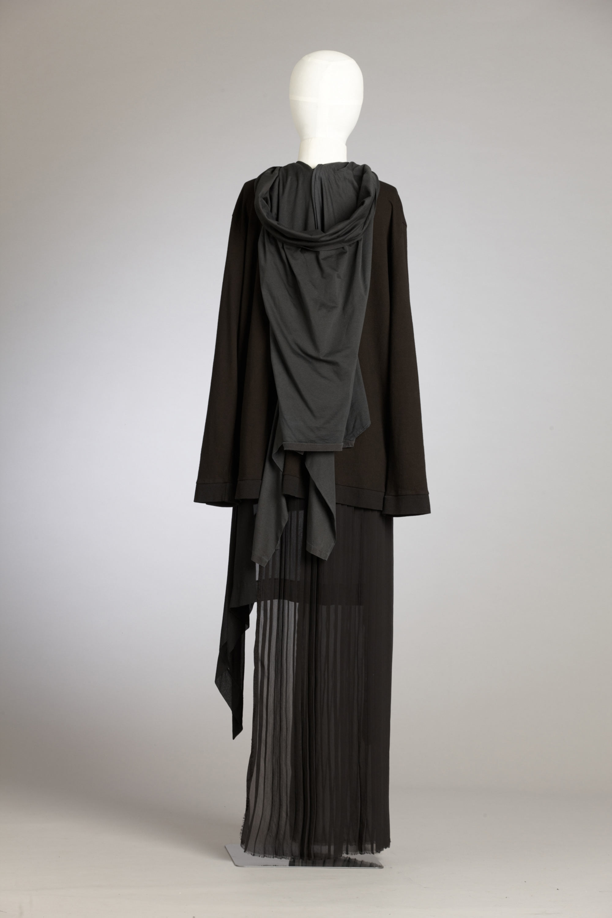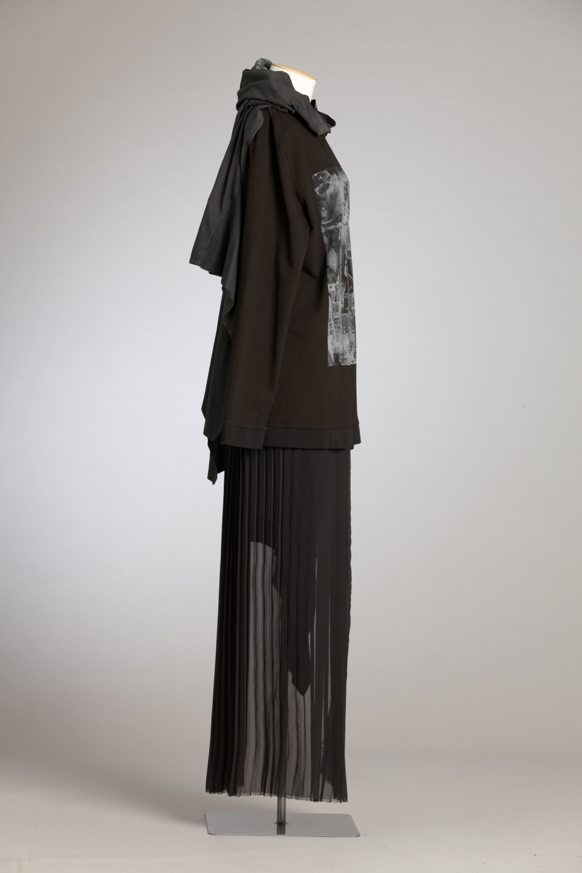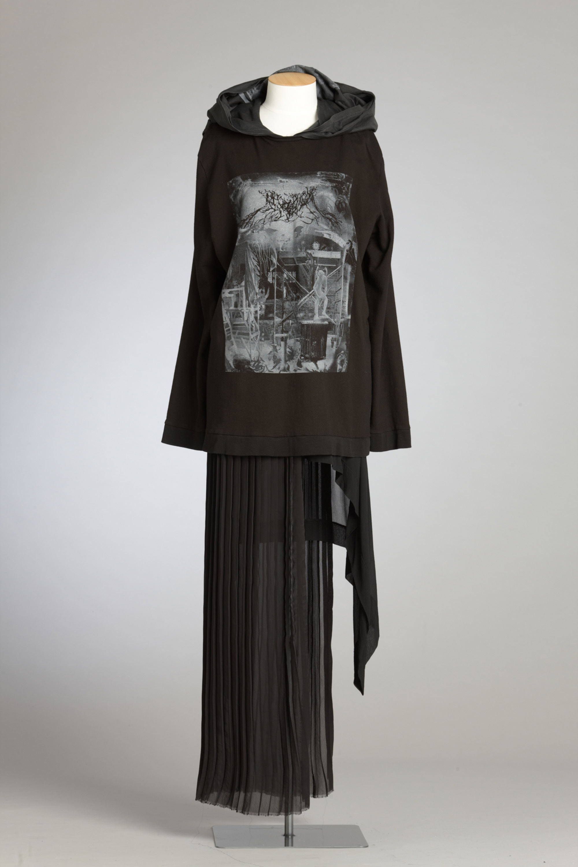 The contrast that James Dobson says is at the core of his label, Jimmy D, is not evident in his choice of colour, rather it can be found in combinations of different fabrics and the subversion of conventional use. A long-sleeve tee is attached to a sweatshirt to form a hood and a skirt is ripped in half and attached with a silk harness. James' entry into the fashion world was inspired by the success at London Fashion Week of the New Zealand Four and he has become one of the second-generation designers most closely associated with the colour black, rarely incorporating any other colour in his collections. Read more about wearing the colour black in the New Zealand Fashion Museum publication Black: The history of black in fashion, society and culture in New Zealand.