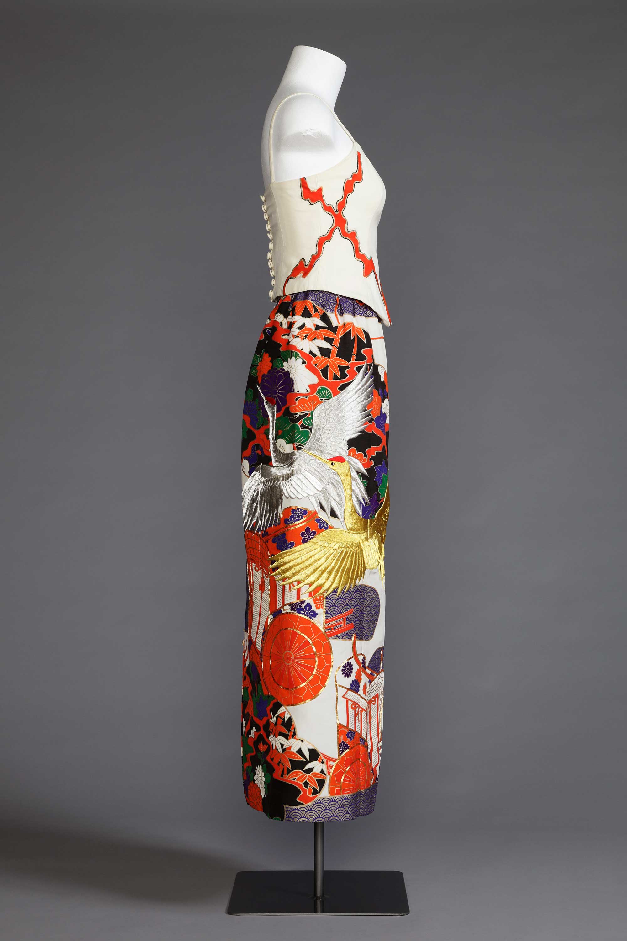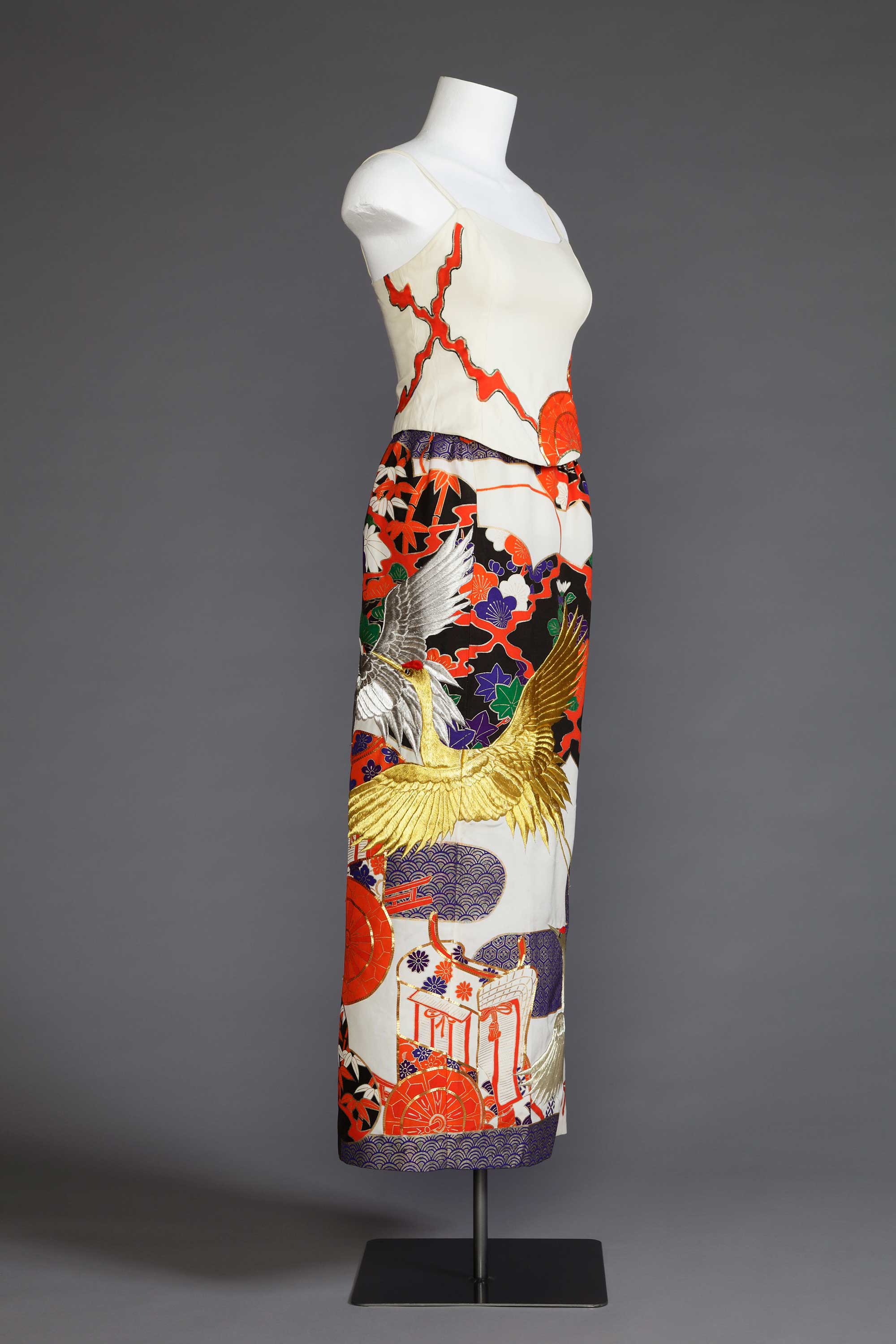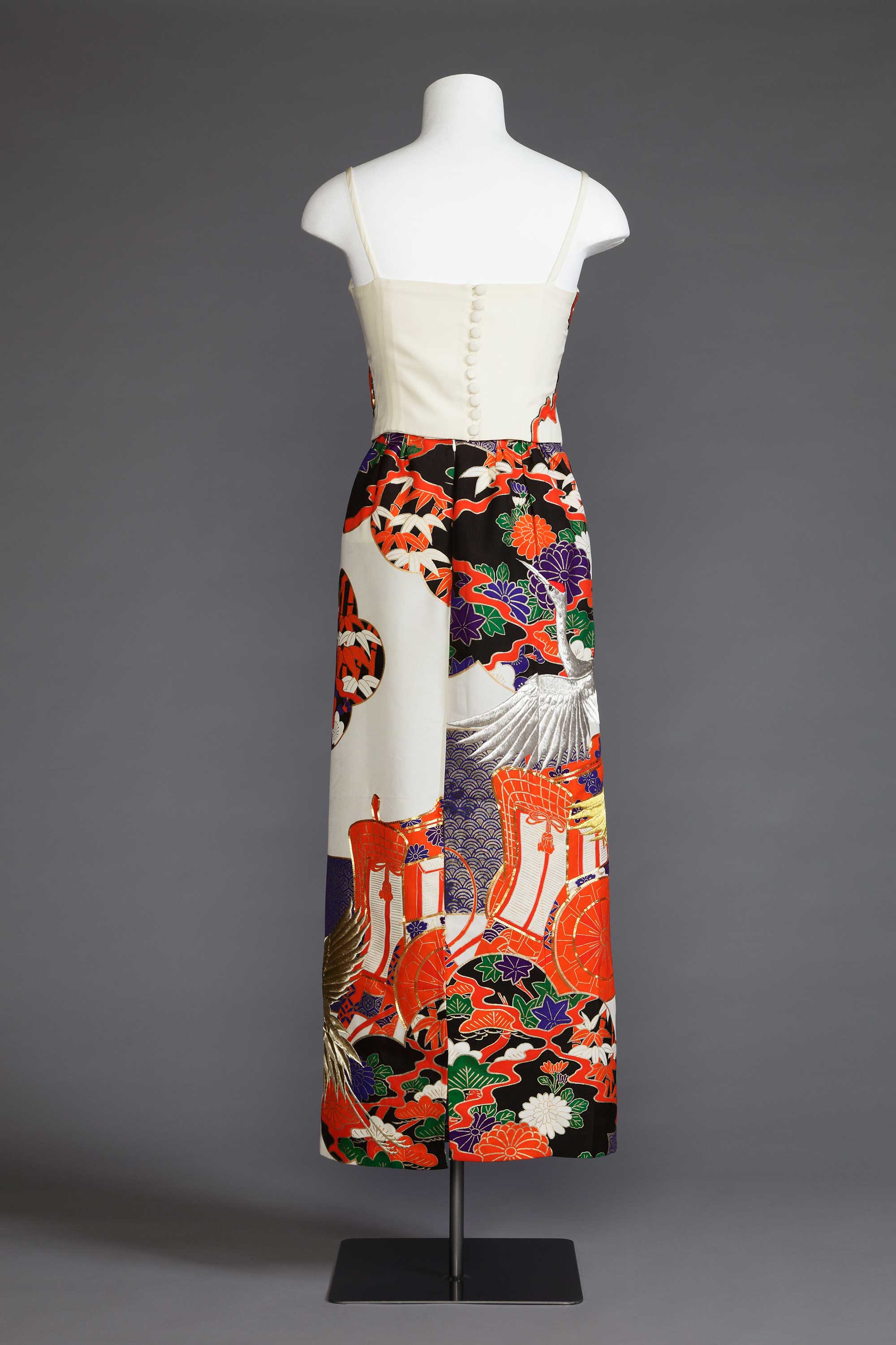 Grace Khong Samuelson created this dress as a wedding present for her Japanese friend Sachie Hasegawa who was marrying a kiwi and wanted to refashion her heritage to merge with her future. Grace used every spare moment available to work on this daunting project, including during the pattern making classes she was taking at the time, and at one point even in a hotel room on a business trip. Whilst the skirt is created fully from the kimono, the bodice subtly incorporates sections of the unique pattern to merge these two distinctive styles.