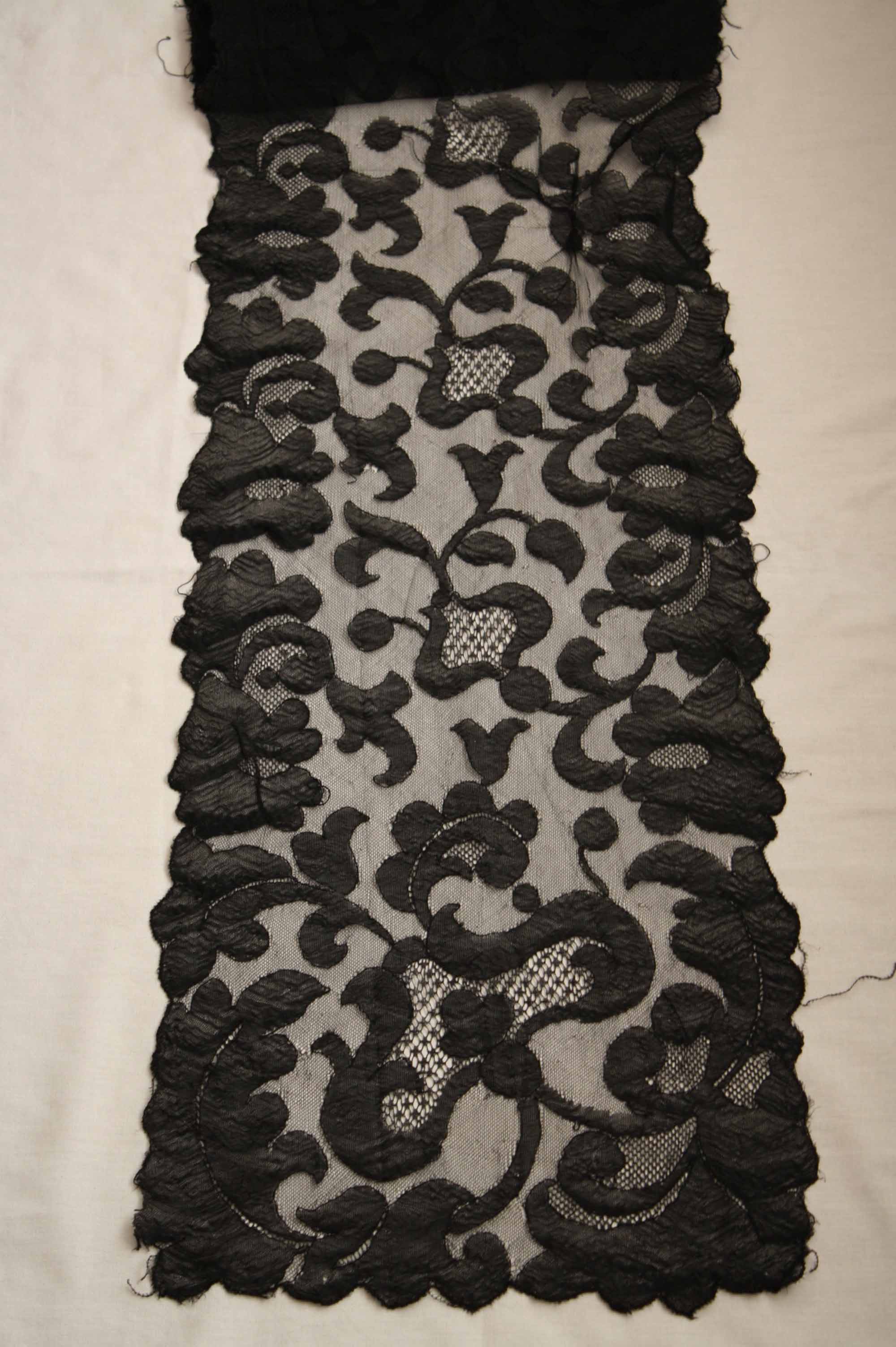 This shawl with bold motifs in knitted lace measures 236 x 40cm. It was owned by Julia Torrens and acquired when she was about 50 years old. Read more about wearing the colour black in the New Zealand Fashion Museum publication Black: The history of black in fashion, society and culture in New Zealand.