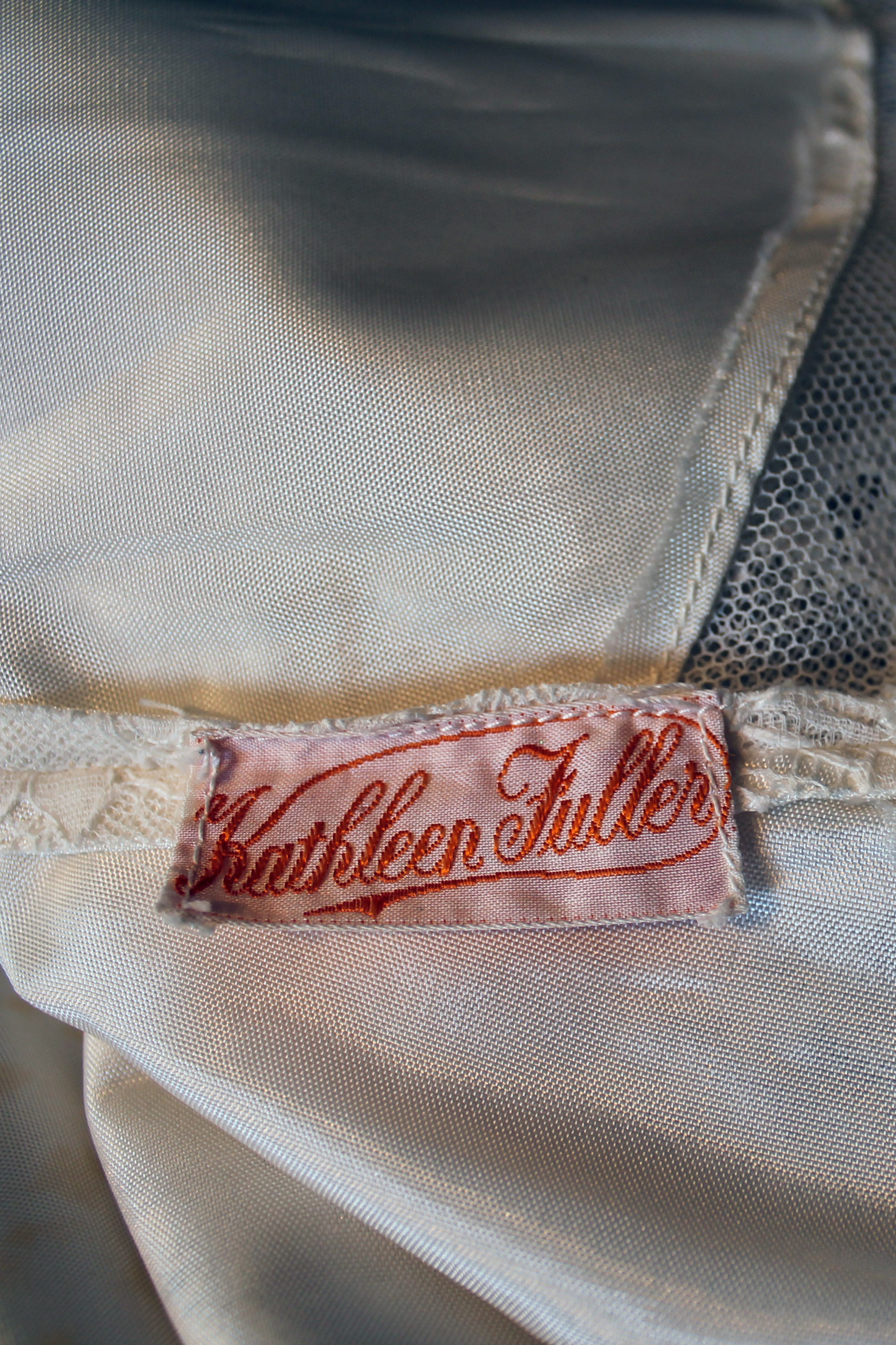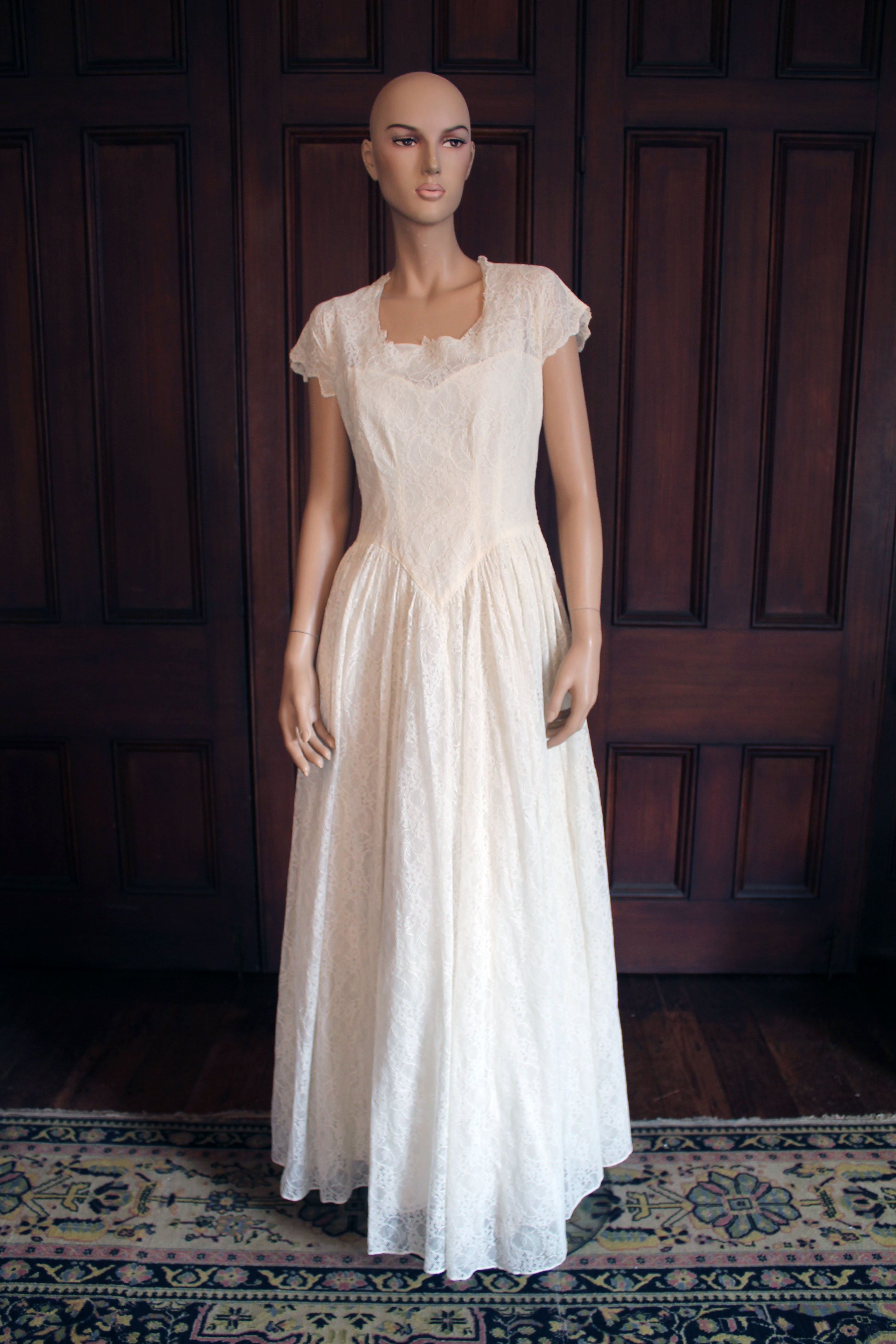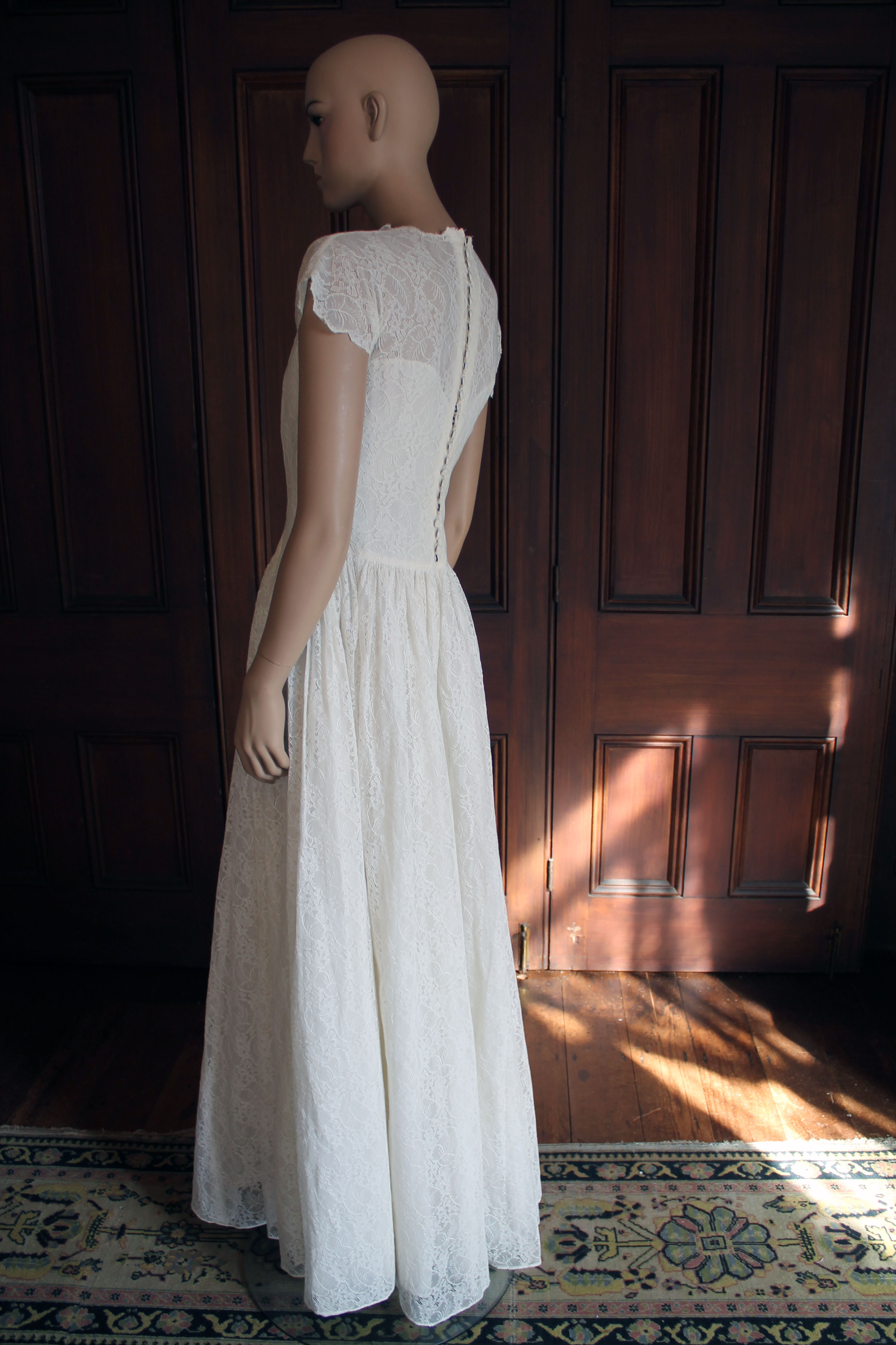 The simple and understated style of this dress belies some gorgeous detailing; the hallmark of the designer Kathleen Fuller. For the neckline, Kathleen has utilised the scalloped border of the lace fabric to form a delicate edge. The skirt is in four pieces, the front and back panel (including the train) adjoining two lengthy side panels attached along a wide curved seam that again utilises the scalloped edge of the fabric. Yards and yards of lustrous rayon lace have gone into the construction of this handsome wedding dress. The lace is most probably Leavers, named after the machine on which it was made. In this style of lace, the pattern is woven at the same time as the net ground and, like many machine made laces, Leavers made laces imitate those painstakingly made by hand. The acetate under slip, while loose at the upper, has been carefully integrated into the design of the dress and joins it at the romantic V-shaped waist seam. Twenty-two self-covered buttons and corresponding rouleau loops form a lovely feature down the centre-back, a detail echoed on the pointed cuffs, which each incorporate three rouleau loops and buttons.