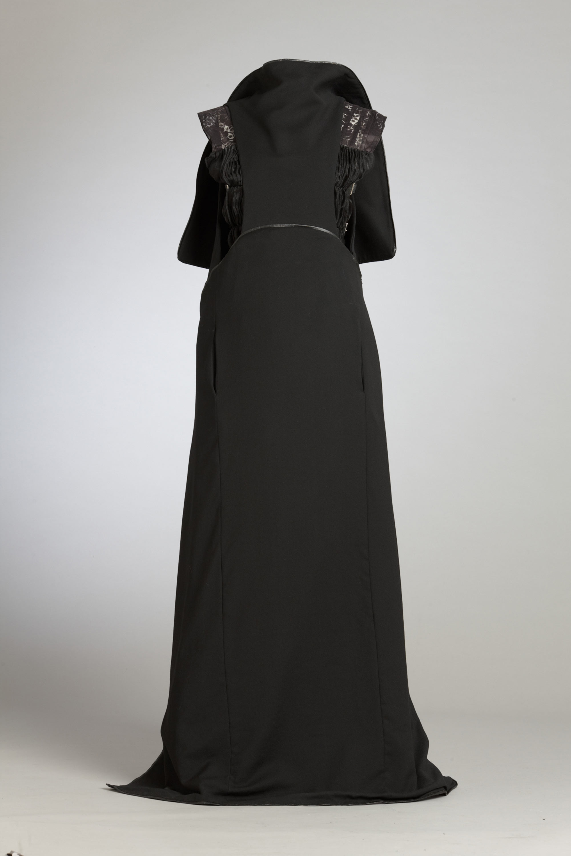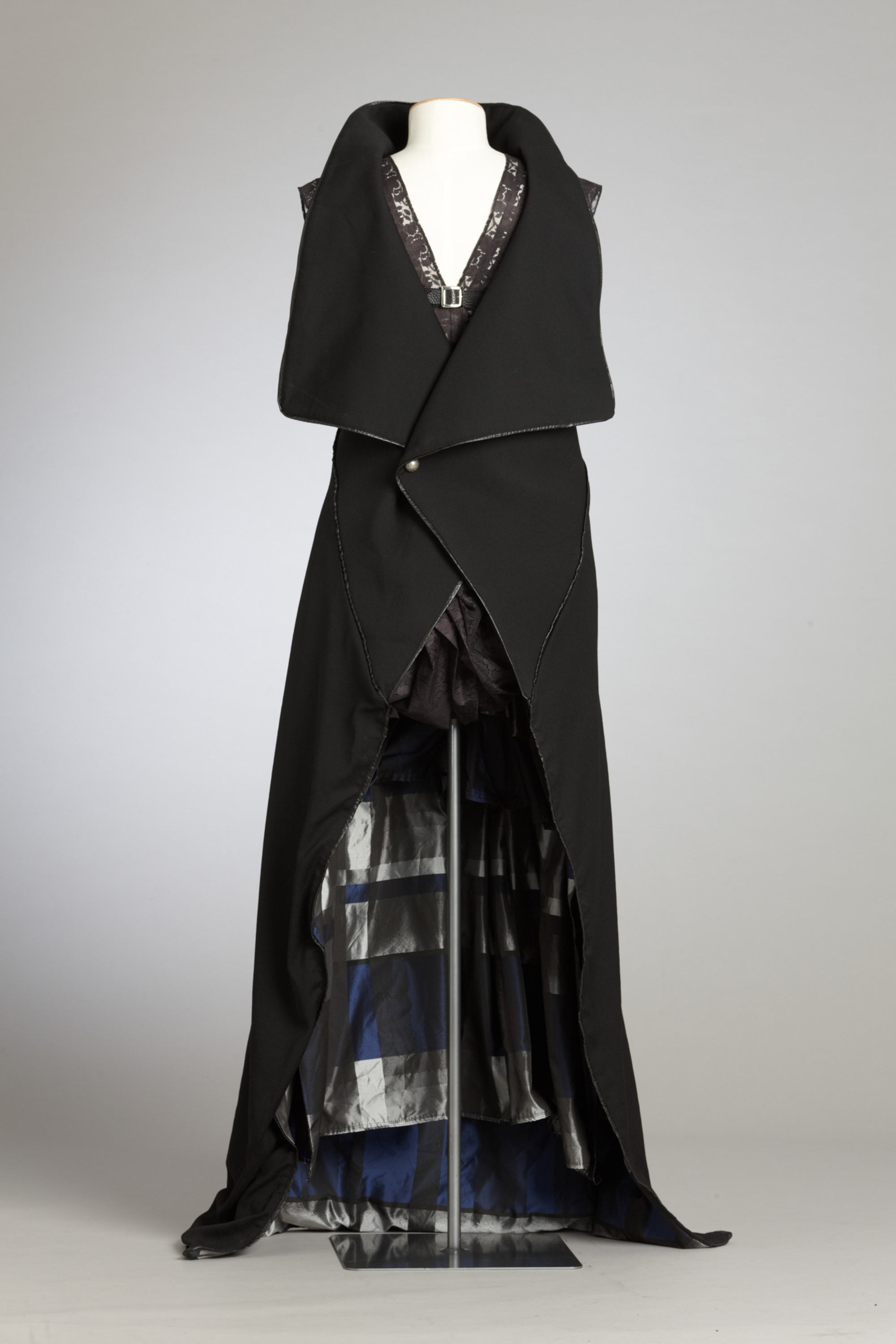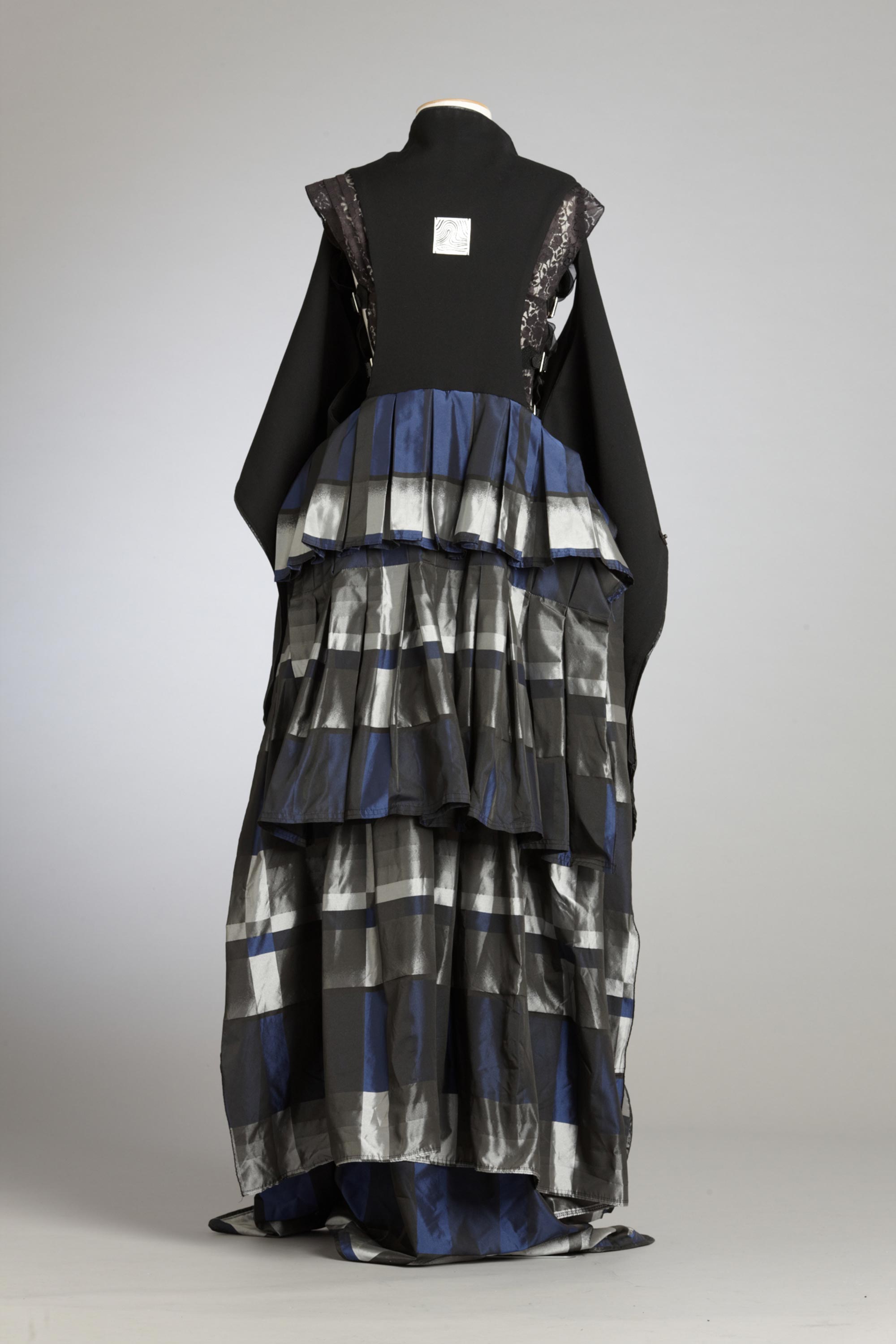 In her graduation collection Lan Yu asked "Who Made All The Rules?" As a young woman of Chinese heritage living in New Zealand she pondered the cultural prescription of what one should wear. Like Karen Walker in her Etiquette collection, she questioned the rules of well-mannered society: Do transparent fabrics make men look sexy? Why is it that only women wear dresses? Is there only one way to wear a coat? Can I wear the same clothes in China and in New Zealand? In her collection she restricted her colour palette to create garments with many options – androgynous, reversible and multi-layered. Read more about wearing the colour black in the New Zealand Fashion Museum publication Black: The history of black in fashion, society and culture in New Zealand.