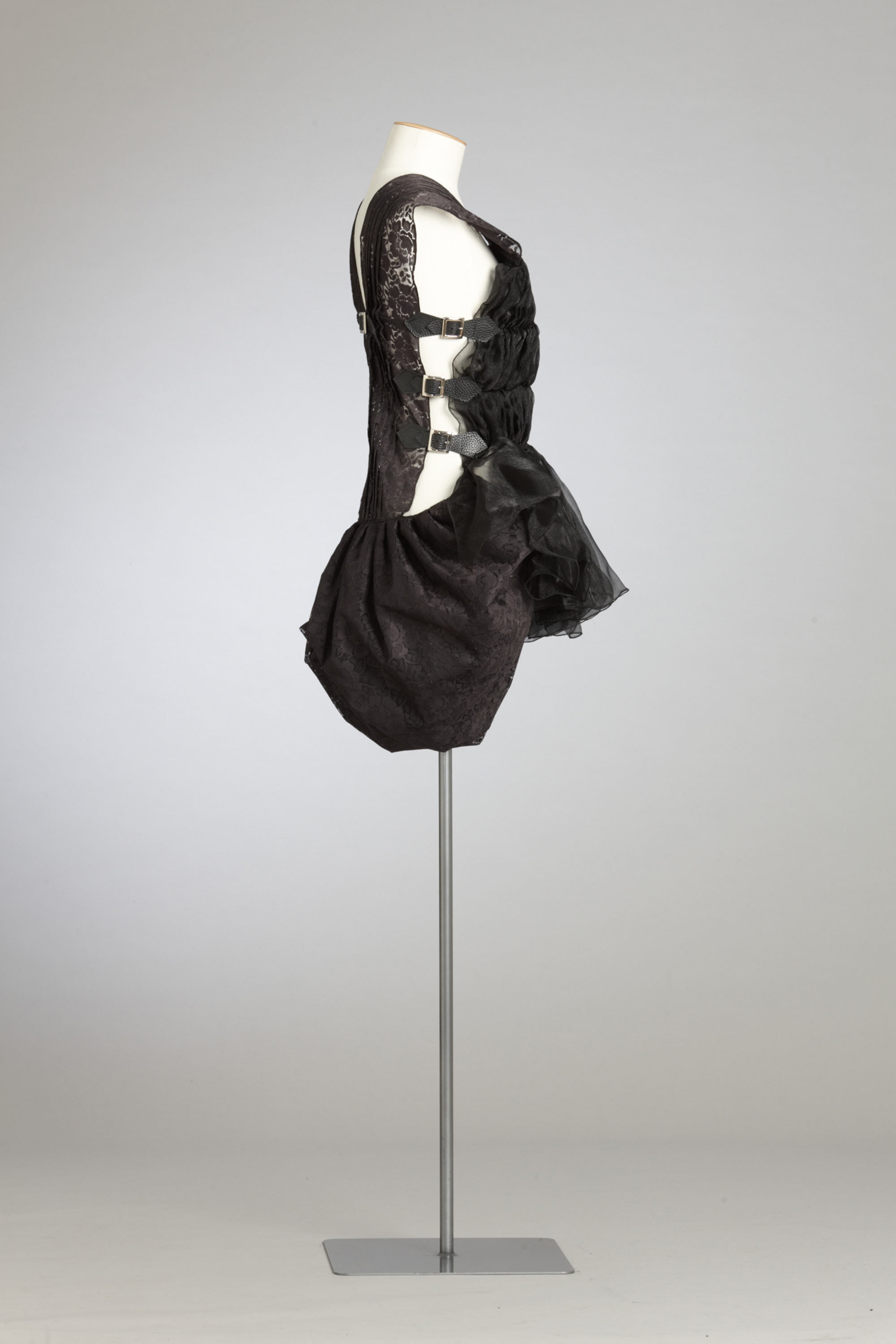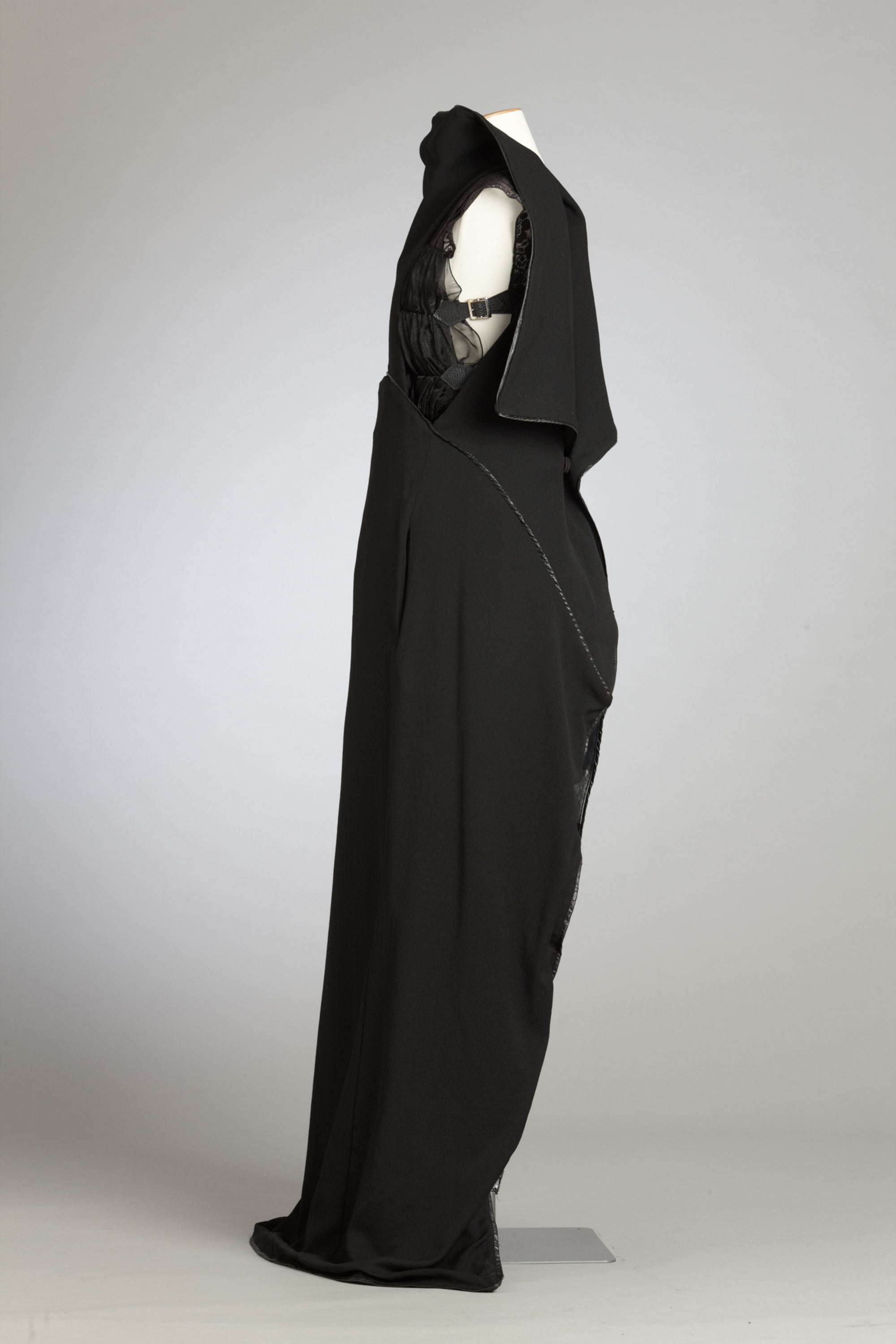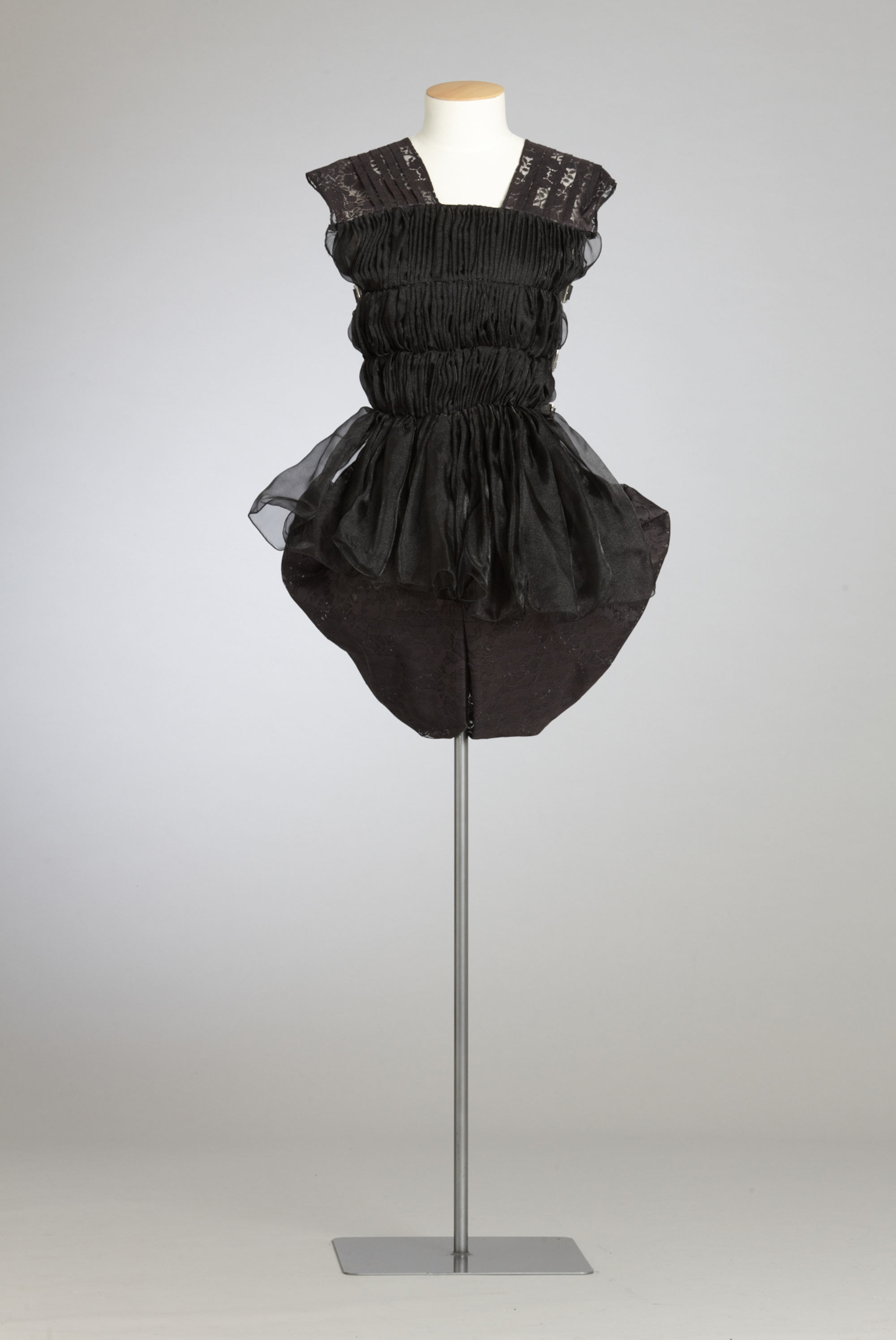 In her graduation collection Lan Yu asked "Who Made All The Rules?" As a young woman of Chinese heritage living in New Zealand she pondered the cultural prescription of what one should wear. Like Karen Walker in her Etiquette collection, she questioned the rules of well-mannered society: Do transparent fabrics make men look sexy? Why is it that only women wear dresses? Is there only one way to wear a coat? Can I wear the same clothes in China and in New Zealand? In her collection she restricted her colour palette to create garments with many options – androgynous, reversible and multi-layered. Read more about wearing the colour black in the New Zealand Fashion Museum publication Black: The history of black in fashion, society and culture in New Zealand.