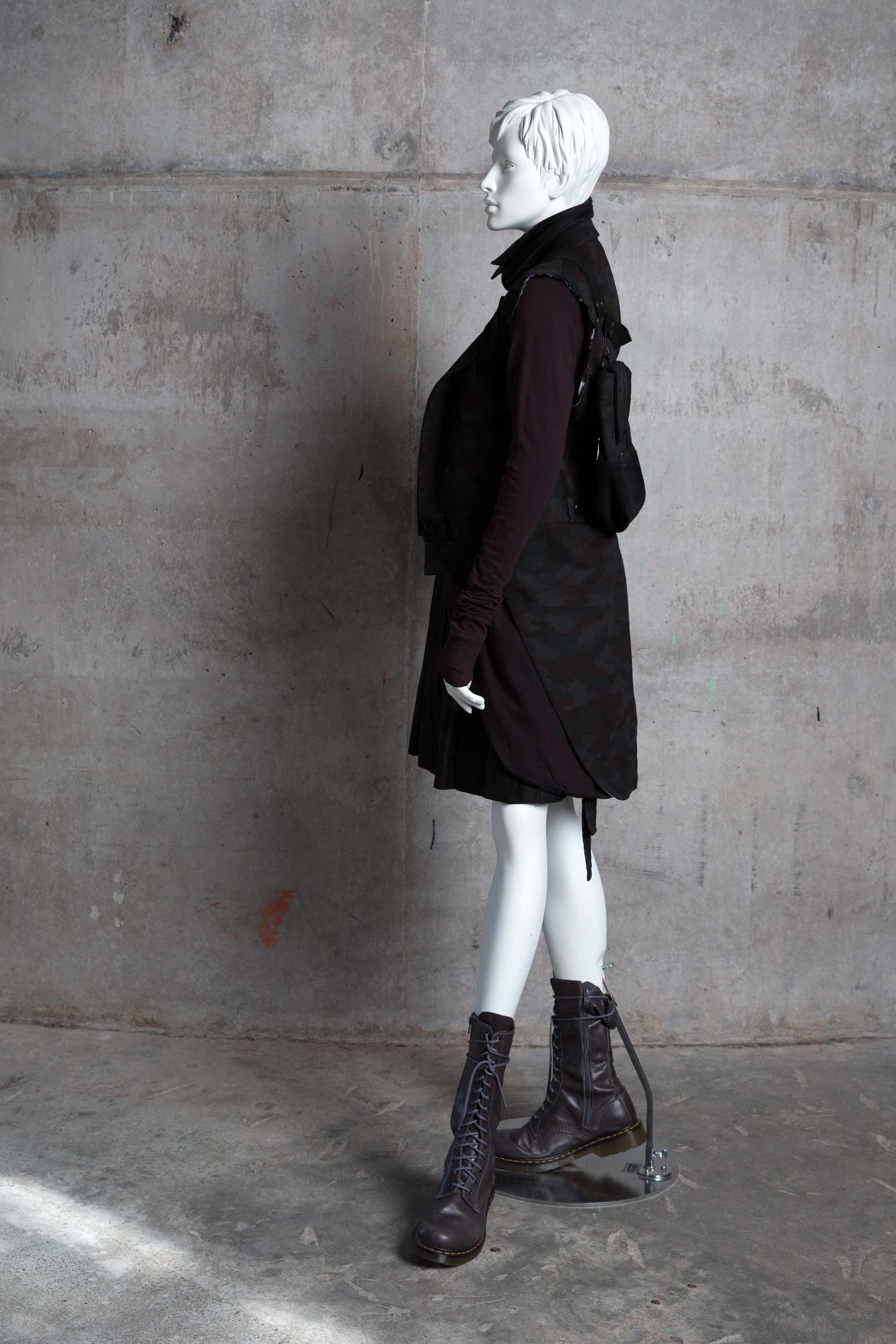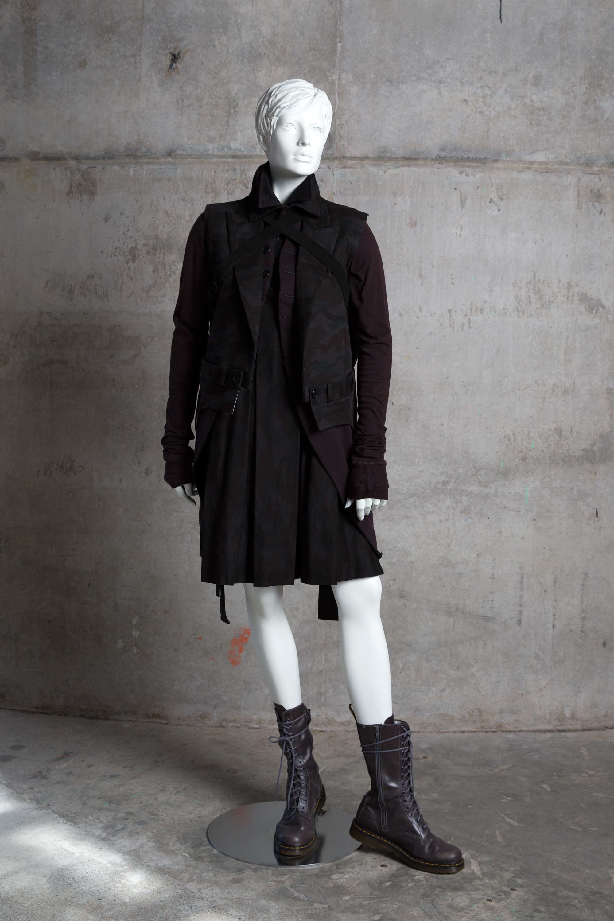 Trips to Japan when the NOM*d label was still in its infancy, were a seminal design inspiration for Margarita Robertson. She admired the utilitarian approach of Rei Kawakubo (Comme des Garçons), Yohji Yamamoto and Issey Miyake, as well as their use of a limited, predominantly black, colour palette. This 'Camouflage' ensemble was from their C'mon collection, A/W 2006.