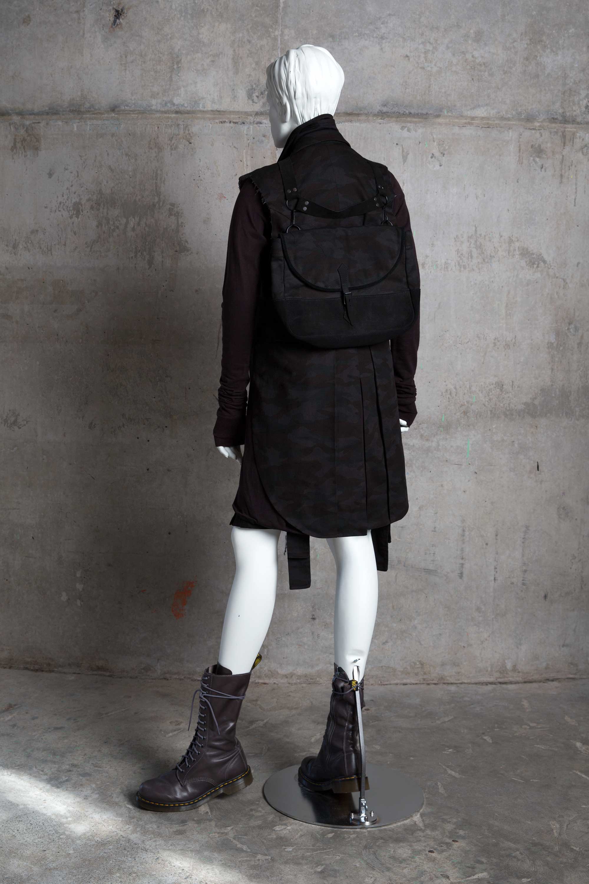 Cotton drill (jacket, dress), cotton knit (tail coat), cotton drill and leather (back pack)