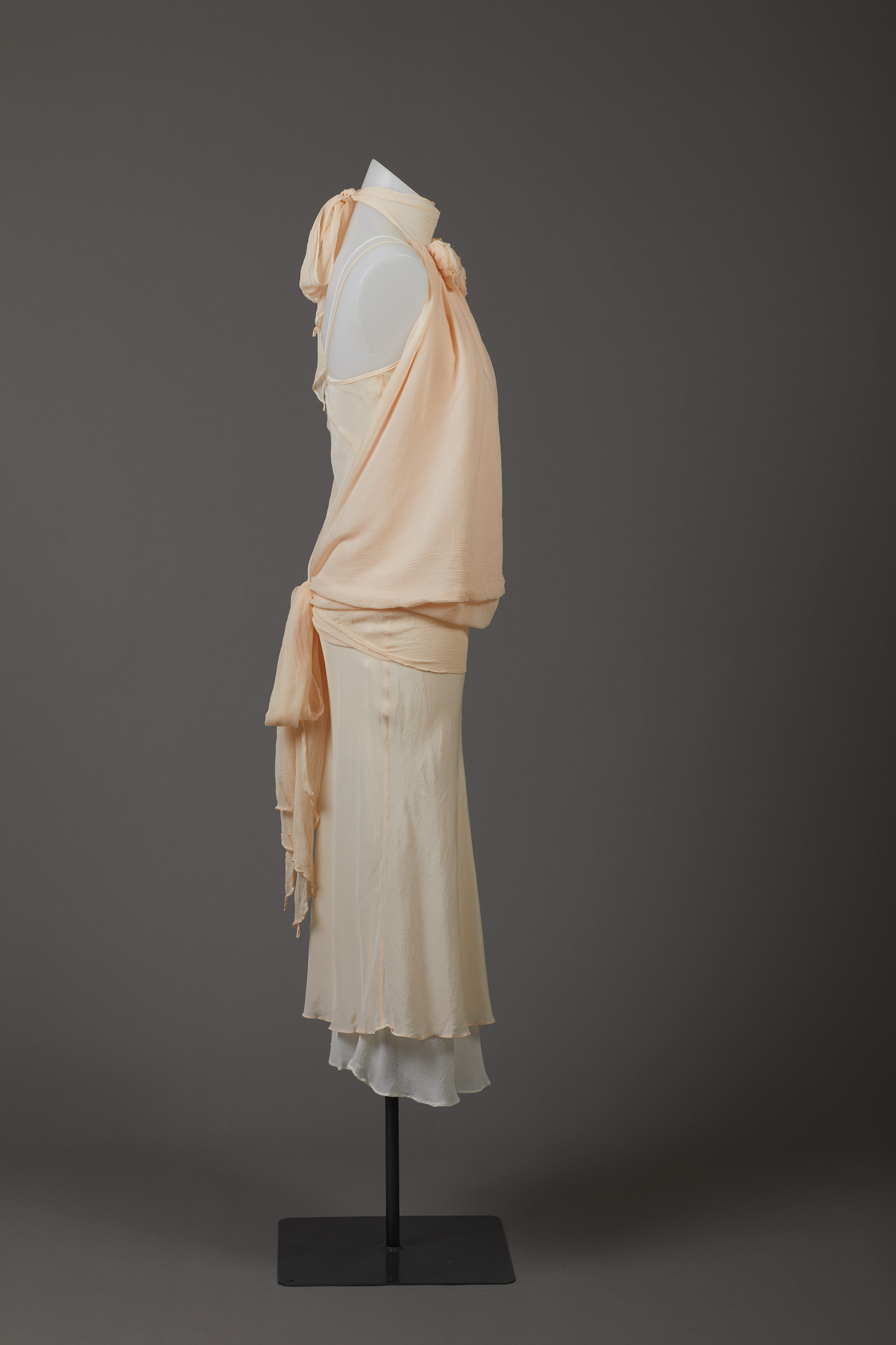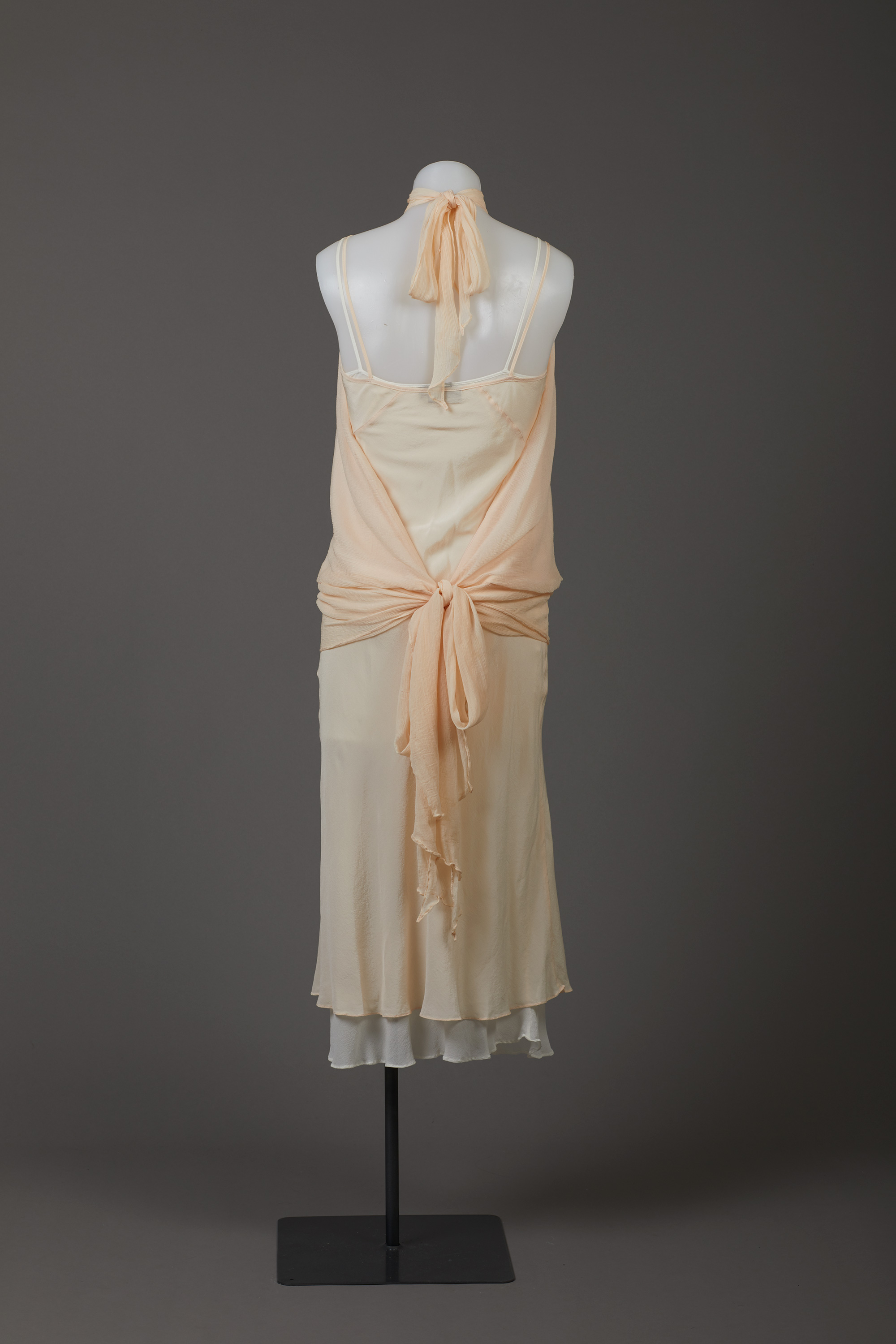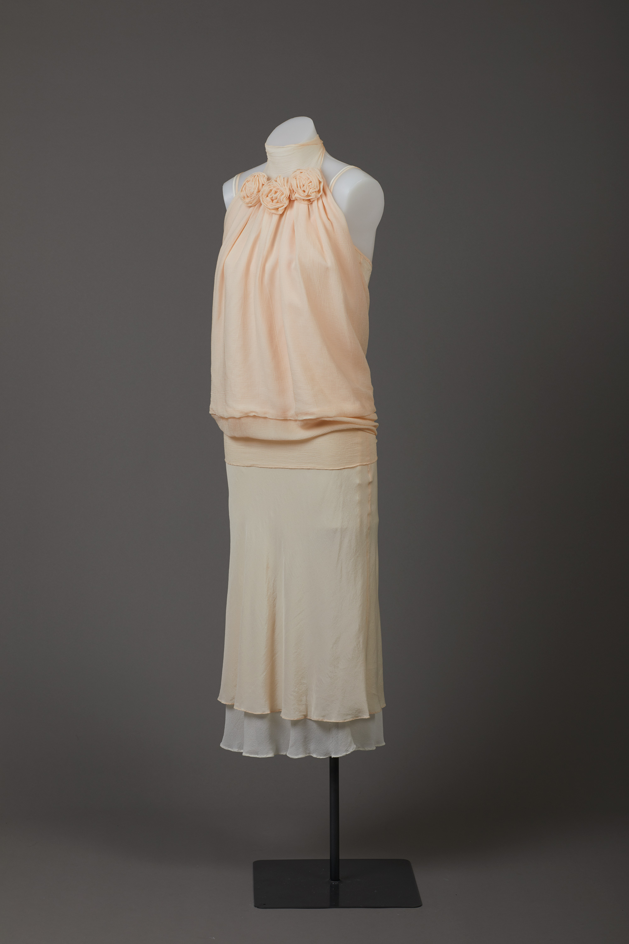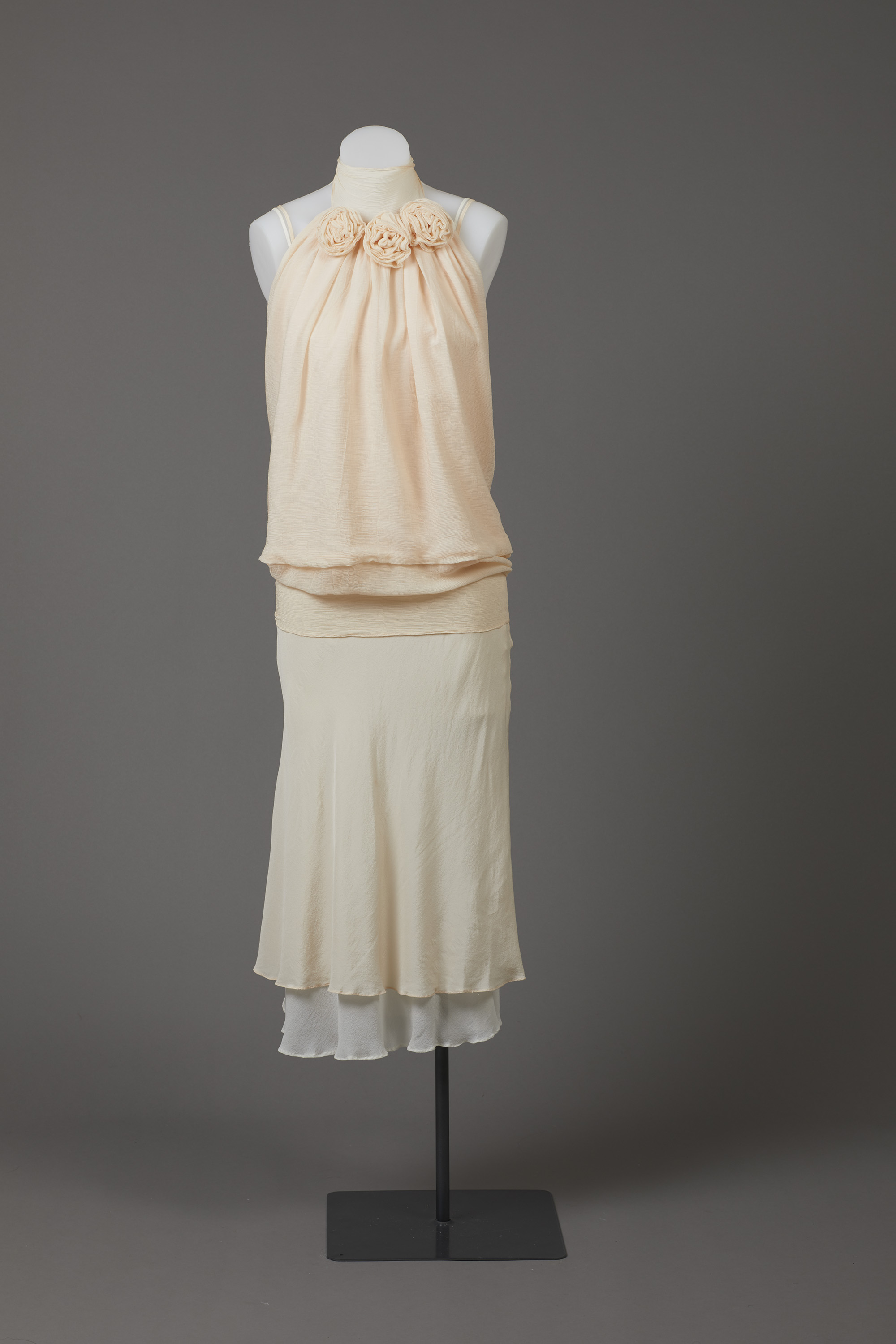 The 'dress' is actually three garments - two slips and a wrap top that ties at the neck and waist. It is embellished with self-fabric flowers and diamantes.