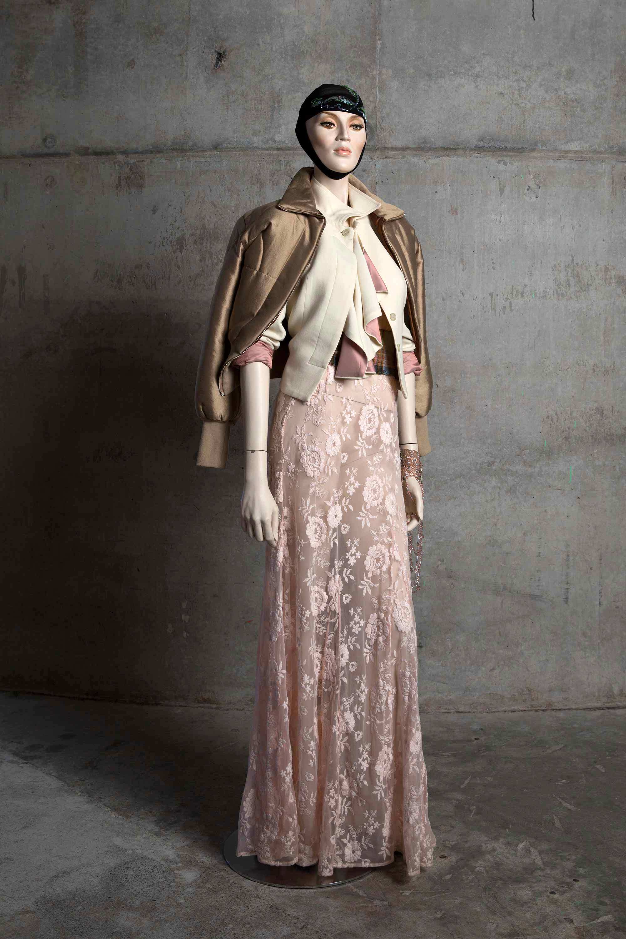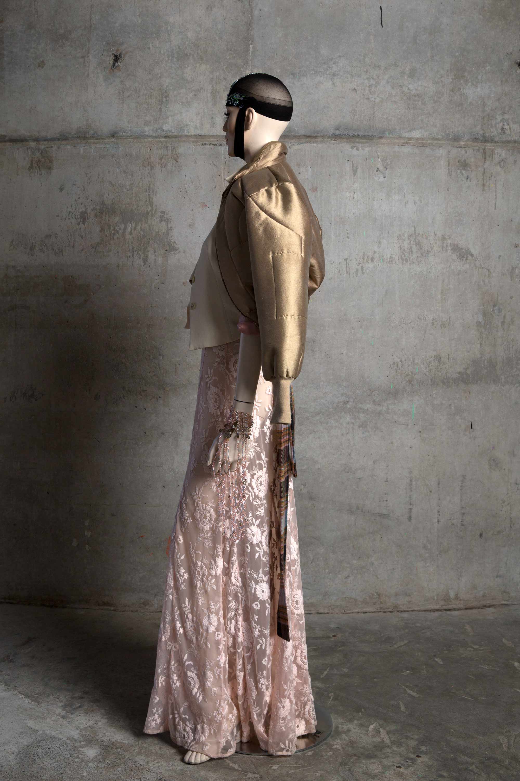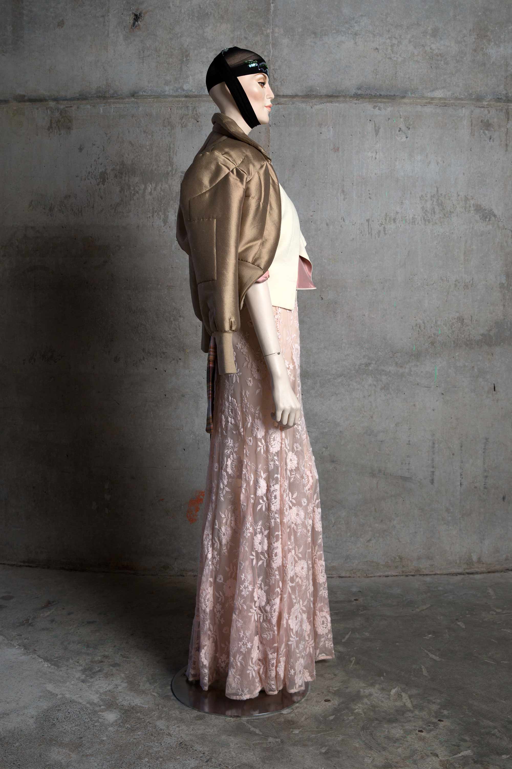 This Carlson ensemble features garments from a range of collections from the 2000s. The Chrysalis jacket is from Carlson's winter 2008 collection and the Peplum jacket is from the summer 2002/03 collection, No More Twist. The Valentine dress is from the winter 2007 collection, Night Moves. The hand-beaded stocking headwear is from summer 2001/02's collection, Rise of the Coloured Empires, and the scarf is from the winter 2006 collection, Voyage.