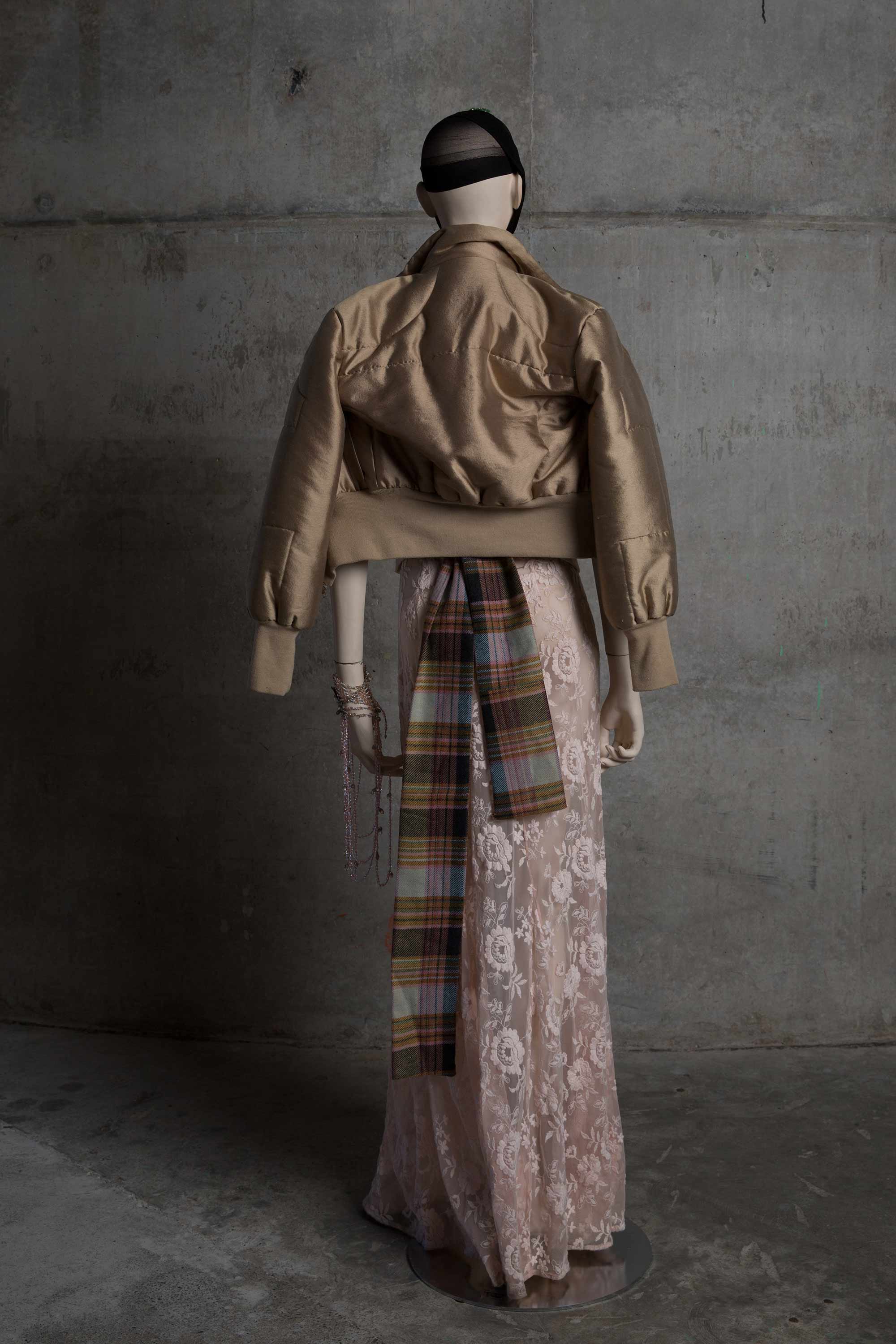 Padded silk wool (Chrysalis jacket), wool blend (Peplum jacket), nylon/cotton lace (Valentine dress), tartan wool and satin-backed crepe (scarf)