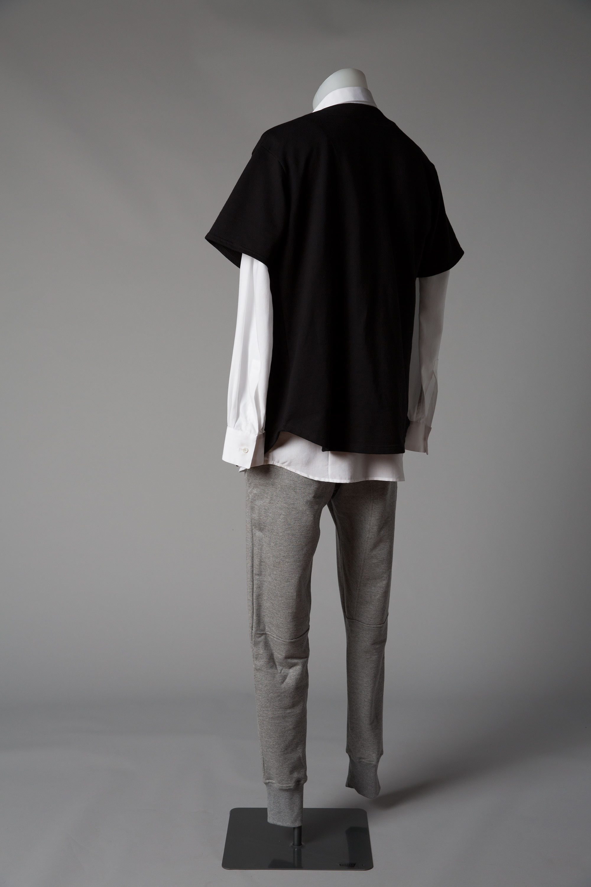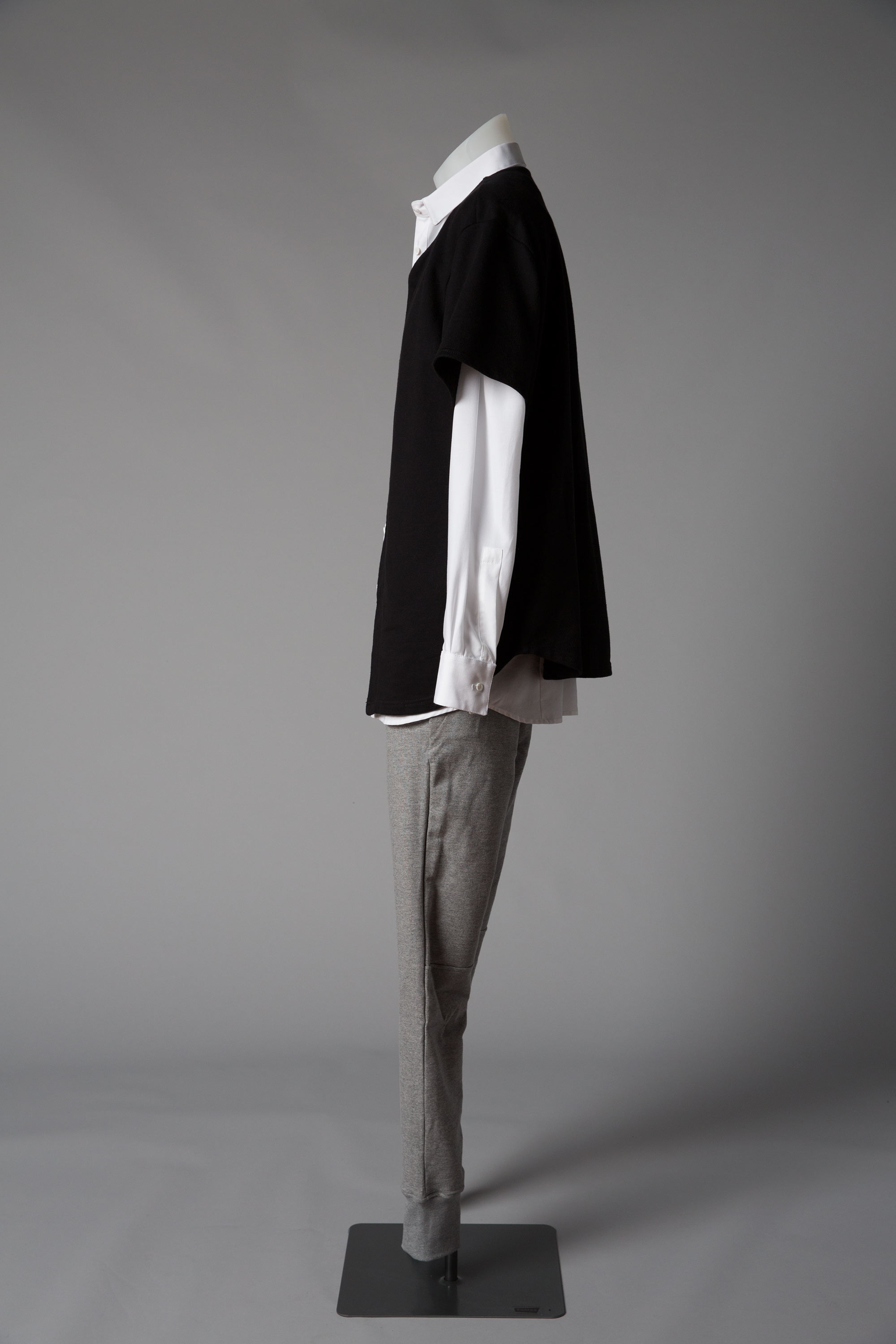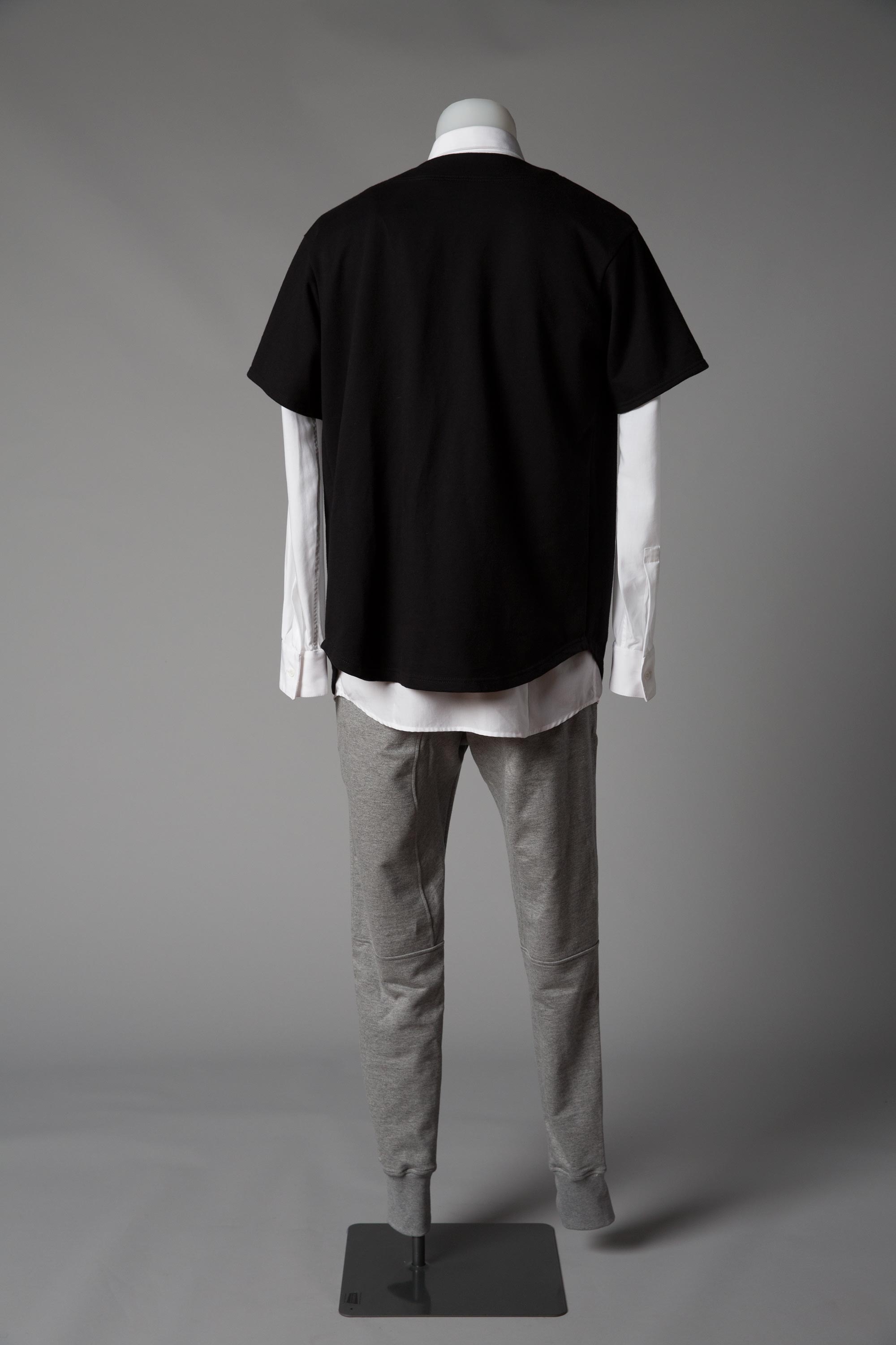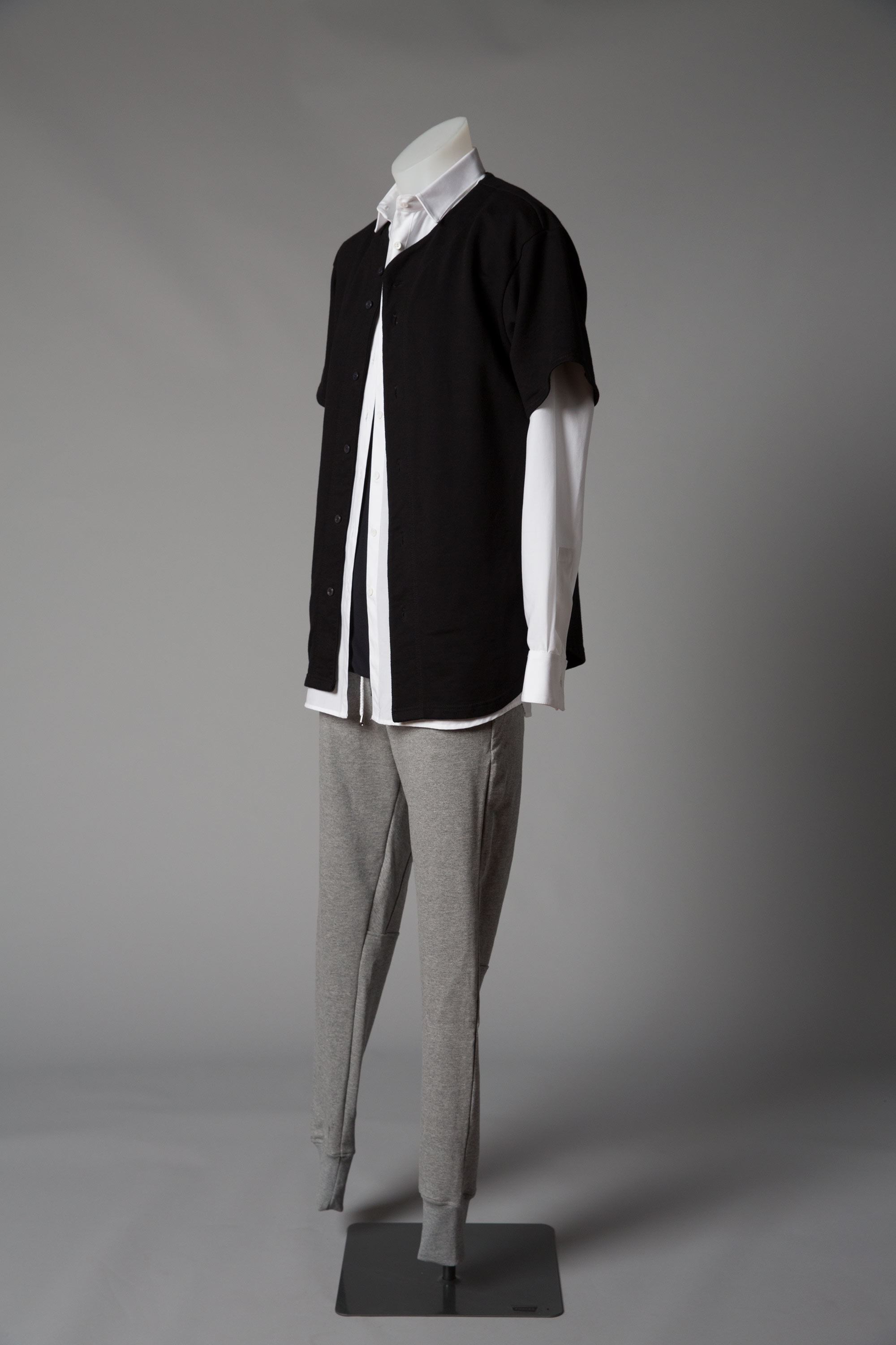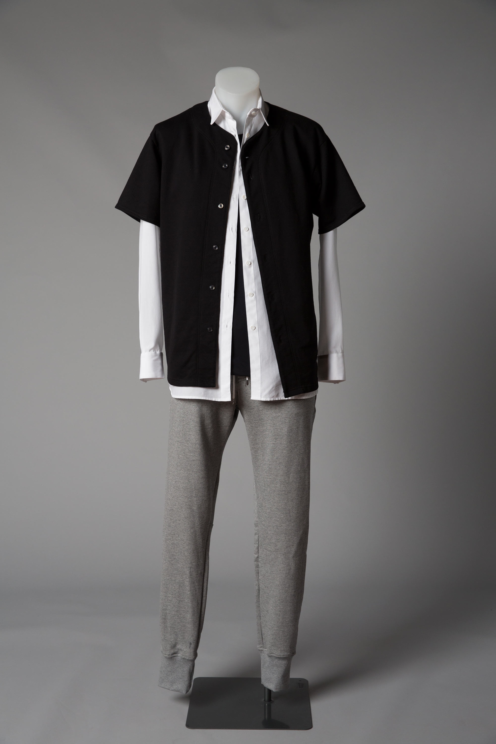 Cotton sheer shirting and mother of pearl buttons (shirt), cotton loopback fleece and mother of pearl buttons (sweatshirt), grey marle cotton loopback (pants).