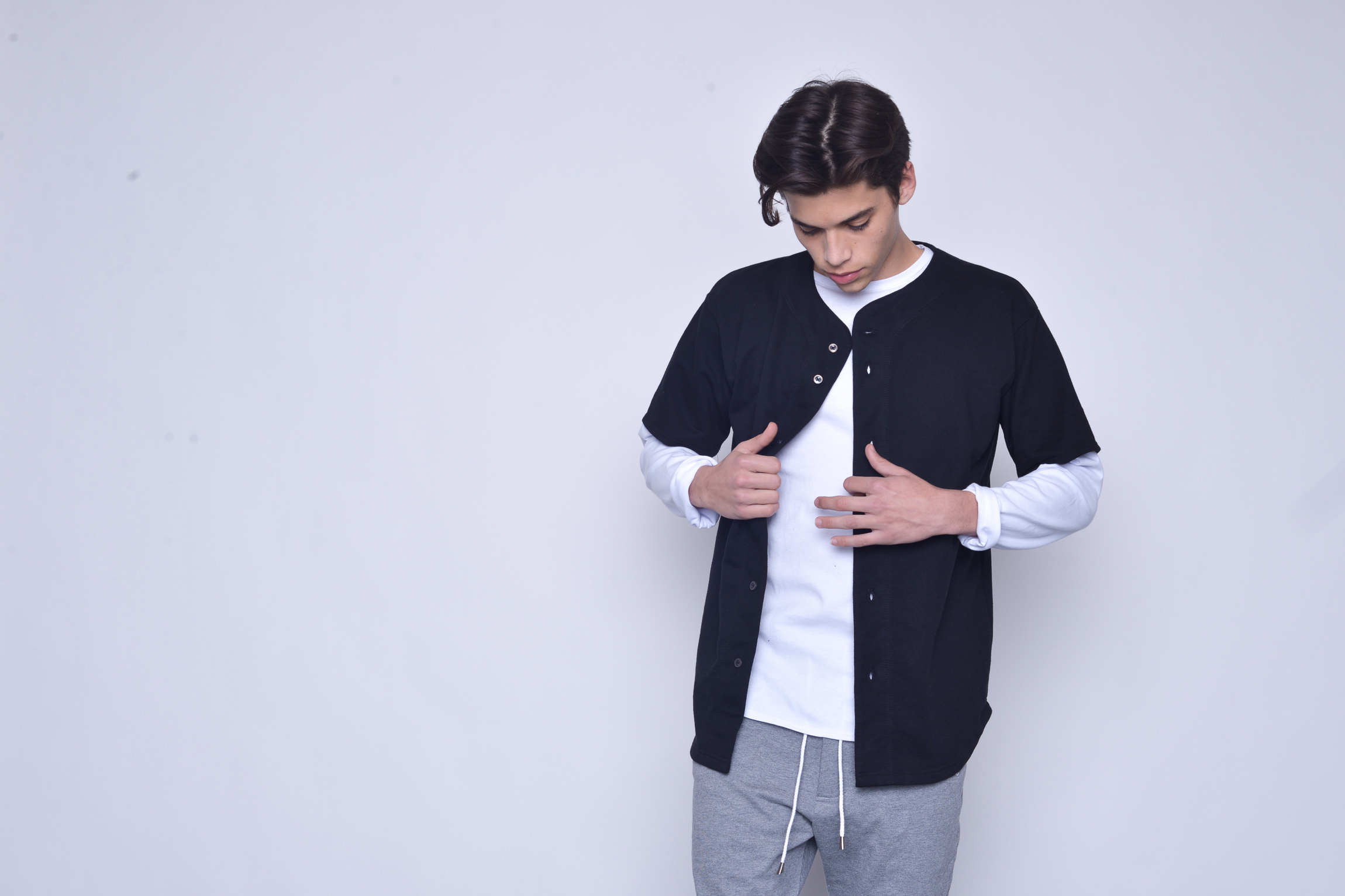 White (shirt), black (sweatshirt), grey (pants)