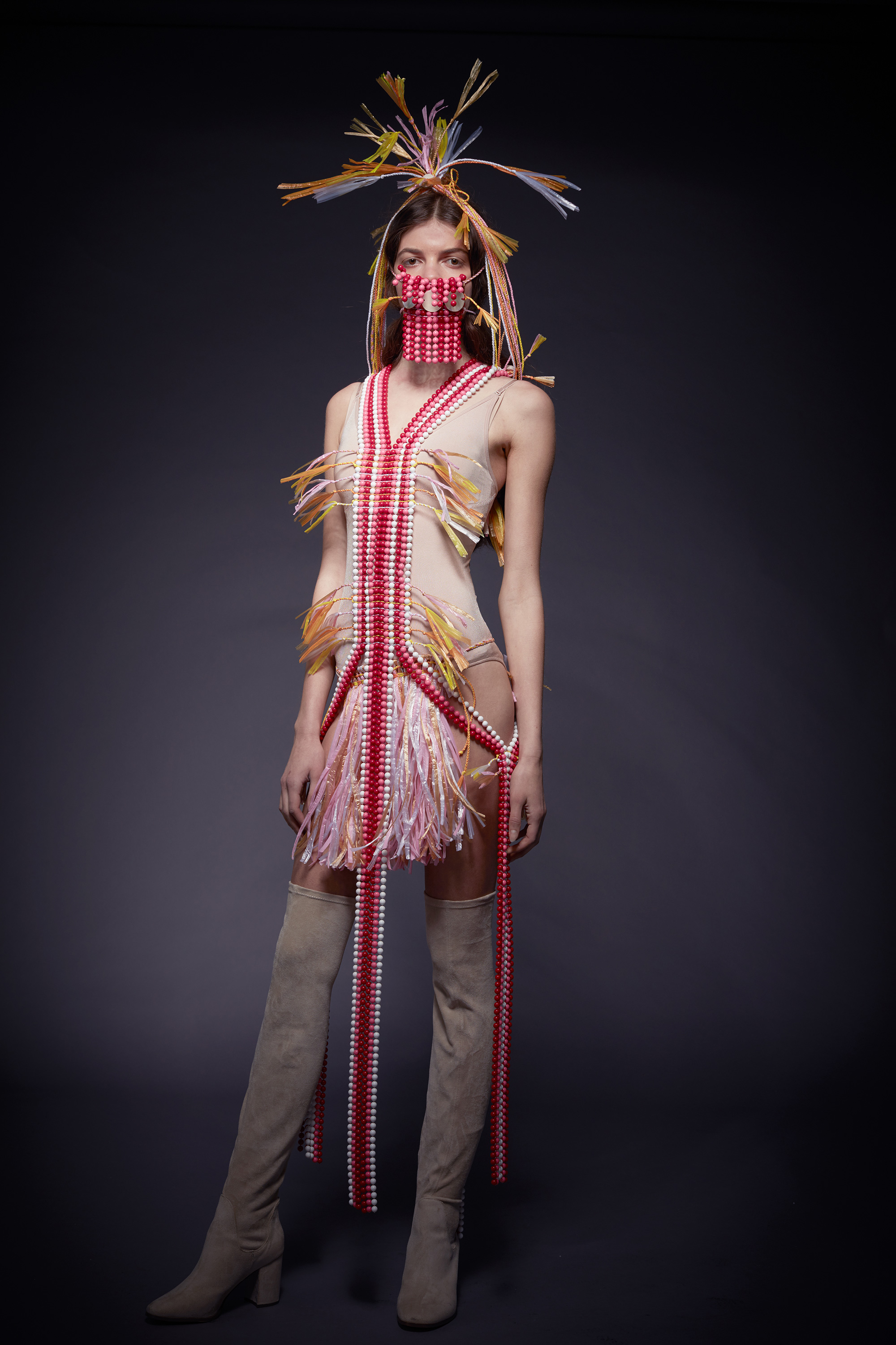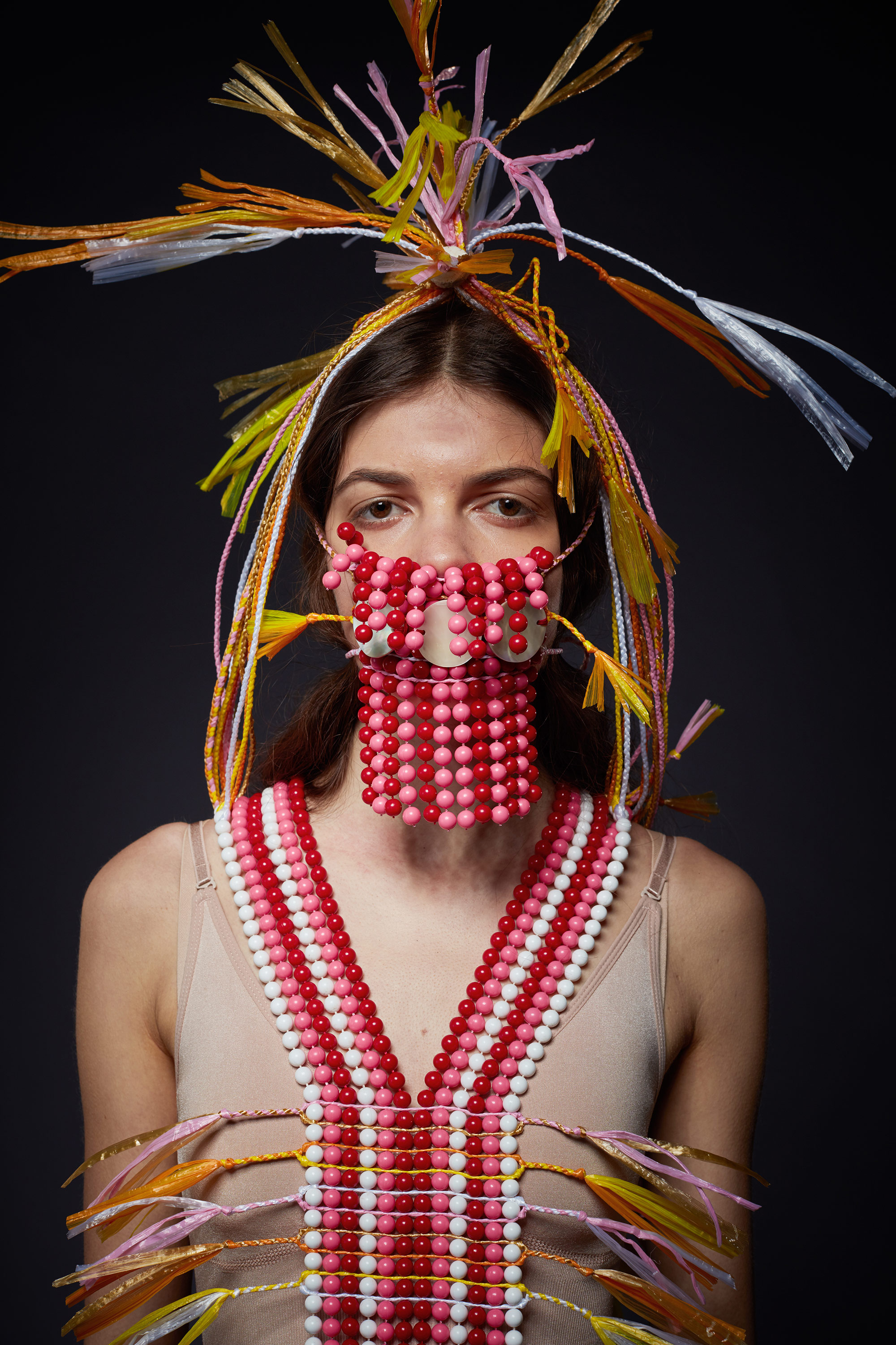 Feeonaa Wall interpreted June Black’s ‘Costume to offset the acid thought of doubt’. "The universal theme of doubt was the initial attraction. Something I feel we all need less of in our lives. To offset and disarm it needed something to come from deep within, its inspirational root taking hold in my Mother’s land." The piece is also a homage to the Pacific Sisters of which she is a member. Known for their pioneering ‘fashion activism’ this evolving collective of New Zealand urban Pacific fashion designers, artists, performers and musicians established in the early 1990s, remain a formative and enduring haven of influence and like-mindedness. "The waistcoat is a signature adornment of Pacific Sister style, deriving from the simple crossing of beads and shells across the torso, common in Pacific dress. The act of creating one is also a right of passage that was my time now to make, its completion signifying identity, interconnection, protection and a reminder of our history together. It also holds meaning unique to the individual. My intention to enhance the transformative potential of the waistcoat, disrupting old, no longer useful patterns. Its acid-like colours effectively ‘cancelling-out’ and silencing all thought of doubt from its wearer, (and it’s maker). At the same time reflecting a new way of thinking, a new way of being, a new direction or affirmation."