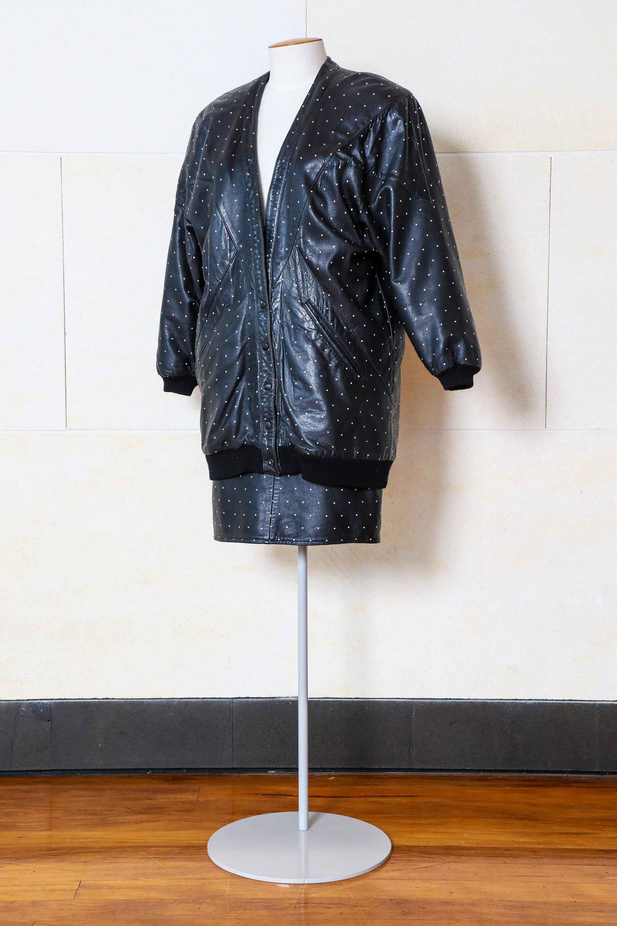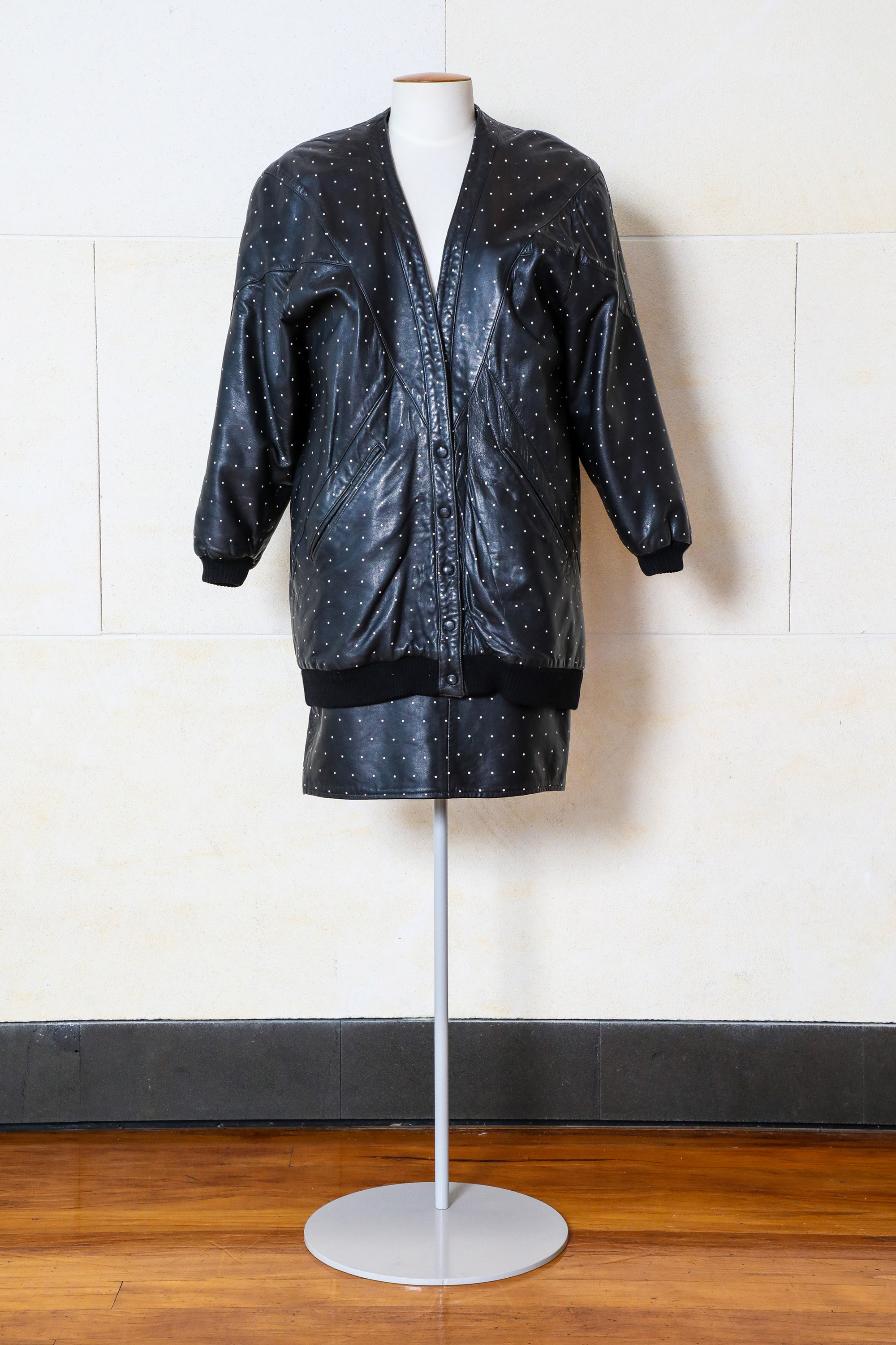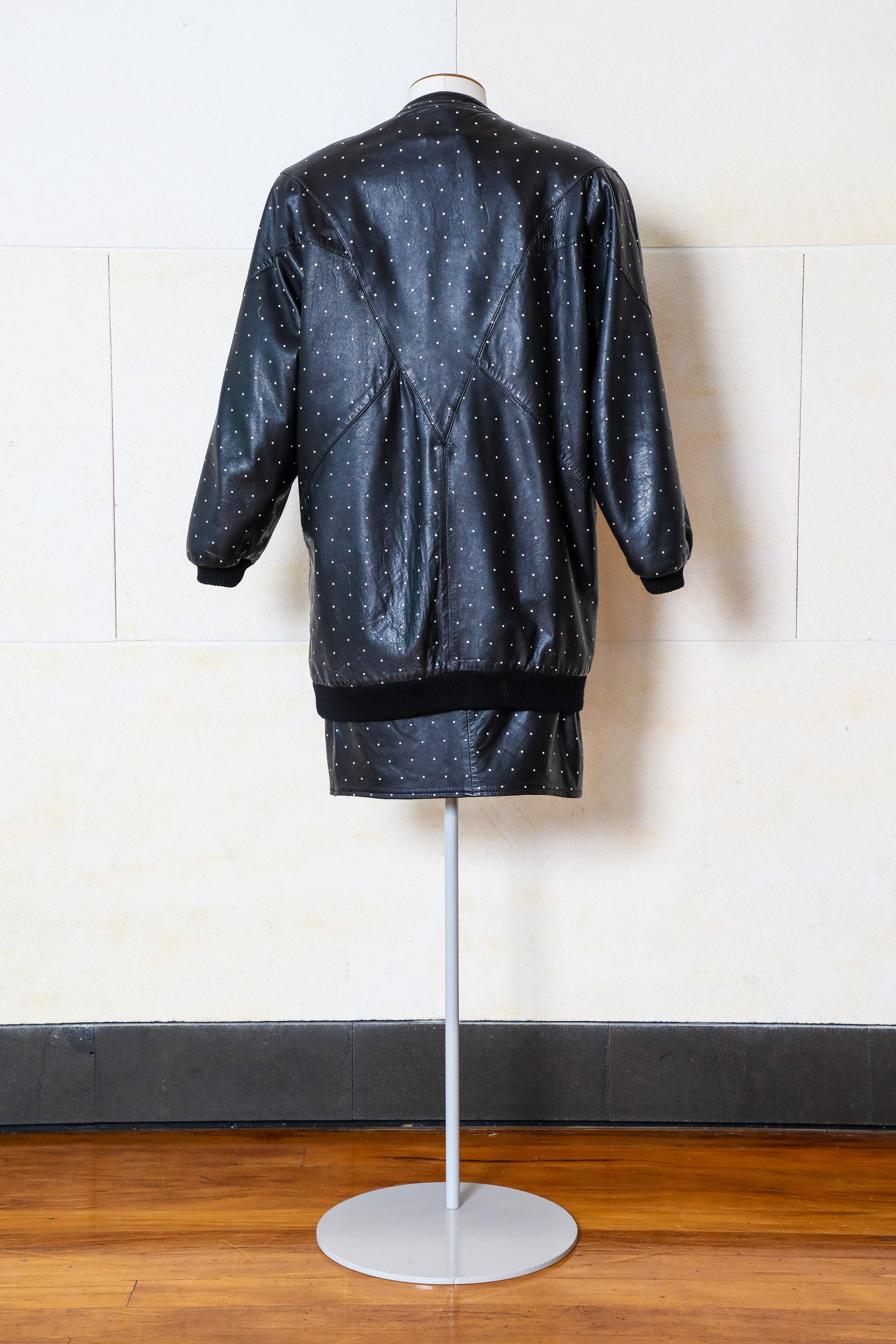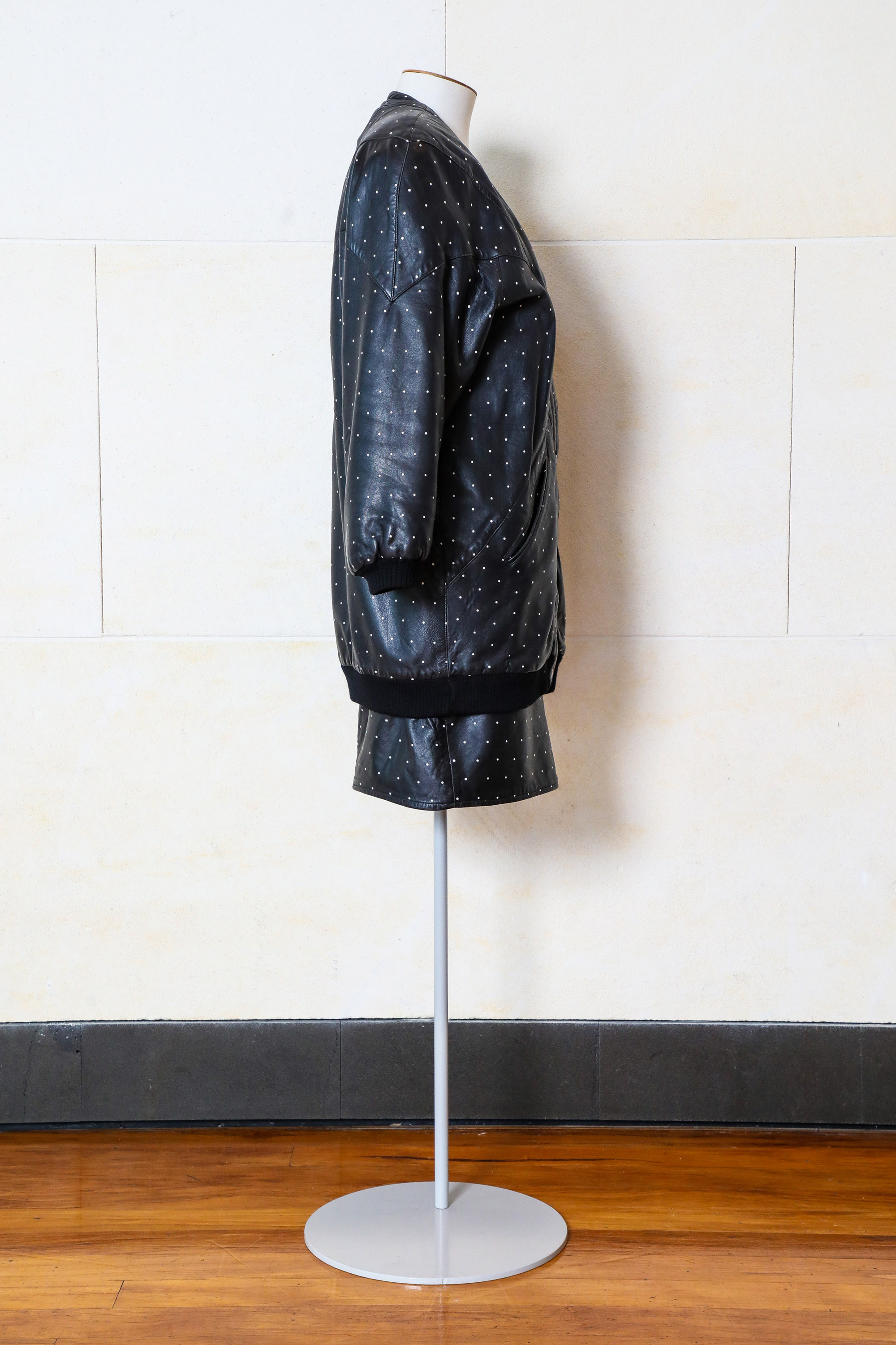 Leather jacket & skirt with screen-printed dots