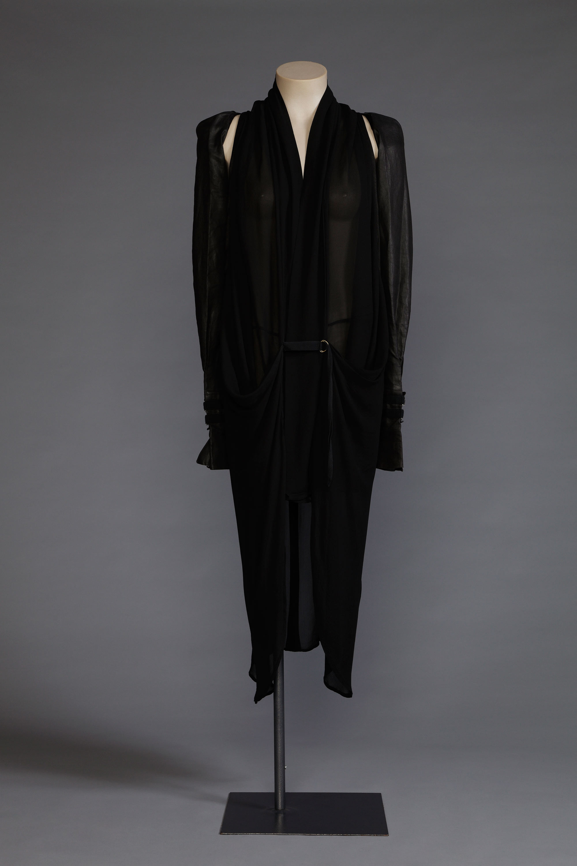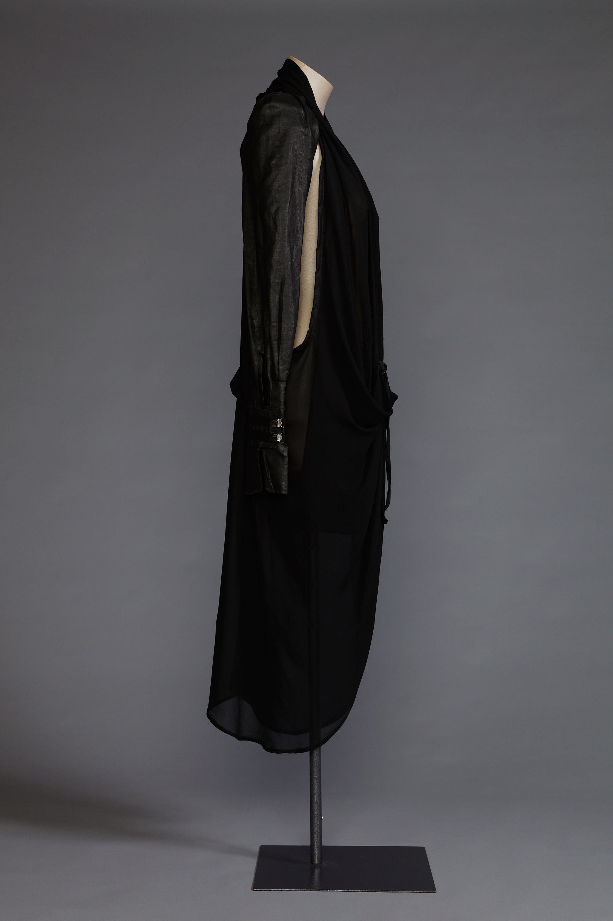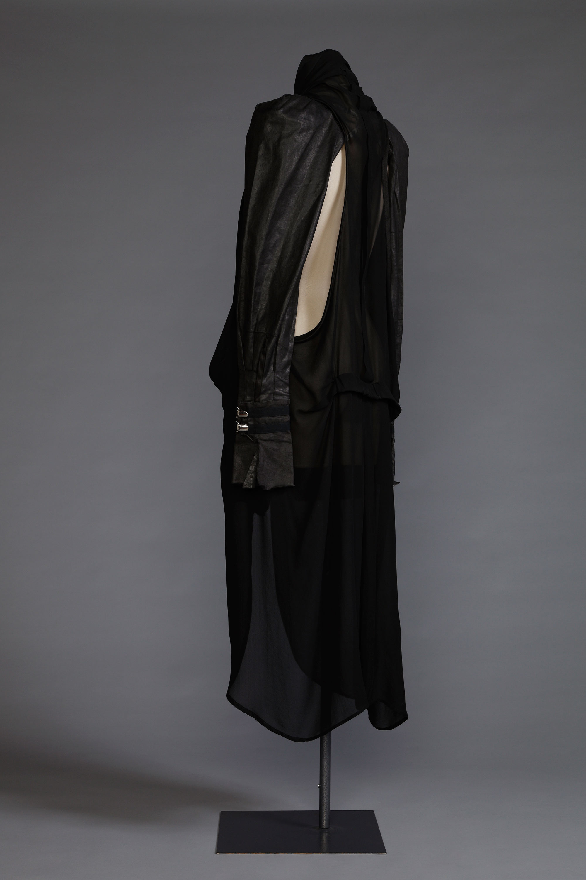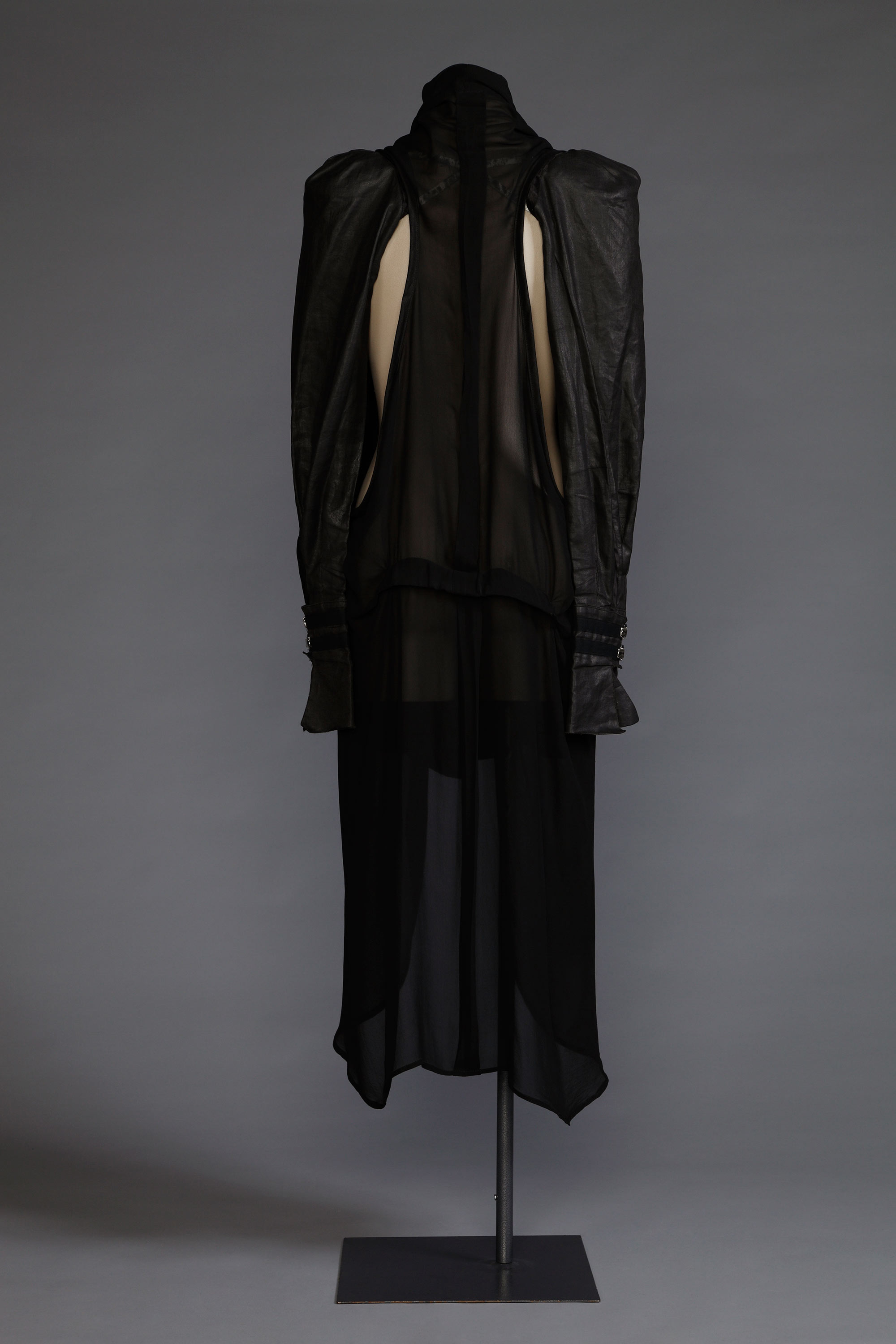 The vest was made in 2005, before she established her label, and she describes the process as “when I first discovered the magic of silk.” The soft, flowing, semi- transparent fabric contrasts with the solidity of the resin coated sleeves, which were influenced by Victorian era fashions, and were made the following year.