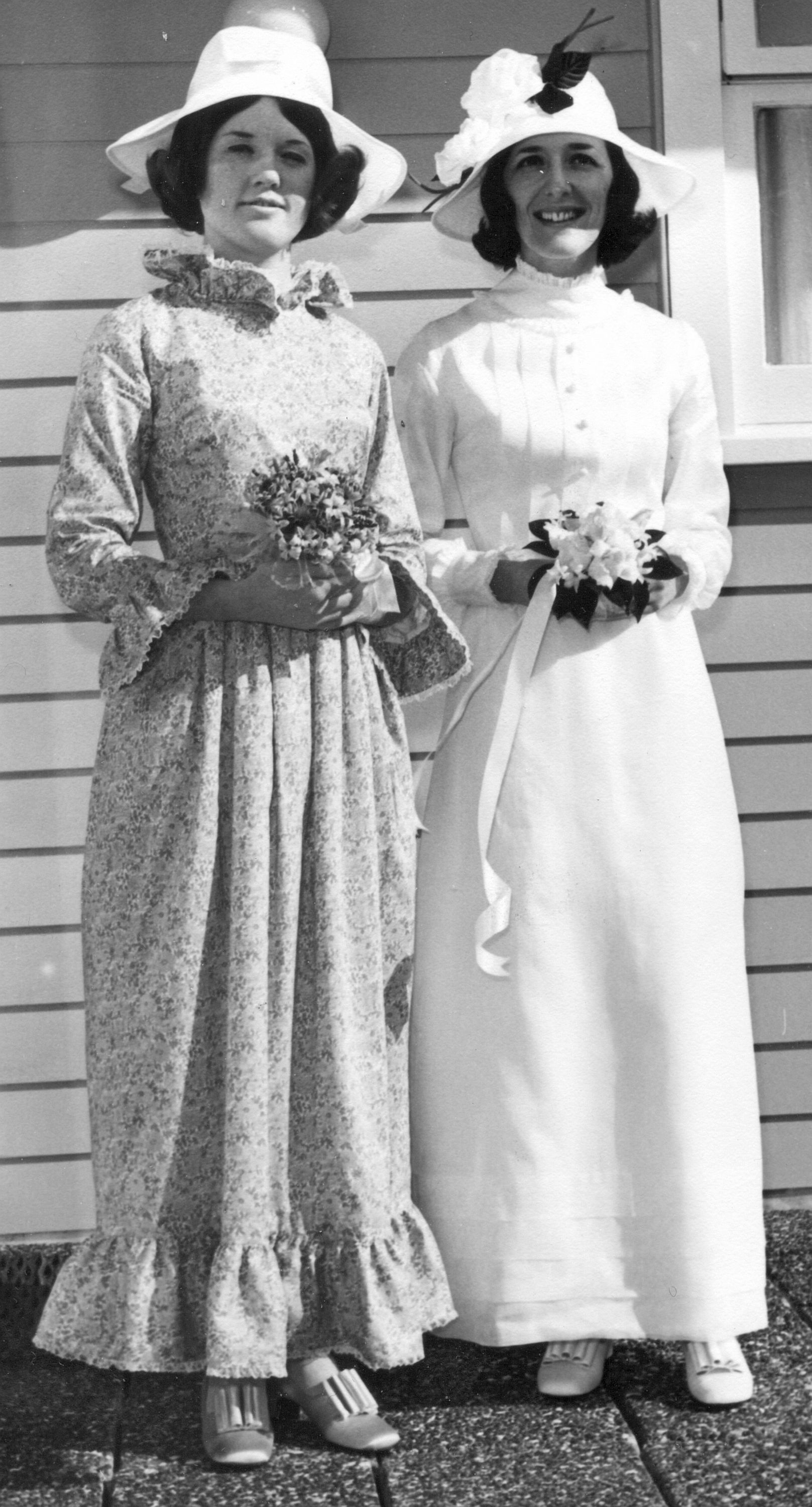 This bridesmaid dress was made from pink and mauve Liberty lawn by Isabel Haworth of Hadny 5 in 1968. It was worn for the wedding of Cecilie Neill (now Geary) who wore a white organdy wedding dress also by Hadny 5. The hats were made by Kay Marie Millinery in Vulcan Lane. The fabric-covered shoes, made to order by David Elman, came from John Greer, also in Vulcan Lane.