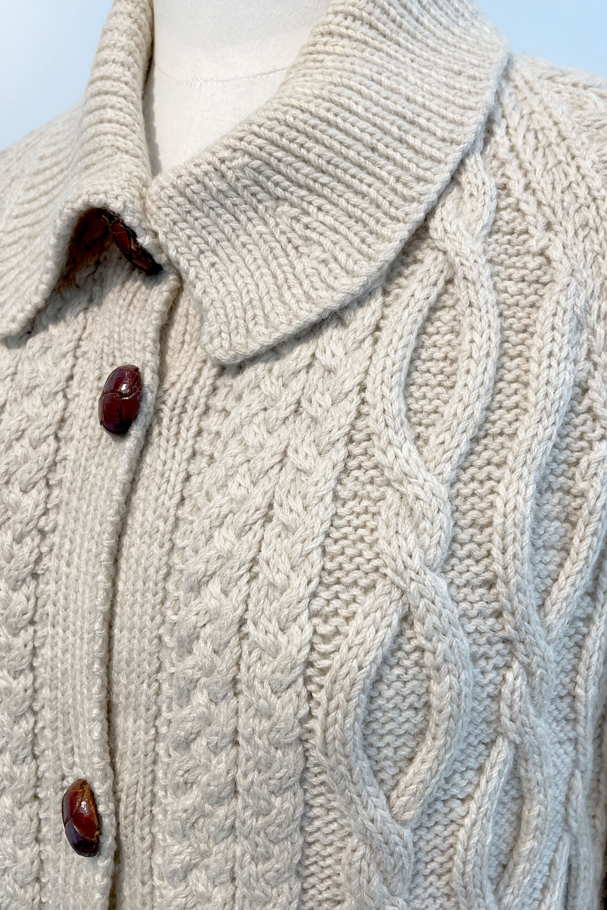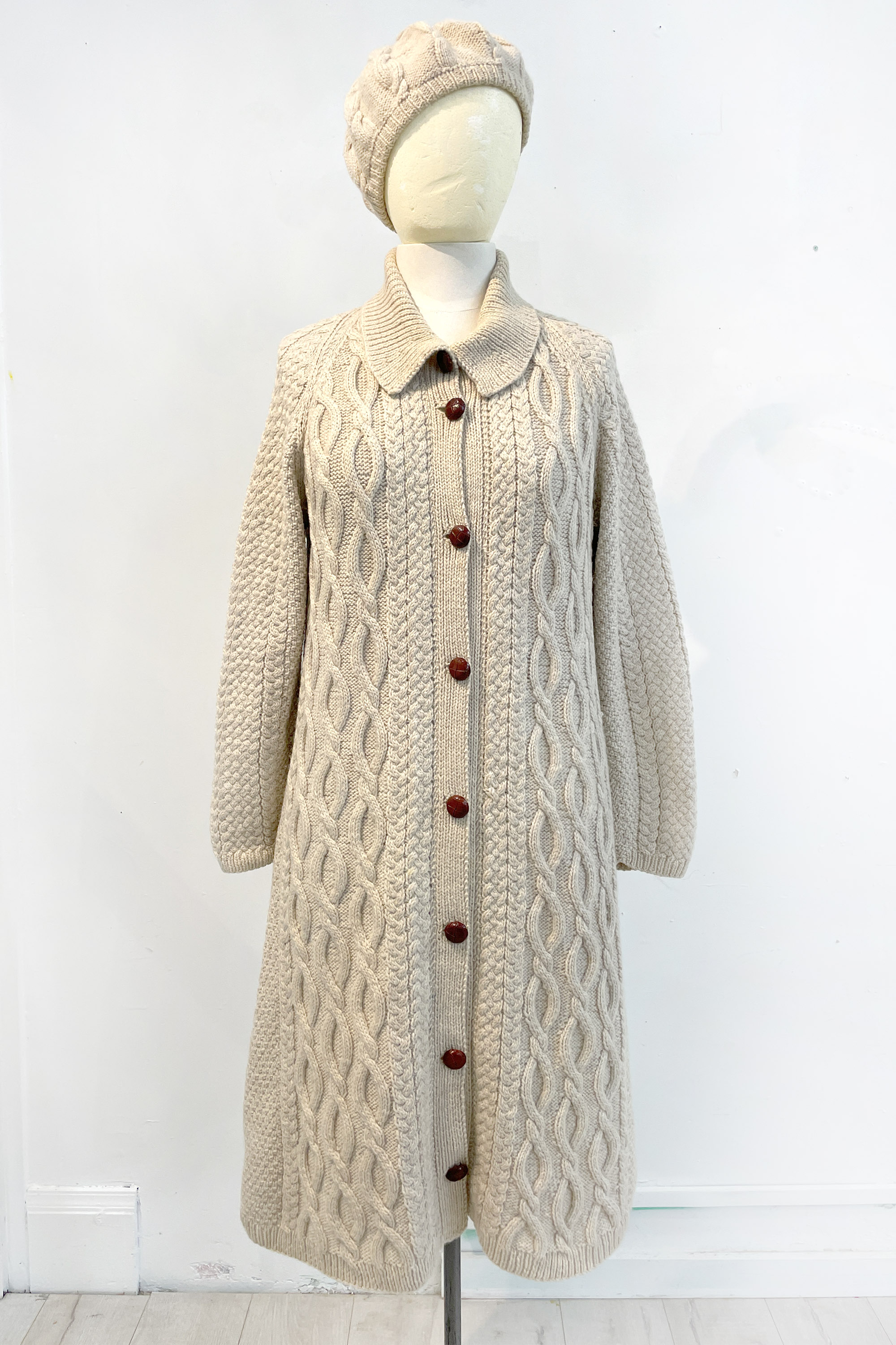 The coat was gifted to my mother by her own mother to take on her "big OE" spanning 2 years, including visiting U.S.A, working in the U.K. and touring in a VW Combi through Europe with my father. Mother made the hat in the same year to match the coat. The coat was admired by American knitters. While in Madrid when my mother was attempting to cross a road, she felt a tug from behind and noticed a woman holding onto her coat. Once across the road the woman stopped mum and with little English language, she wanted to know where it was from and all about it. Mum also remembers wearing the coat to Church of England services in the U.K. It was so cold in Europe and England at that time that she also wore it as a dressing gown while travelling. Many years later the hat and coat were given to me, because when mother got older, she found the coat too heavy to wear. It has become a precious family heirloom that gets an outing every winter and is now 54 years old.