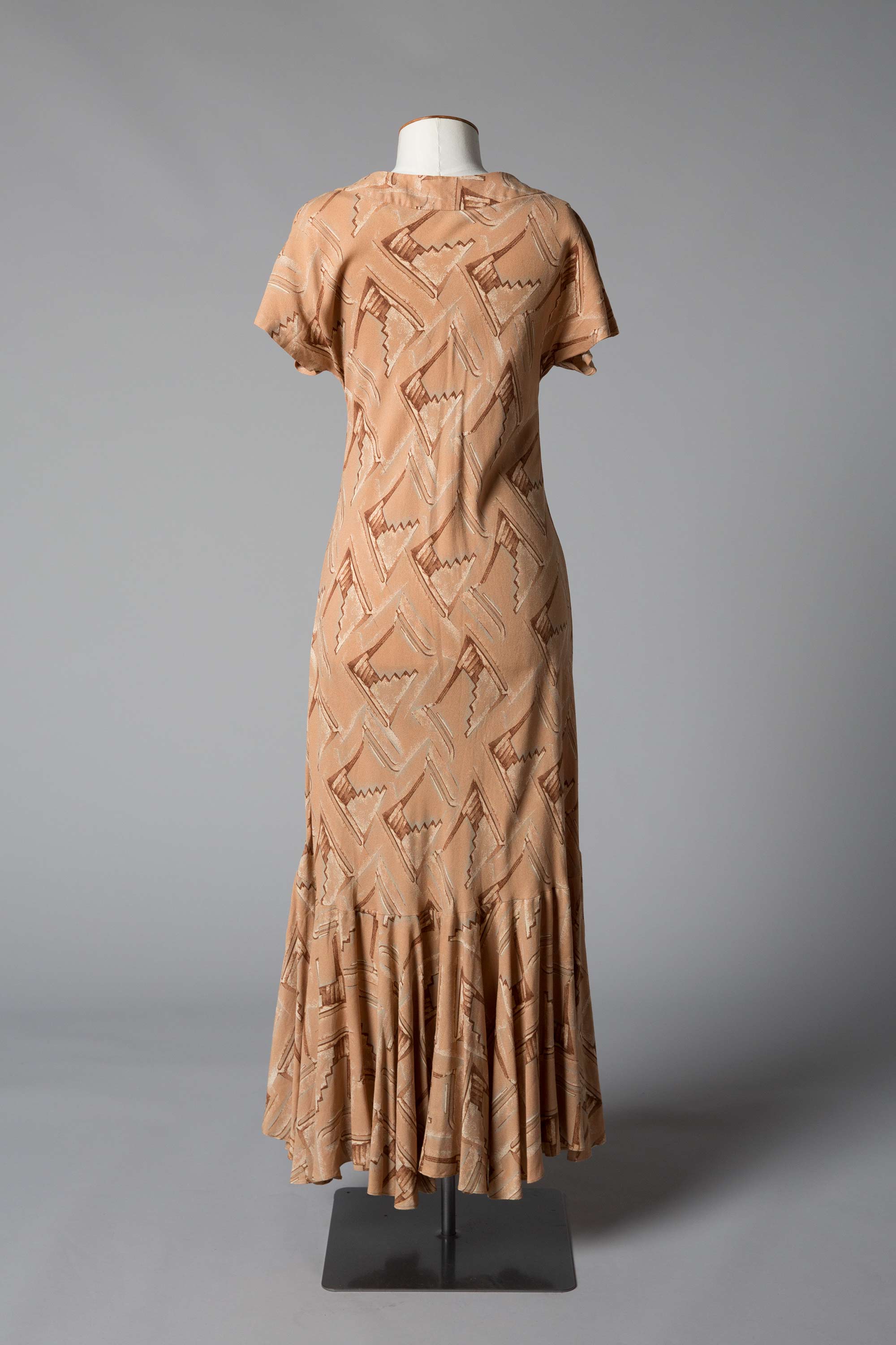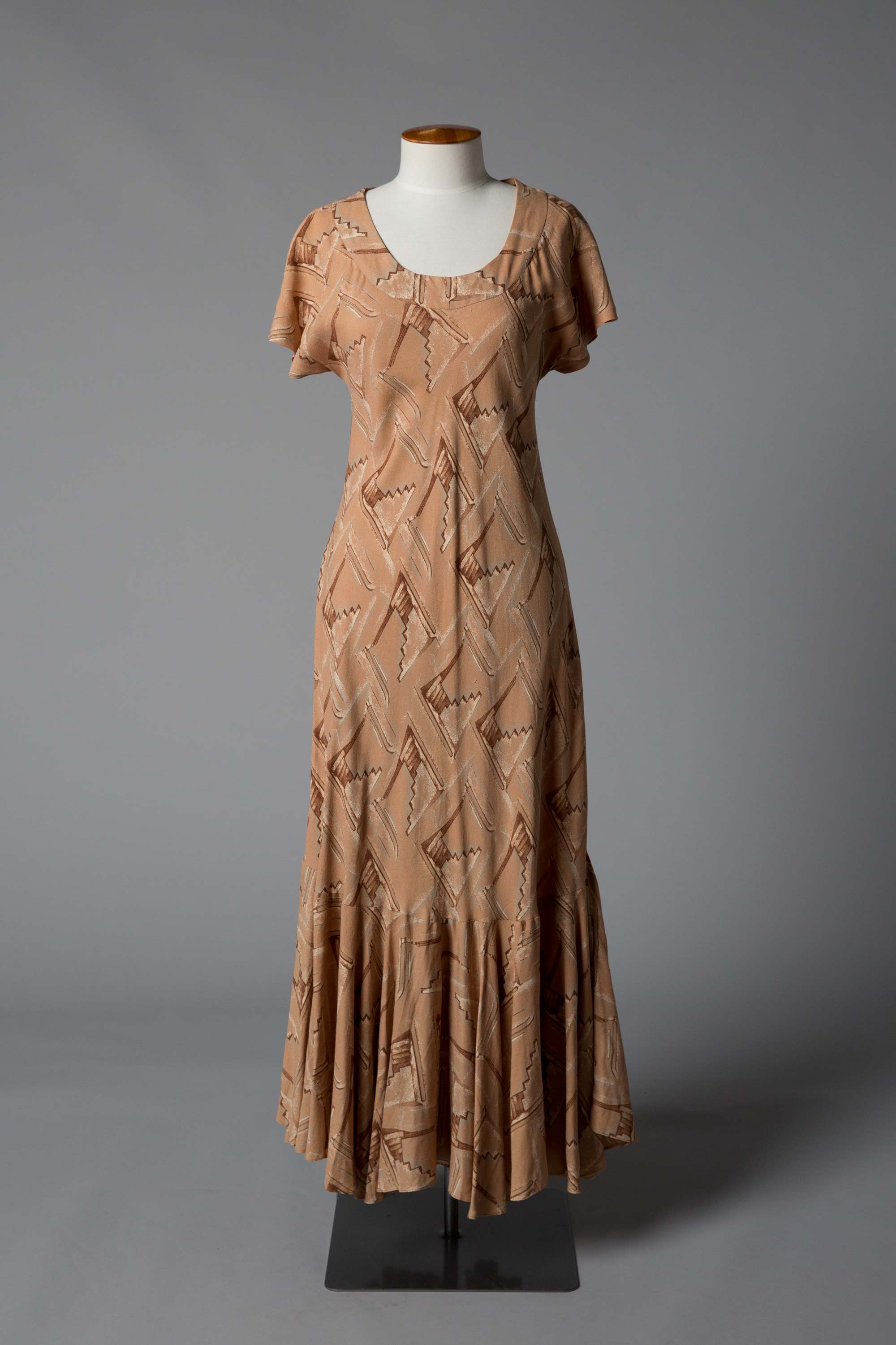 This bias cut dress has a cut-on sleeve and a flounce hem.
