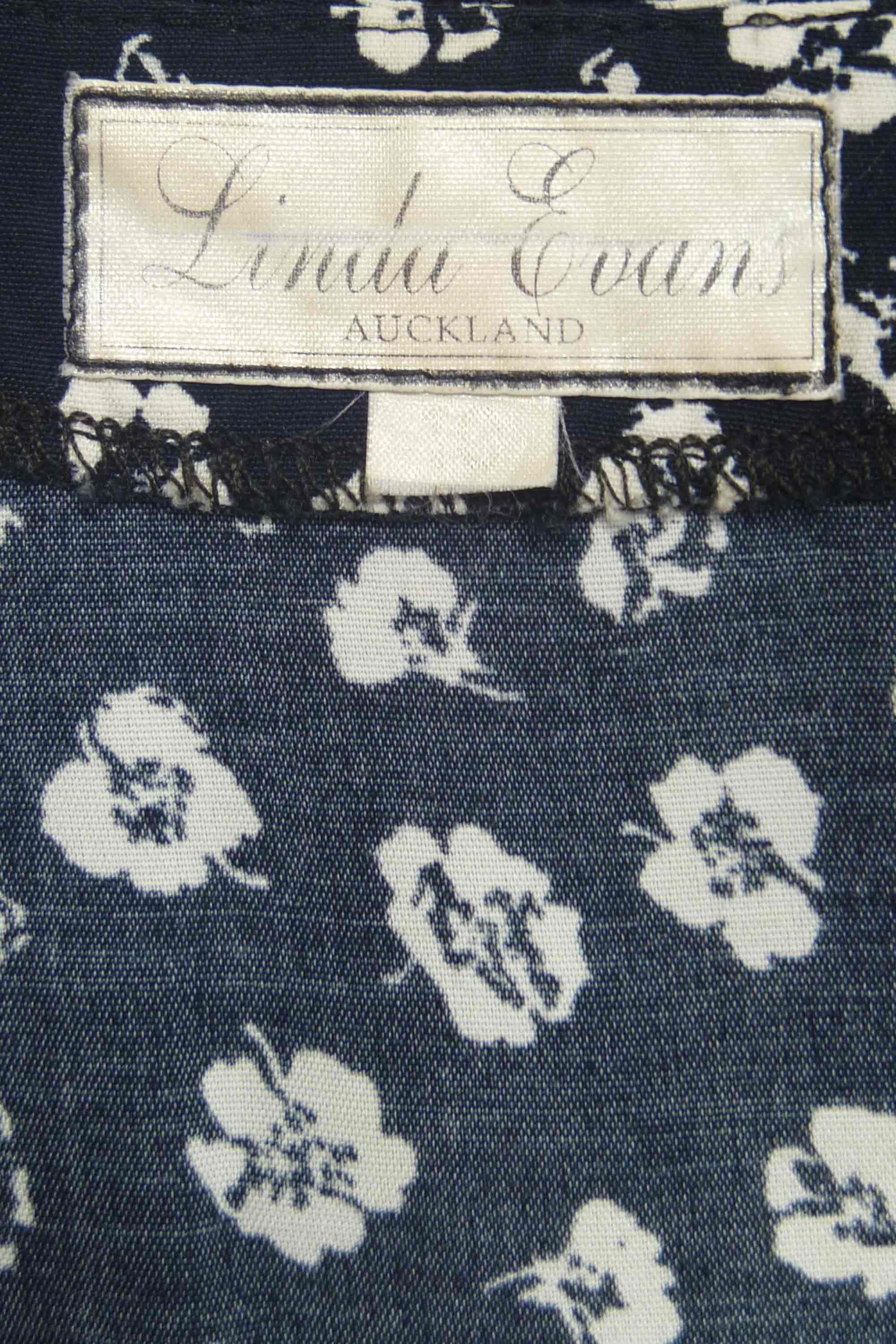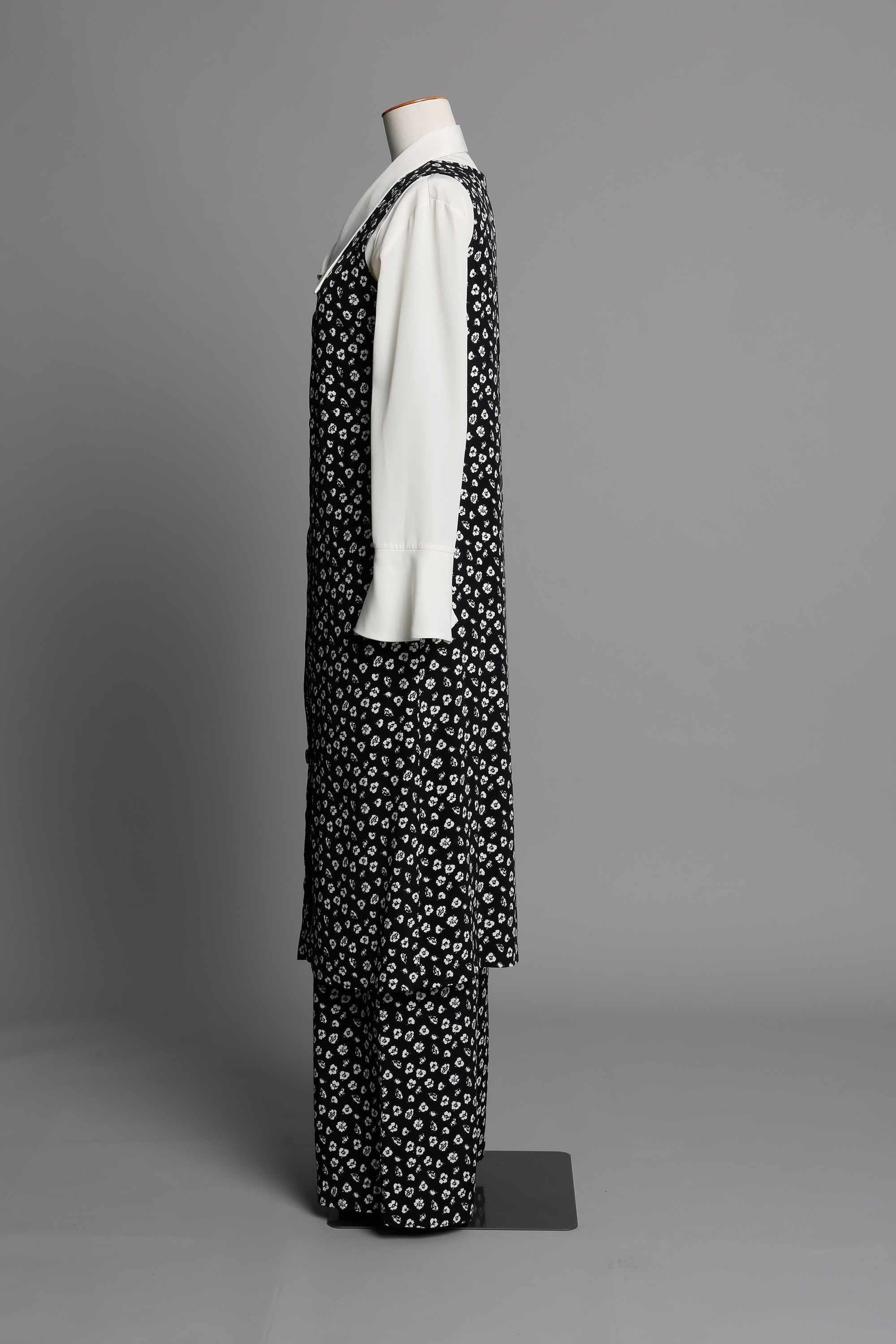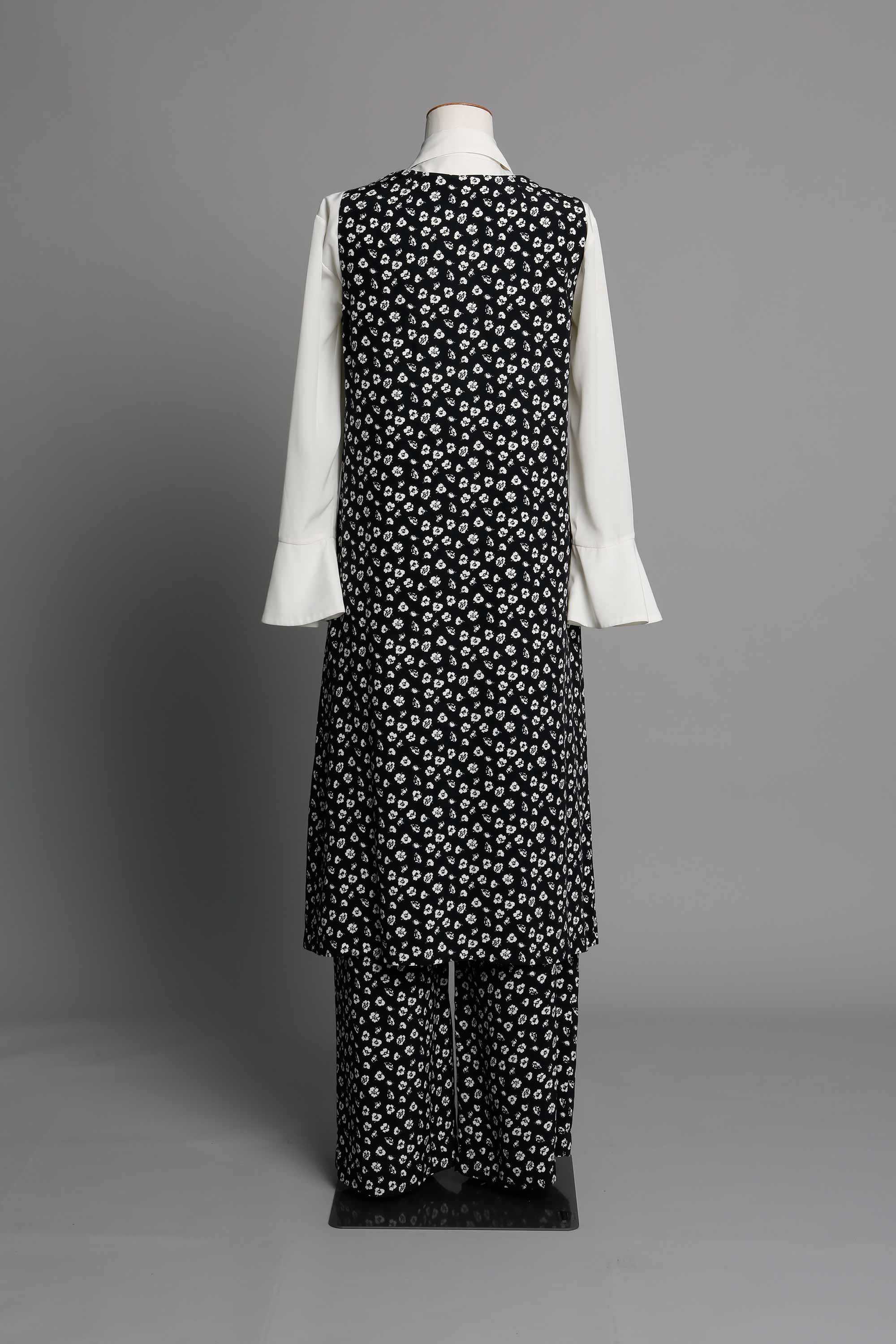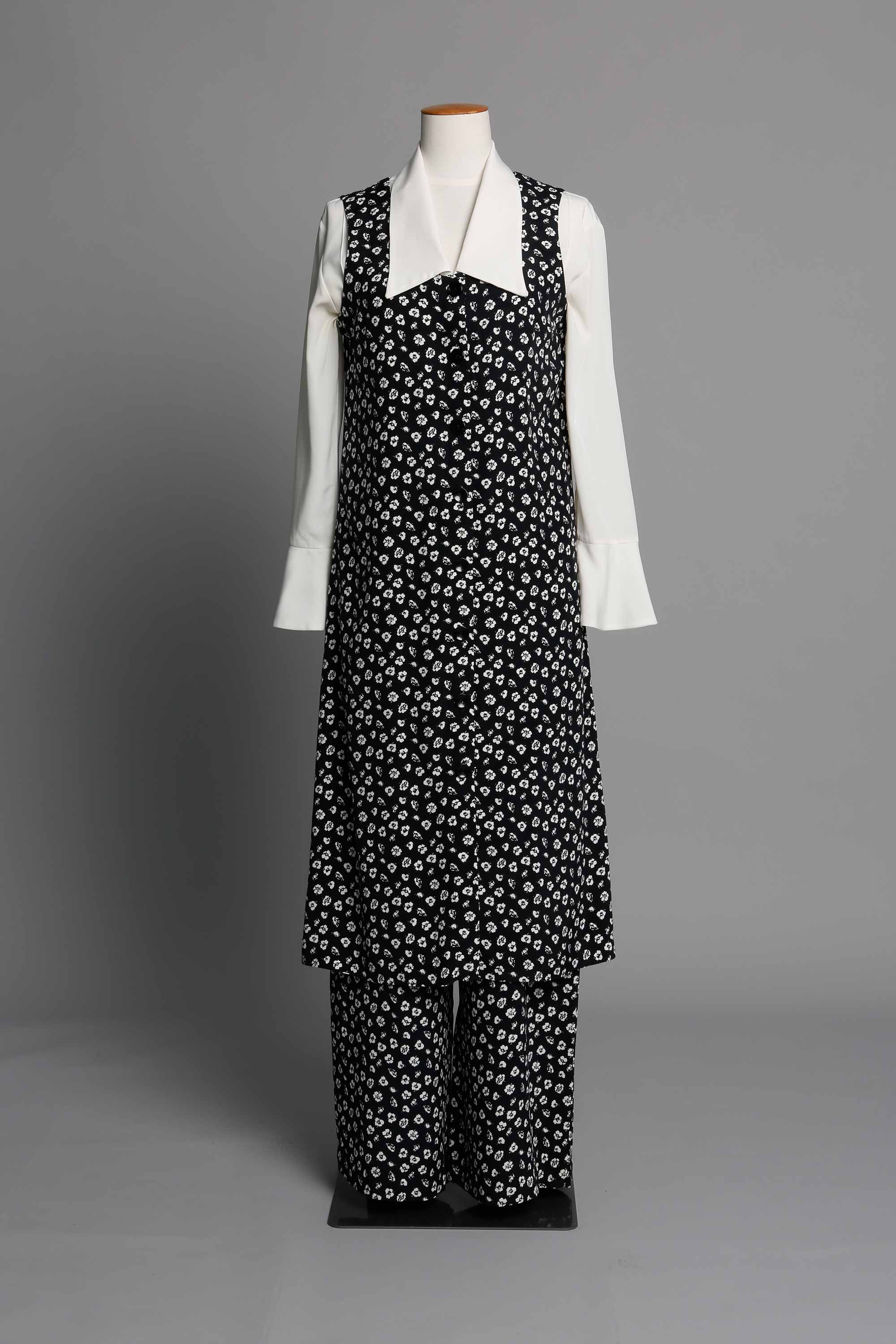 In the early 1990s there were several seasons that were influenced by the 1970s. Slim tops and flared trousers worn with extra high wedged shoes were prevalent. Collars and cuffs were also emphasised at this time. Tunic length was also becoming popular. This outfit is part of a range designed by Linda Evans to sell at fashion parades in people's homes. There were also versions in plain black, apple green and butter lemon. Linda made white blouses with flounced collars and cuffs to be worn with them and a patchwork shirt combining all the colours and prints.