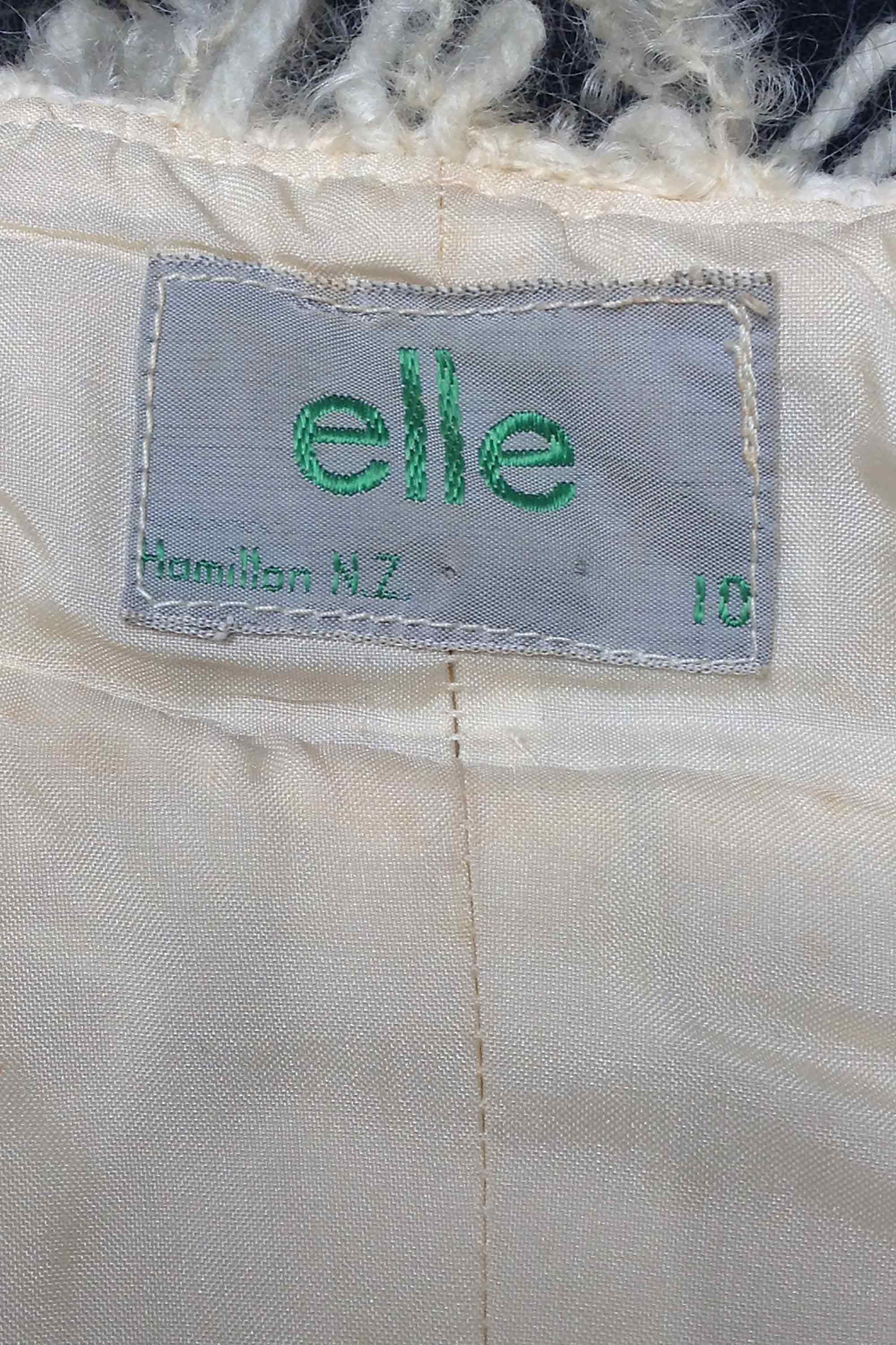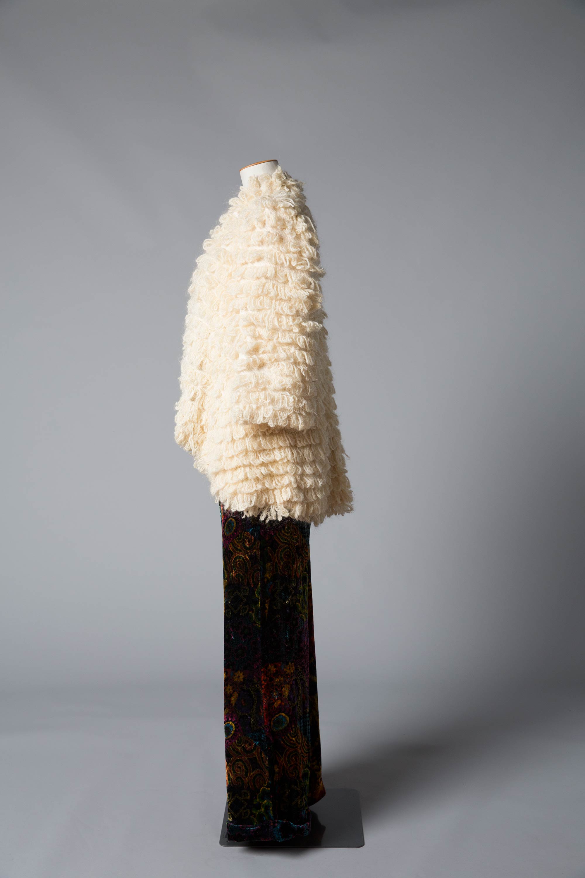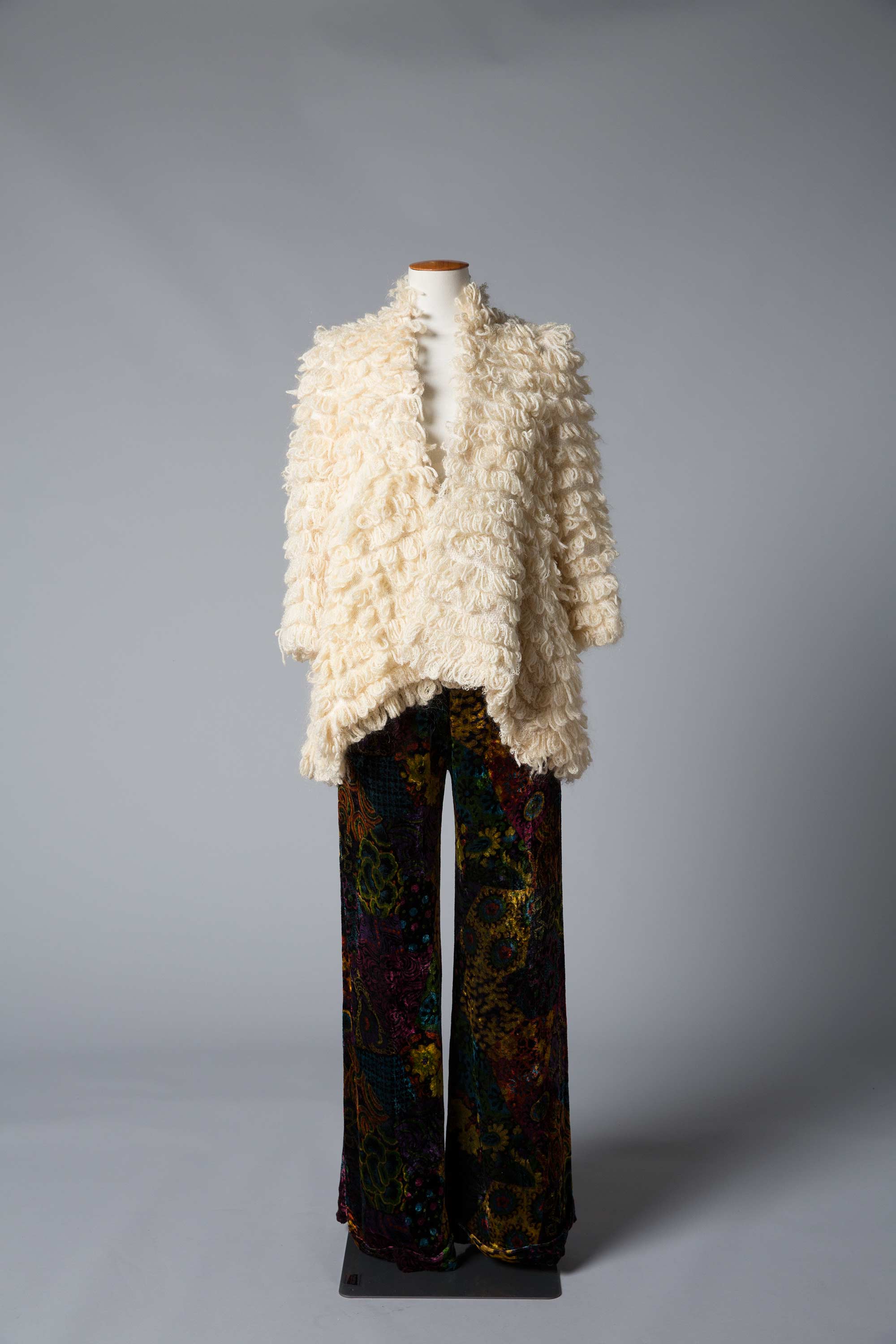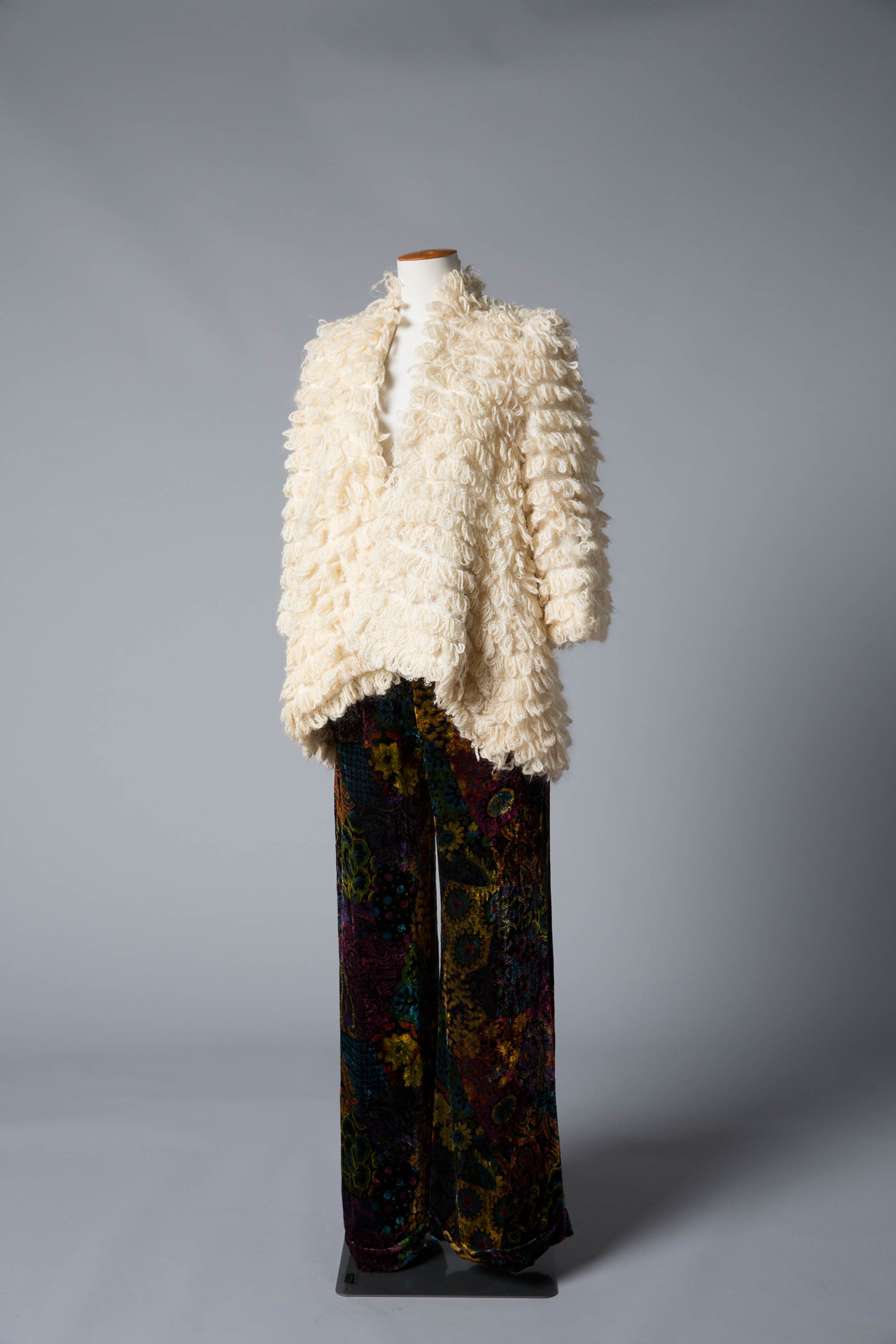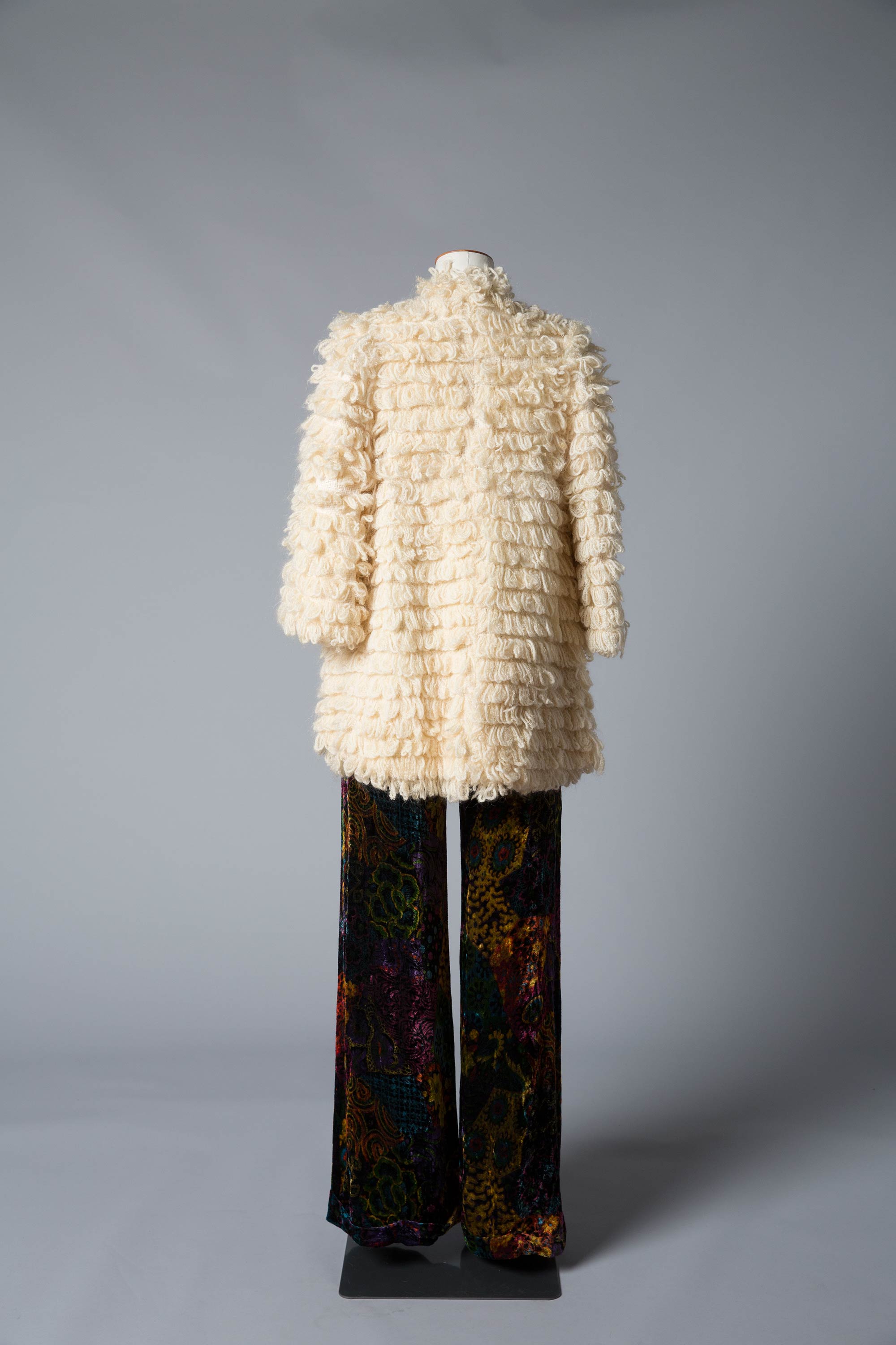 Wendy Ganley made this jacket in about 1970 before her daughter Aleida was born. "The inspiration was a hankering for a fur coat which was a nice idea but not realistic. This was the substitute." The coat was made by a weaver from Hamilton. She and her husband were pensioners who had returned to New Zealand several weeks too late to be eligible for the pension. She made this coat for Wendy, and also bags with woven bottoms. The wool was hand spun from natural sheep's wool and woven into loops. The loops were originally going to be cut, but when they got started, Wendy loved the loftly look. The shape was determined by the weaving constrictions. "I remember wearing it when I was pregnant. I must have looked like a bus – all out front with a full length jersey dress underneath." Wendy recalls that the fabric for the pants was "a bit out there for that time".