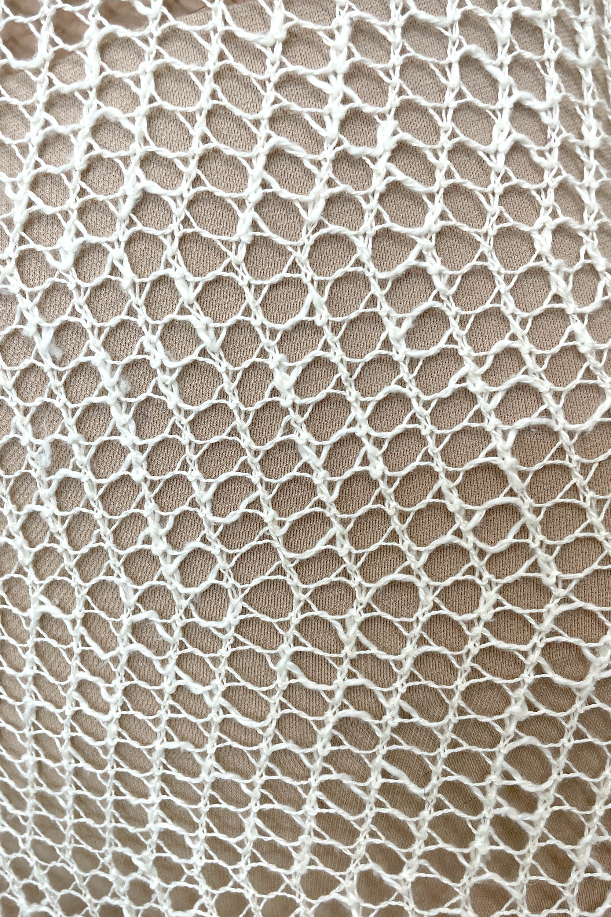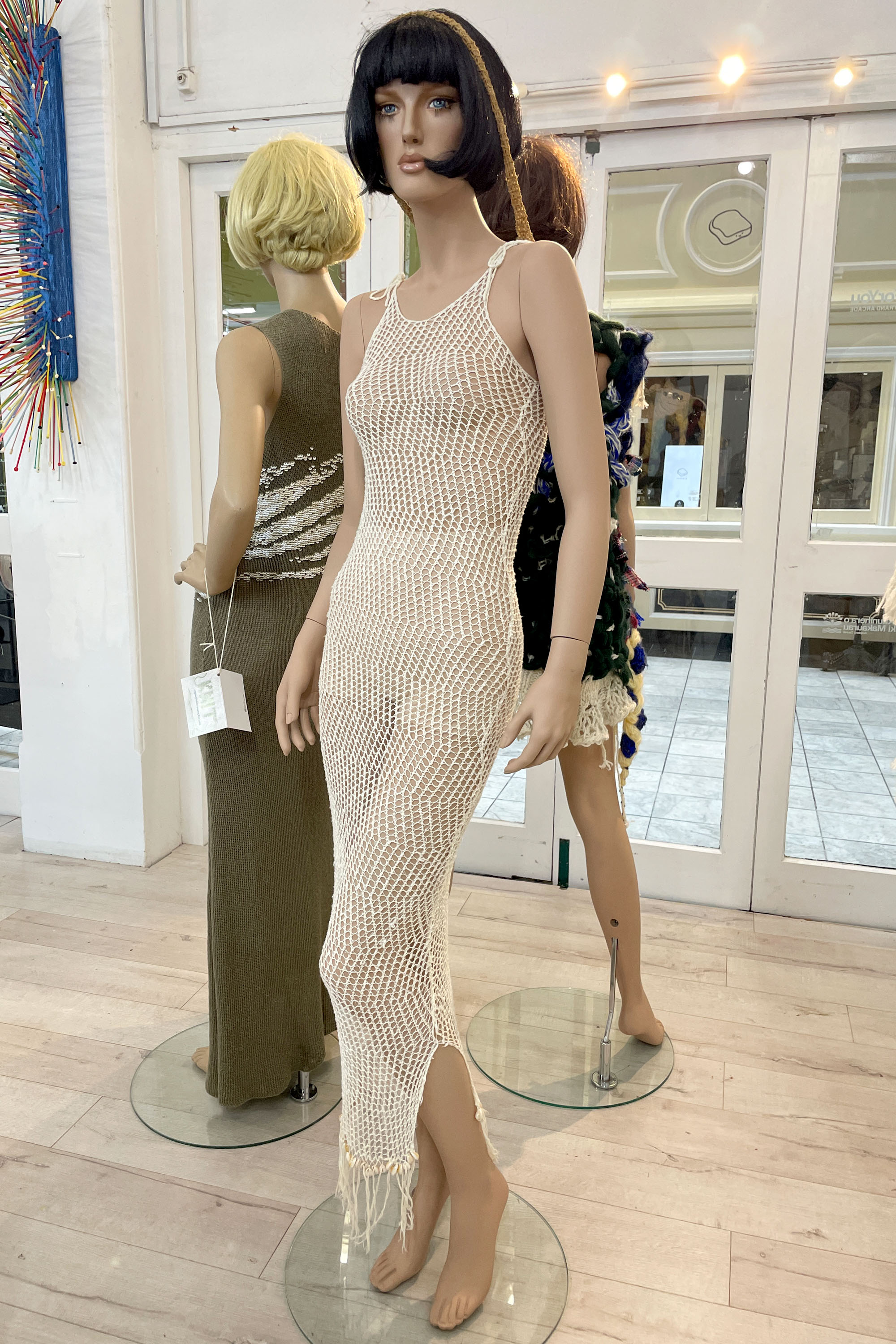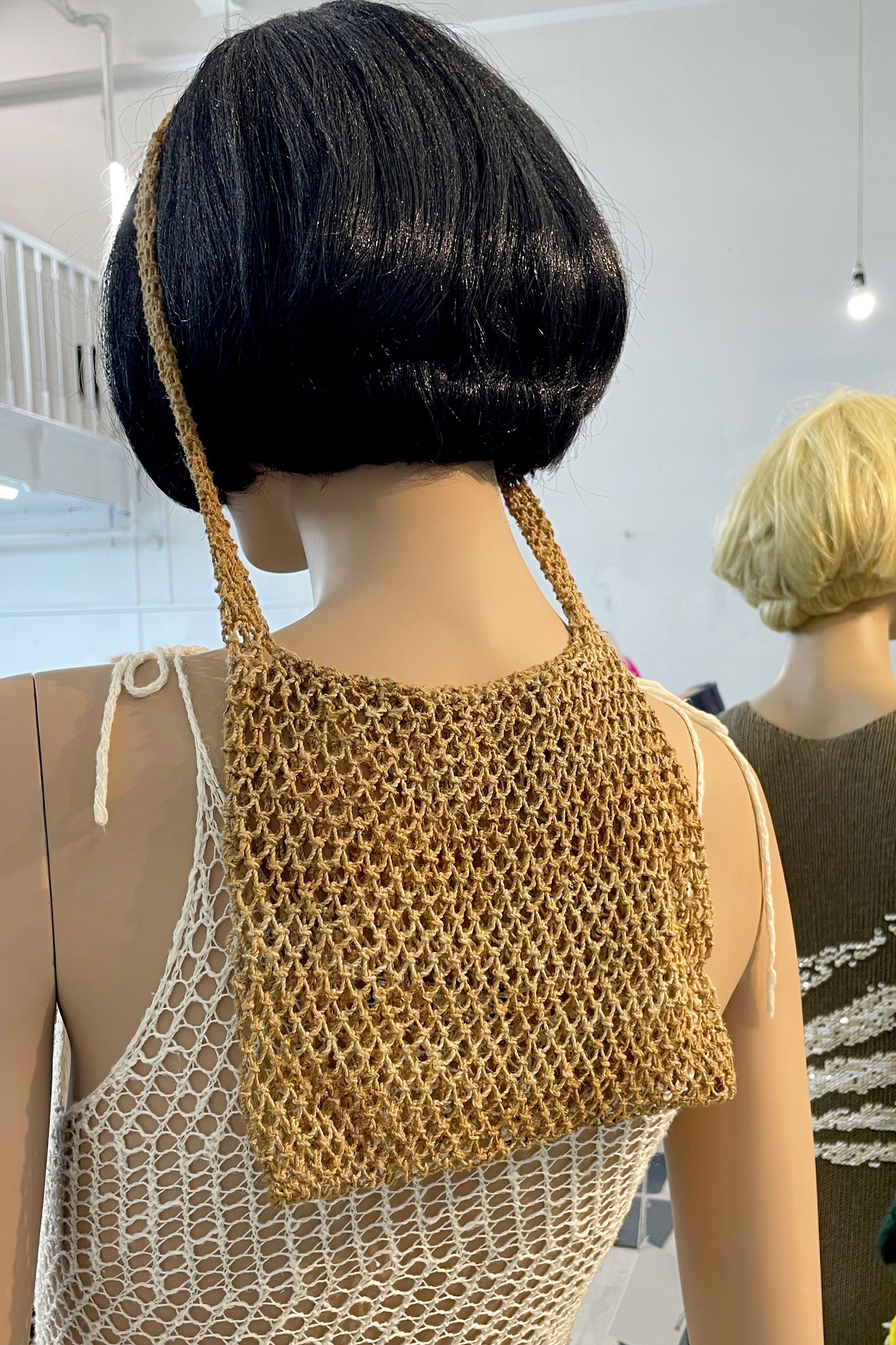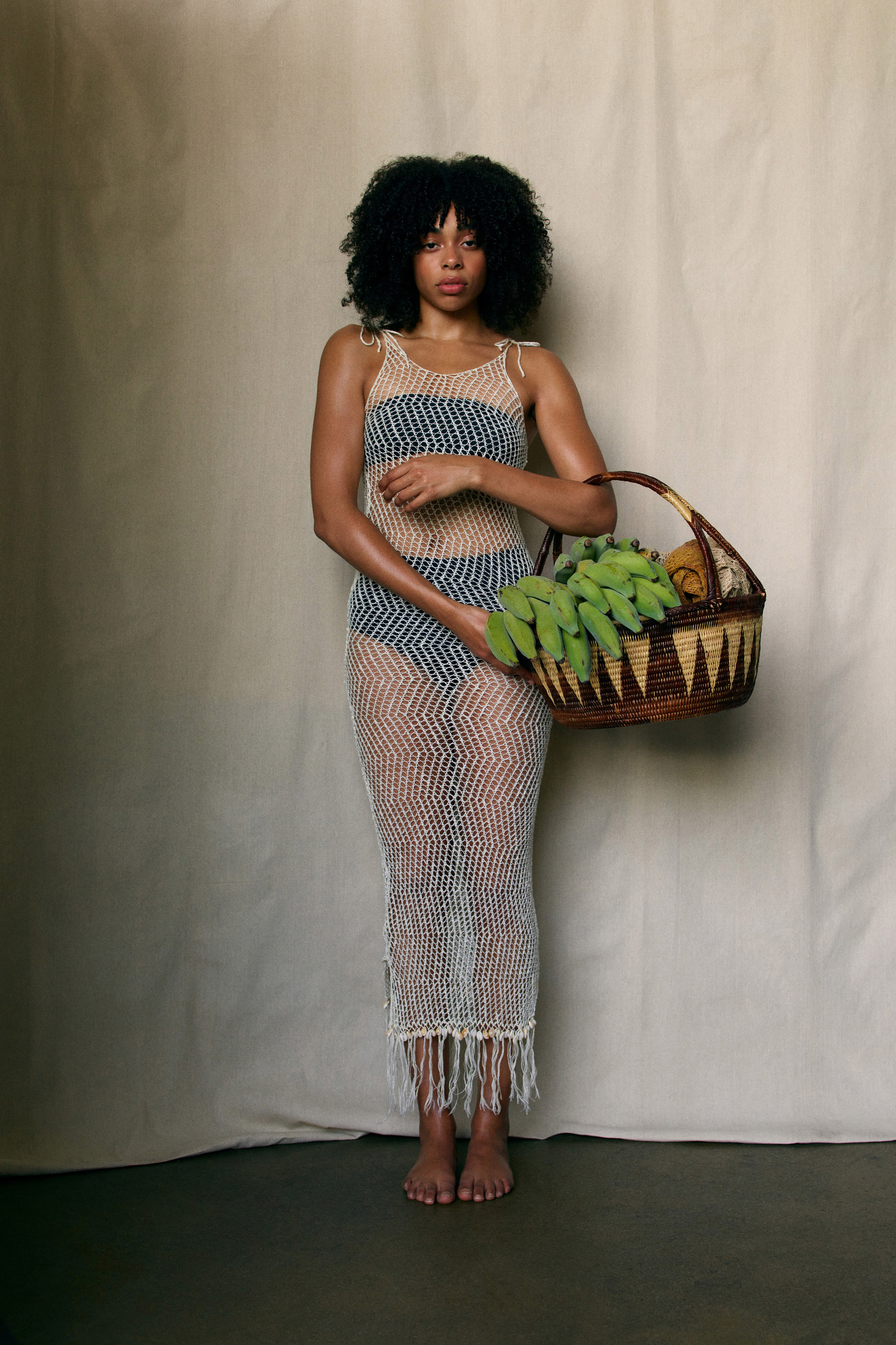 The Nirut Lace Dress is rendered in a linen and cotton blended yarn with ties that fasten with ease over the shoulders. The dress is finished in the hem with tassels and cowrie shells. The lace pattern is reminiscent of the geometric patterns of the woven hauswin and was inspired by the bilum loop technique that is from Papua New Guinea. Kurt Payne developed the lace knit pattern and brought the dress to life.