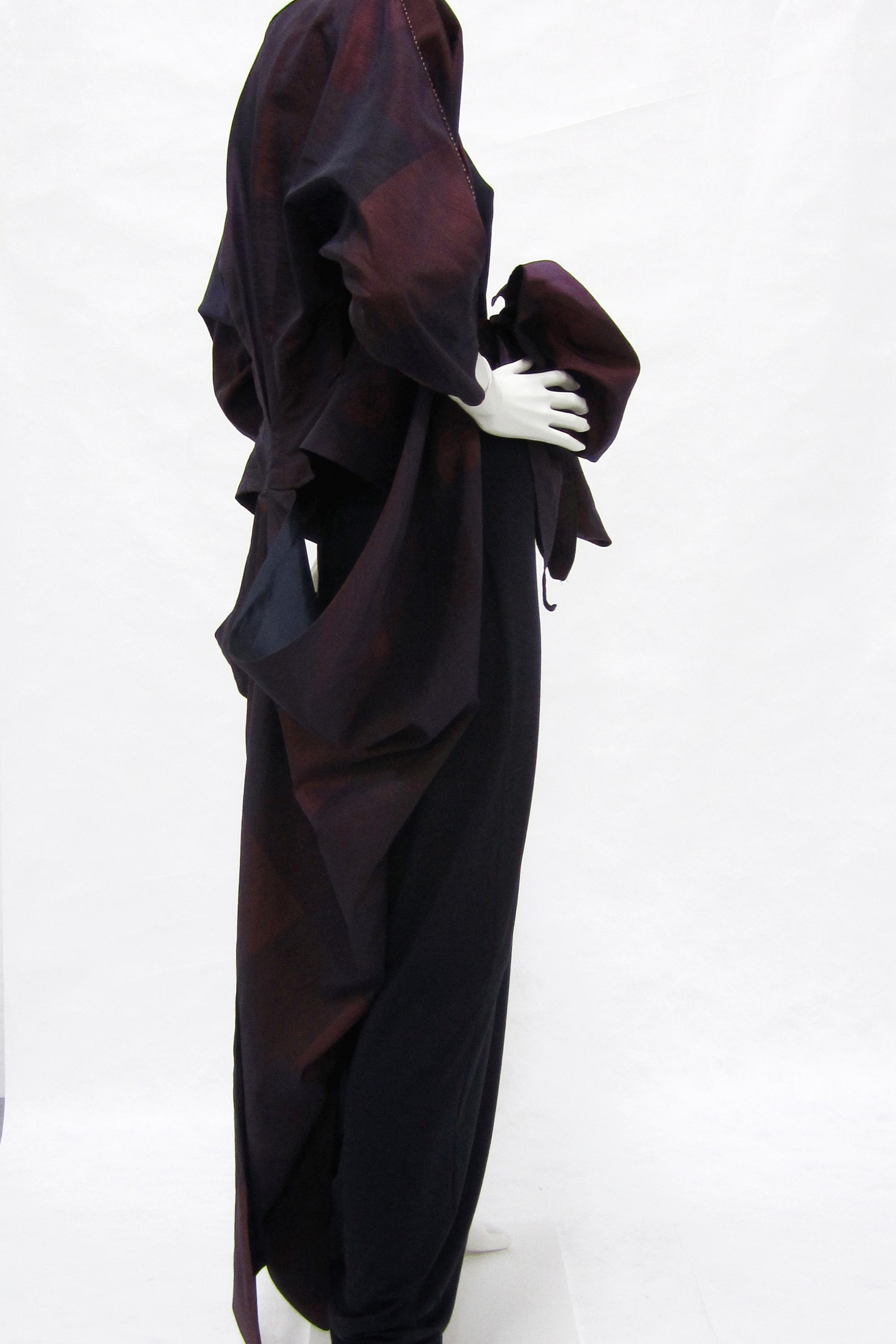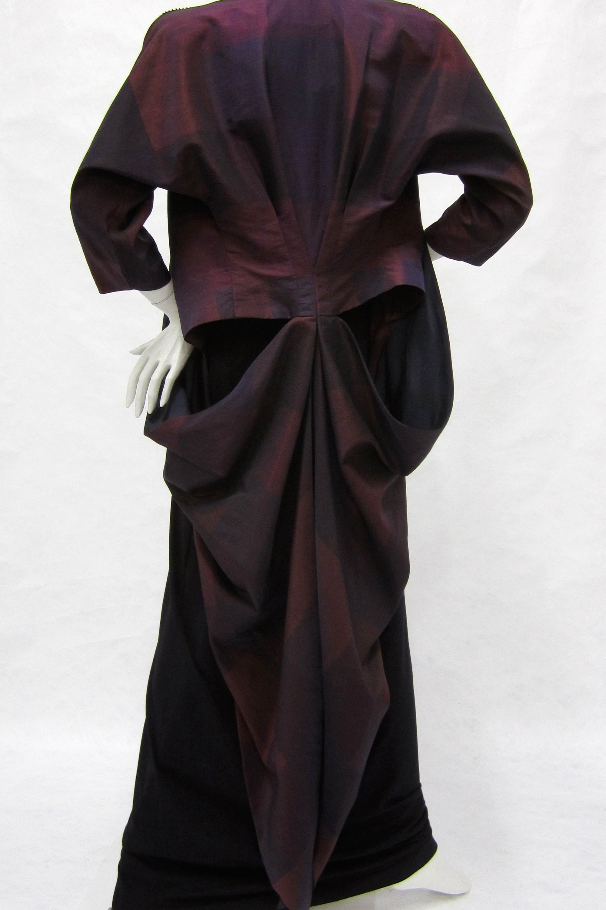 The dress was inspired by Donna Tulloch’s entry in the 1988 Benson & Hedges Fashion Design Awards and the music of Malcolm McLaren’s ‘Death of Butterfly’. This piece saw the beginning of a love for architectural draping which is still the trade mark of Mild Red today. Read more about the history of home sewing in the New Zealand Fashion Museum publication Home Sewn.
